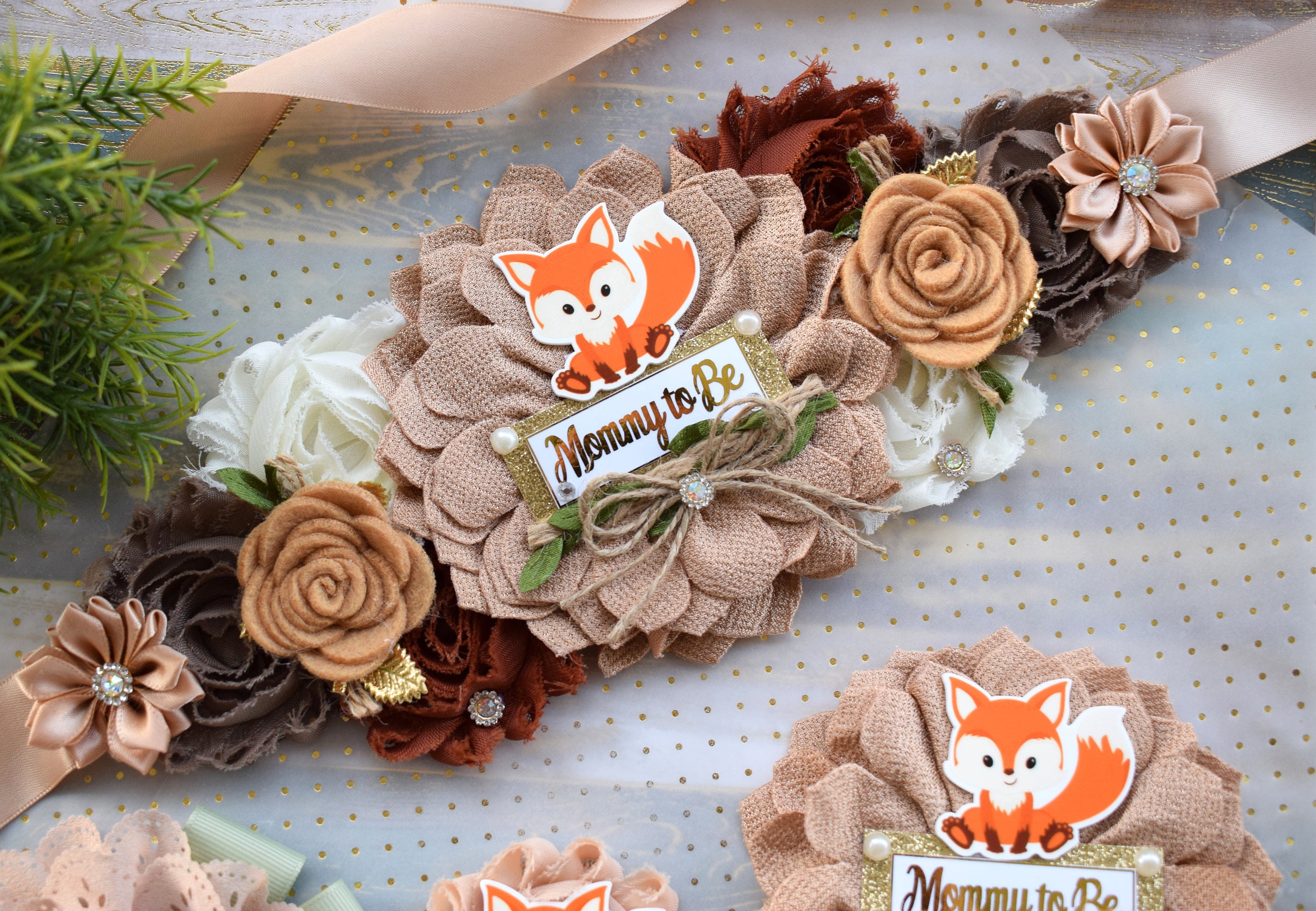 Boy Fox Woodland Baby Shower, Flower Fox Woodland Corsage Pin and Sash Set, Fox Corsage Pin, Woodland Flower Sash, Fox Shower, Woodland Pin