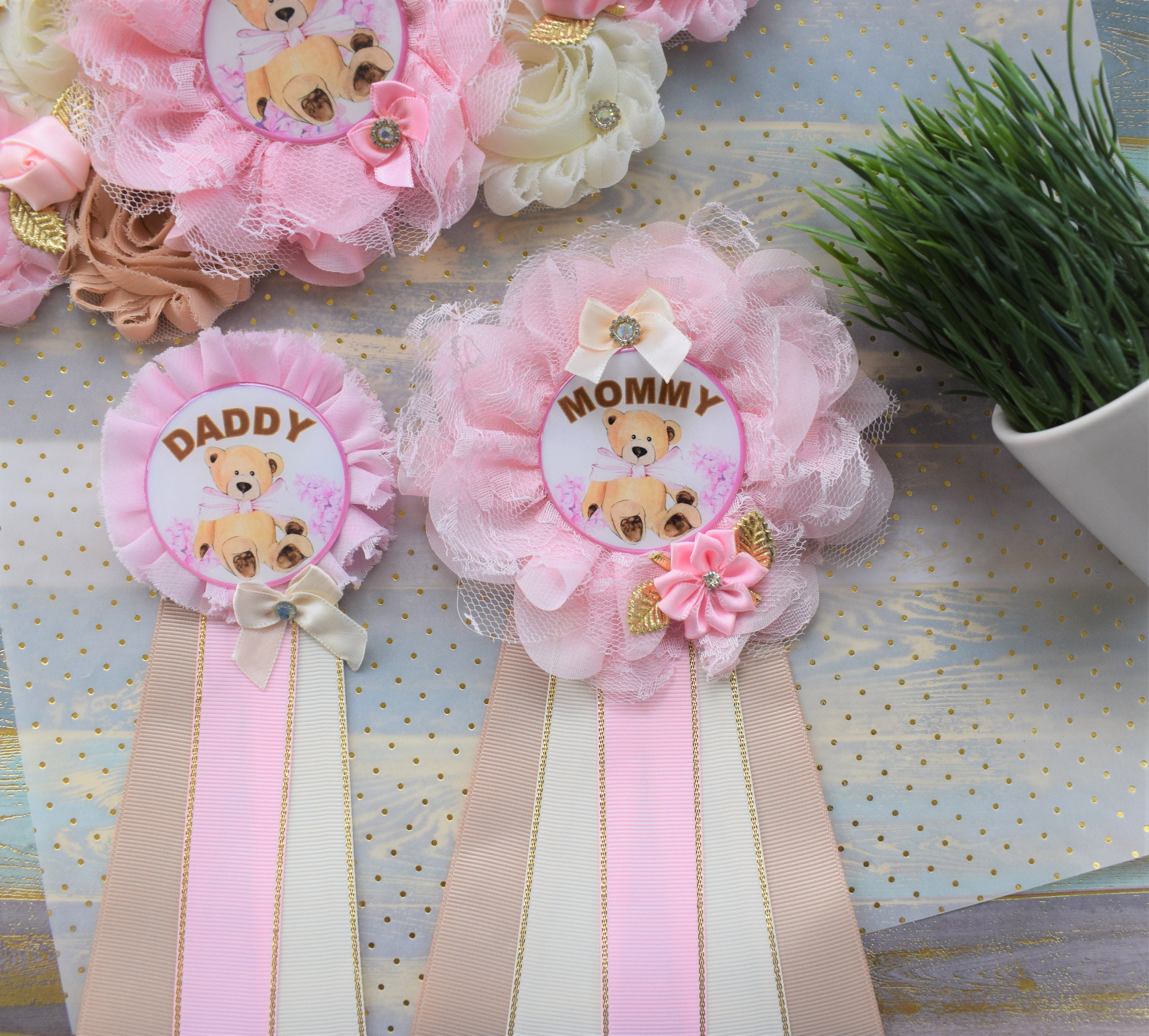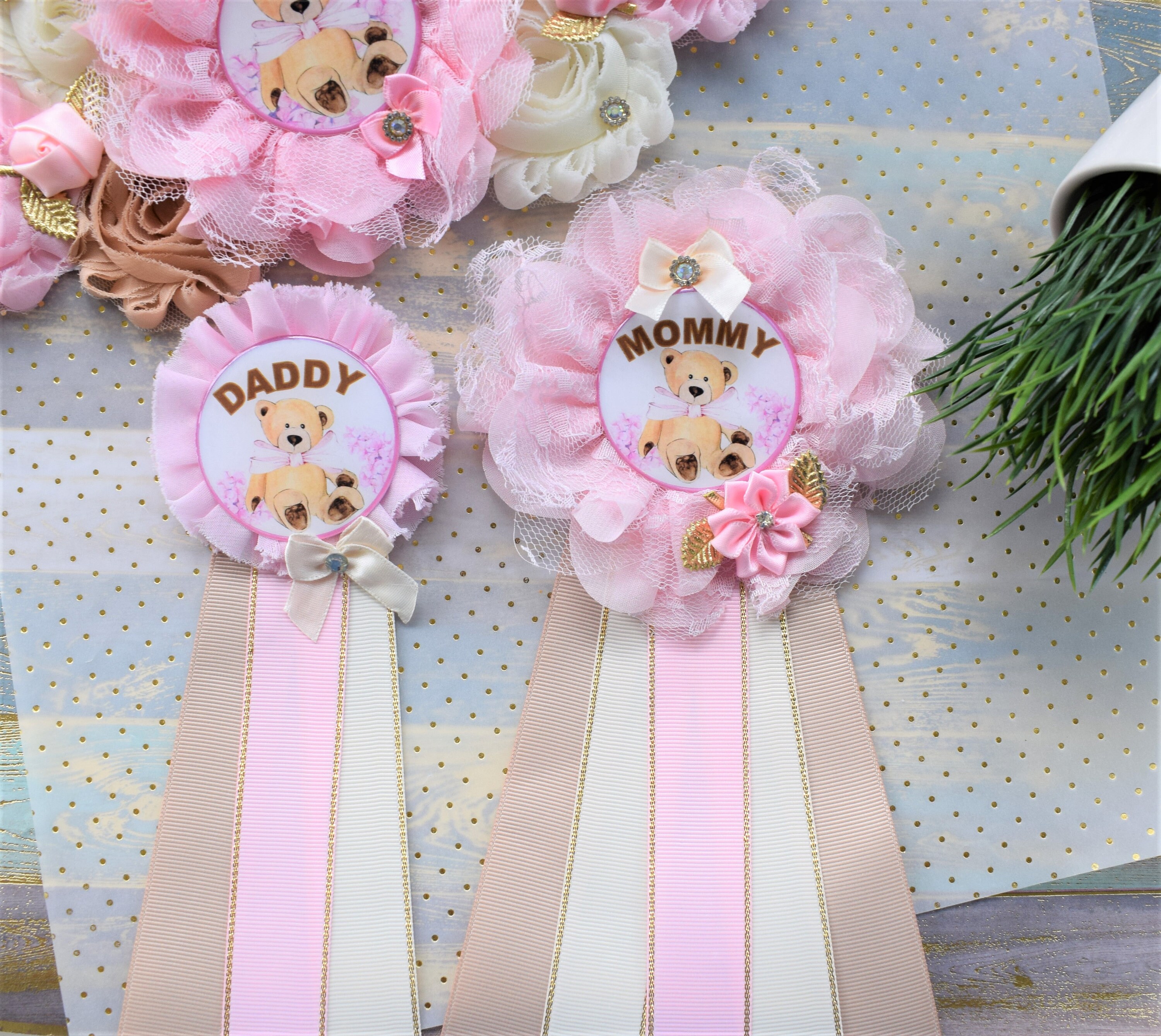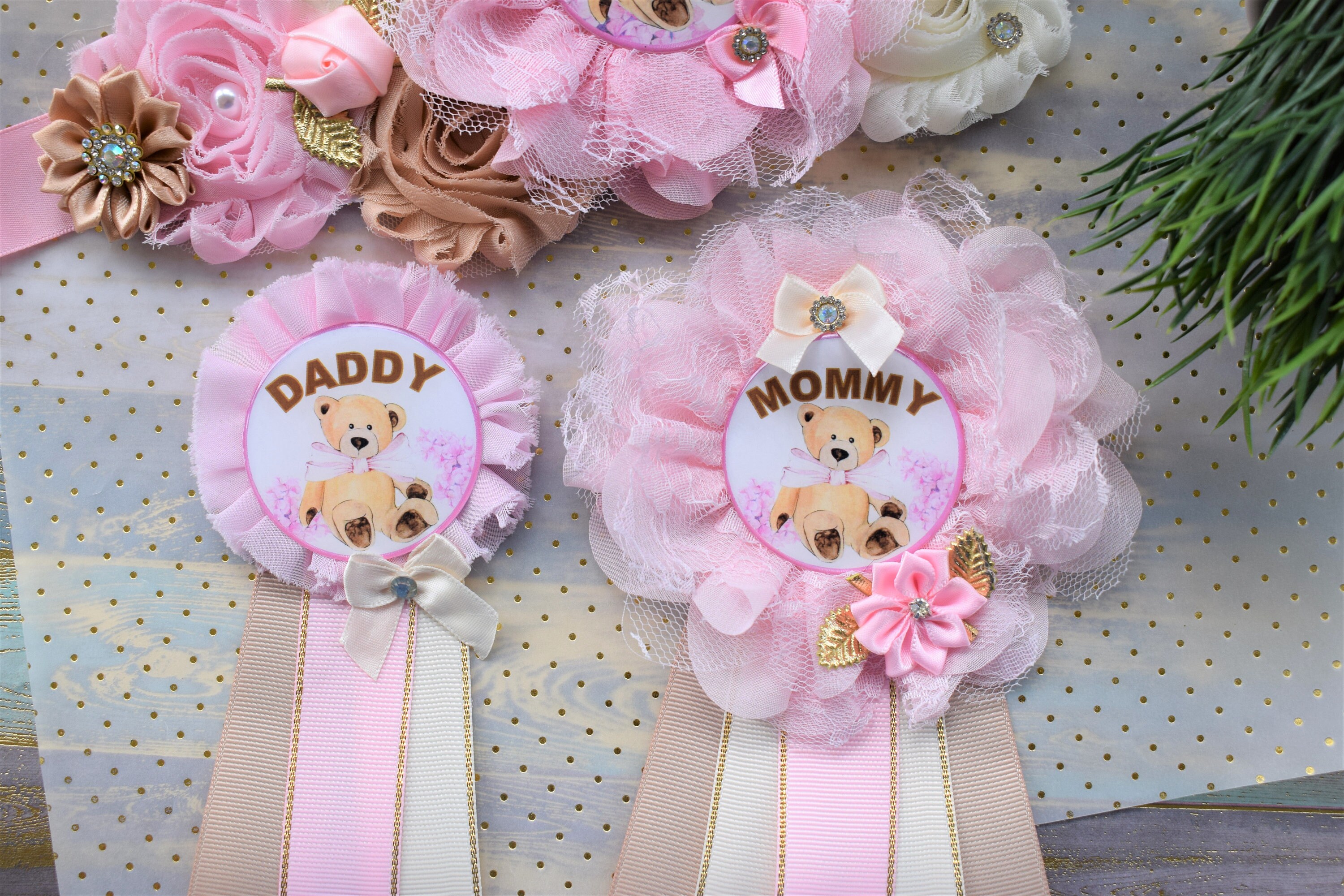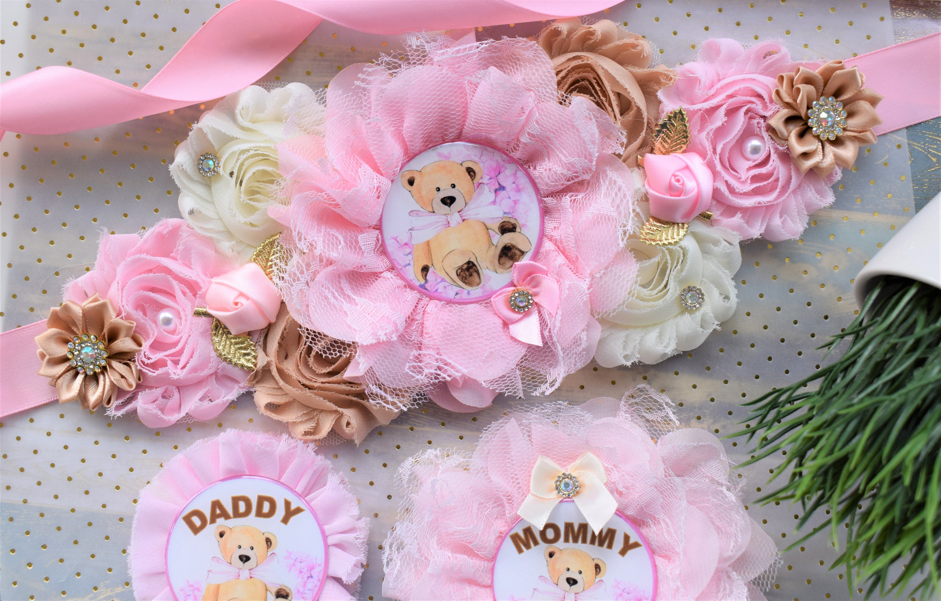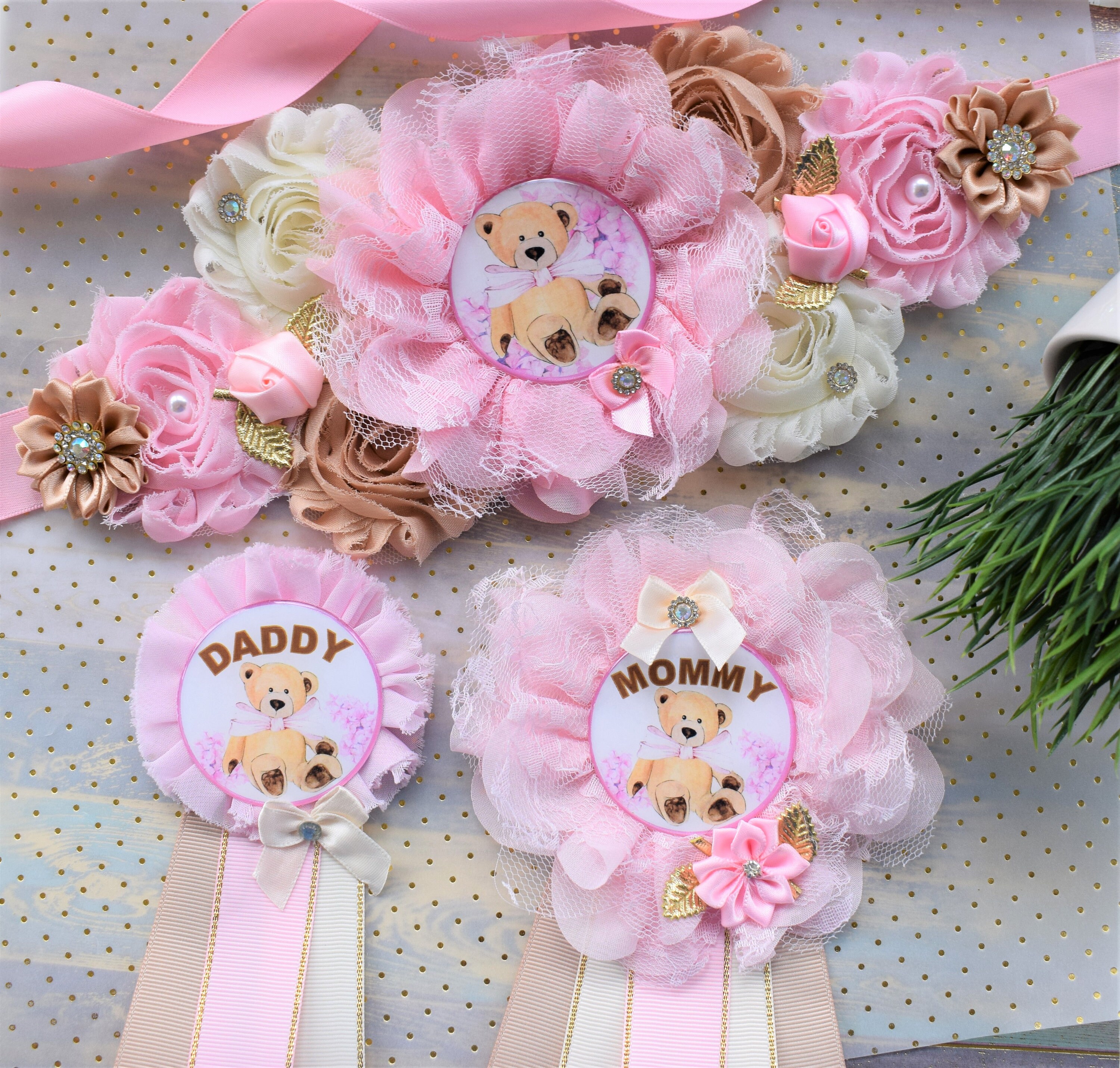Girl Teddy Bear Baby Shower, Pink Bear Mommy Bear Maternity Sash, Papa Teddy Bear Mommy Daddy To Be Corsage, Pink Girl Teddy Bear, Custom