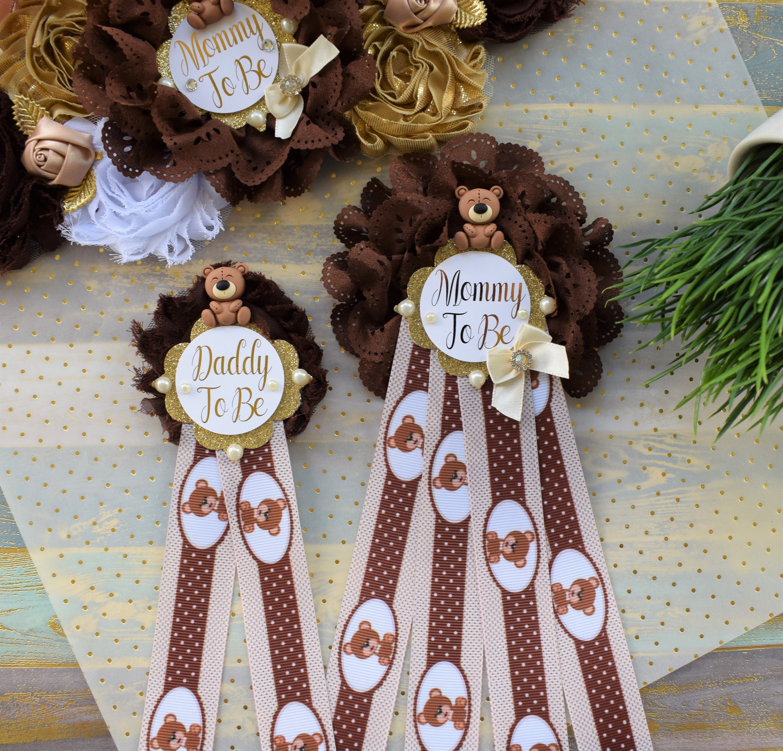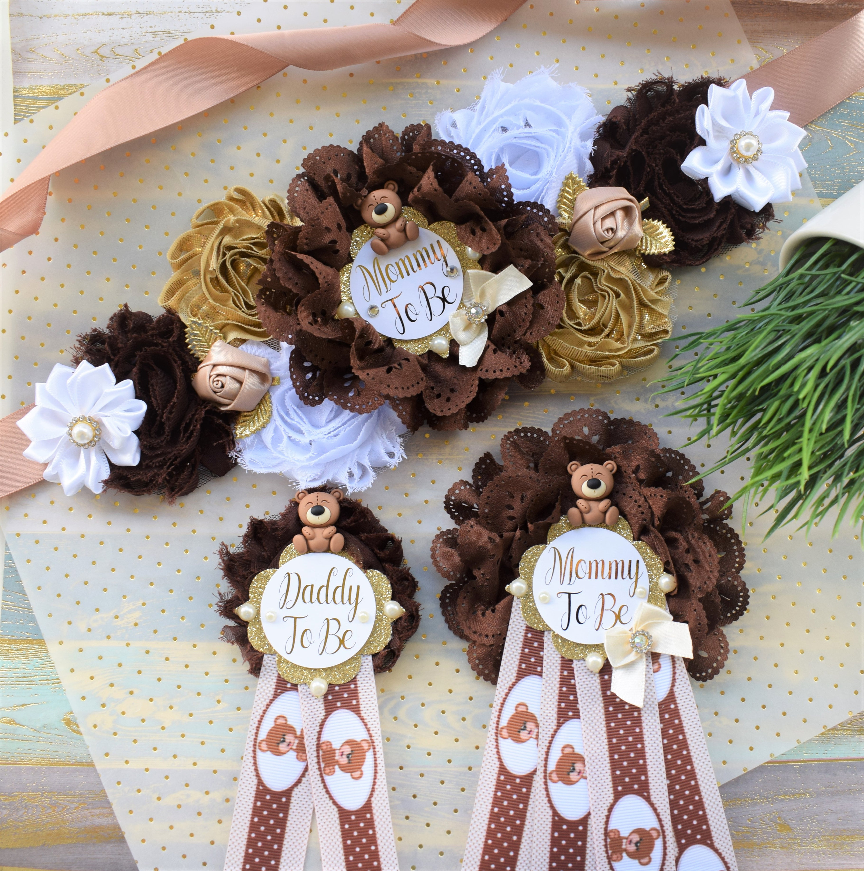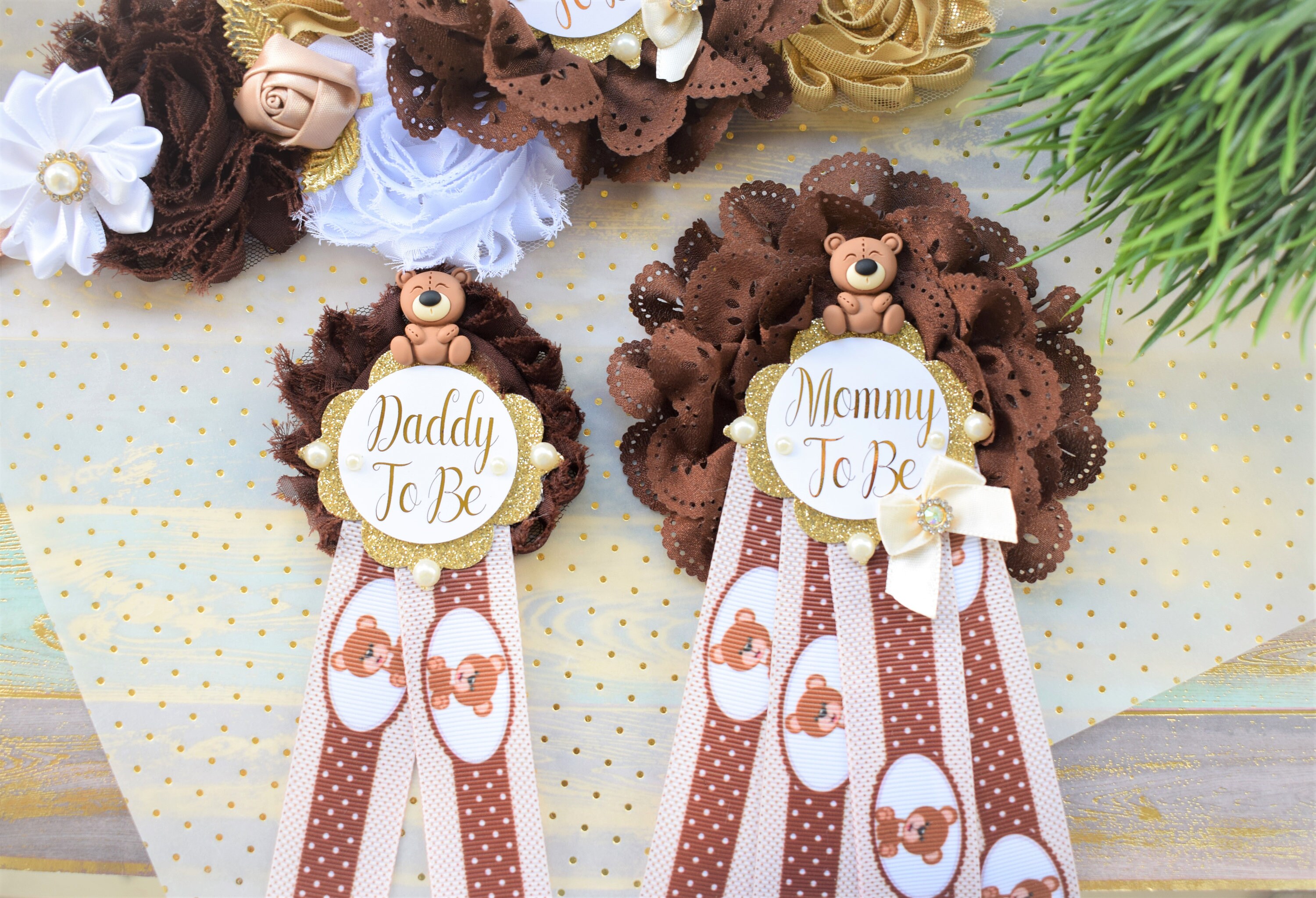 Brown Teddy Bear Baby Shower, Teddy Bear Flower Sash, Ivory Brown Beige White Teddy Bear Corsage Pin, Bear Mommy To Be, Daddy To Be, Custom