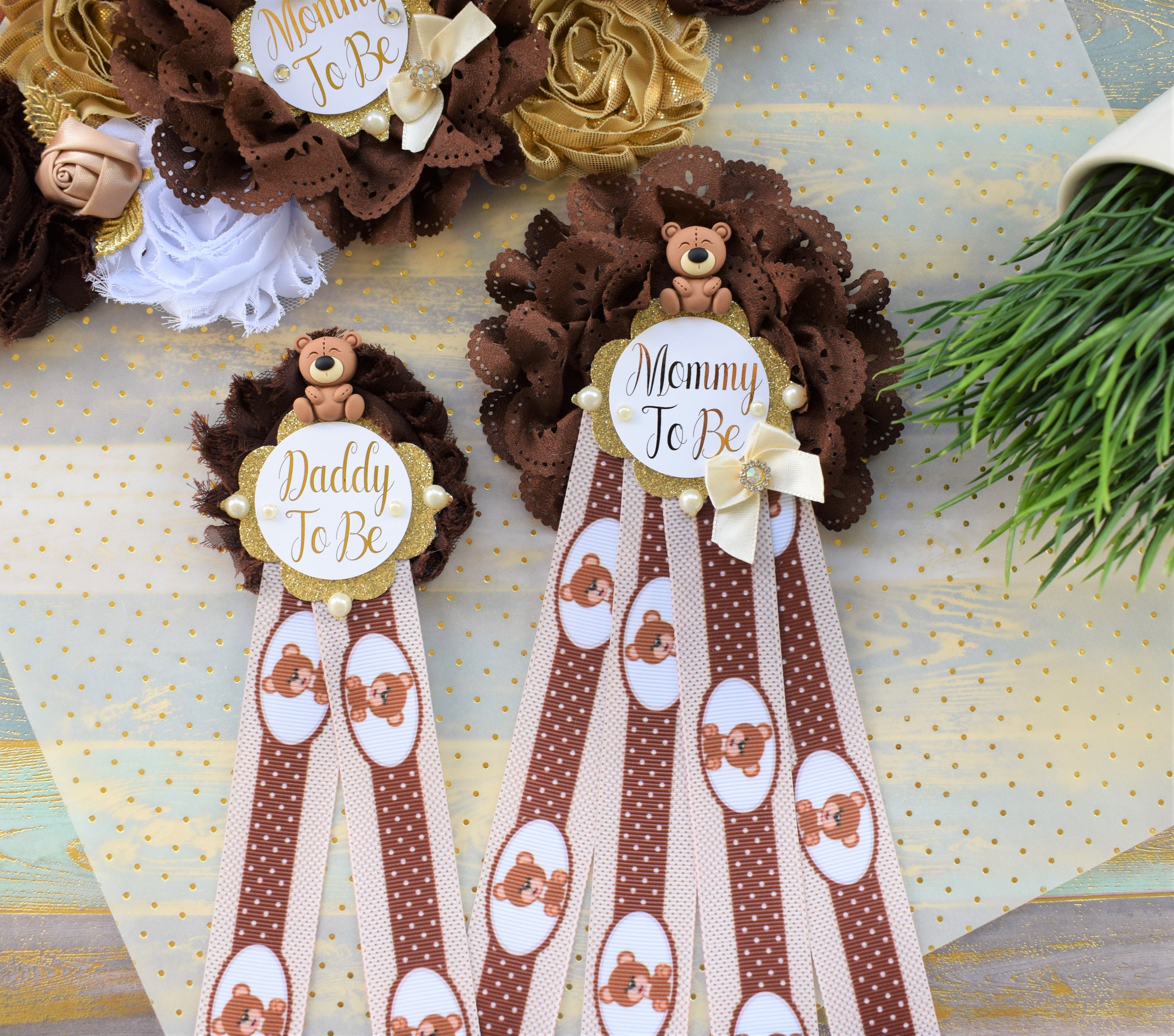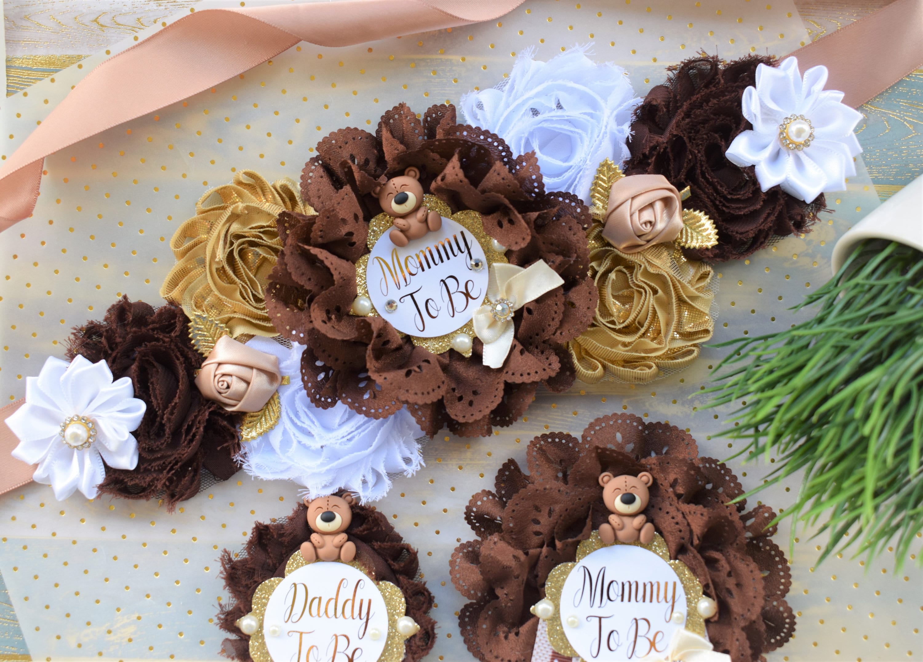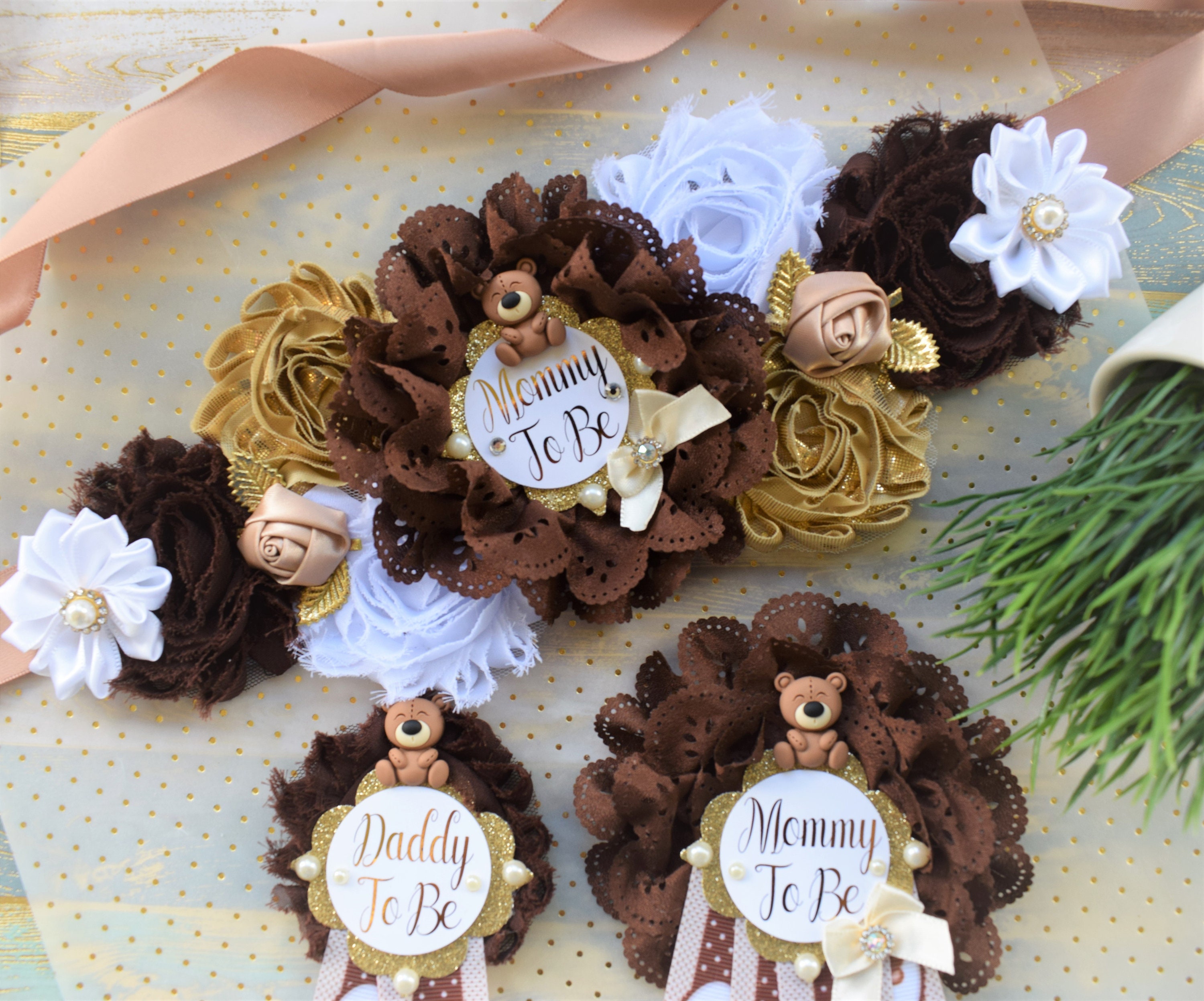 Brown Teddy Bear Baby Shower, Teddy Bear Flower Sash, Ivory Brown Beige White Teddy Bear Corsage Pin, Bear Mommy To Be, Daddy To Be, Custom