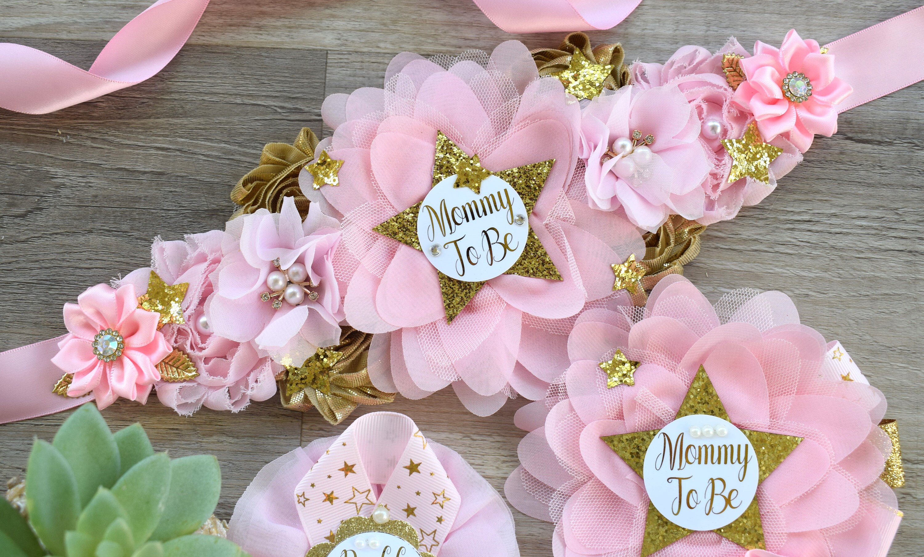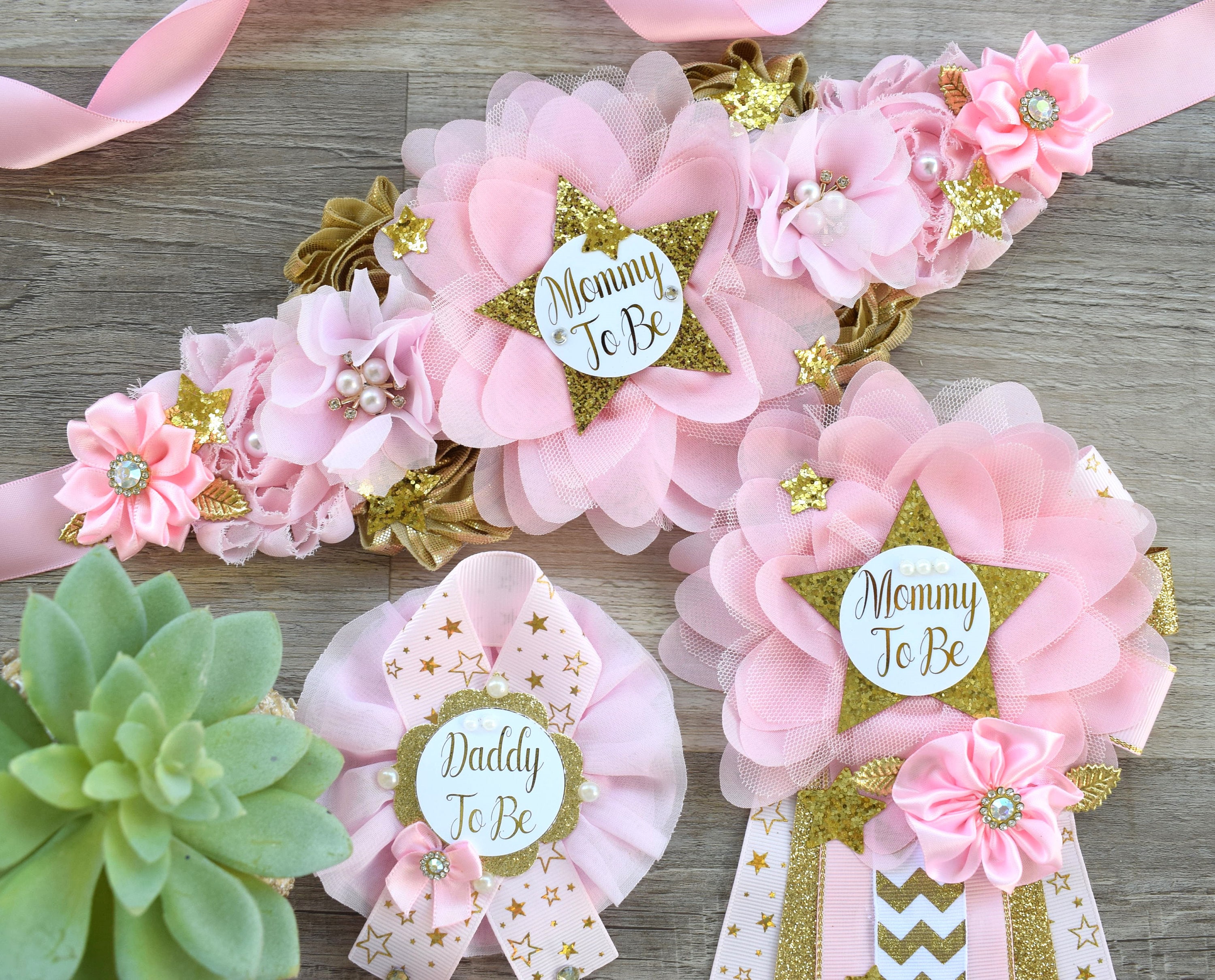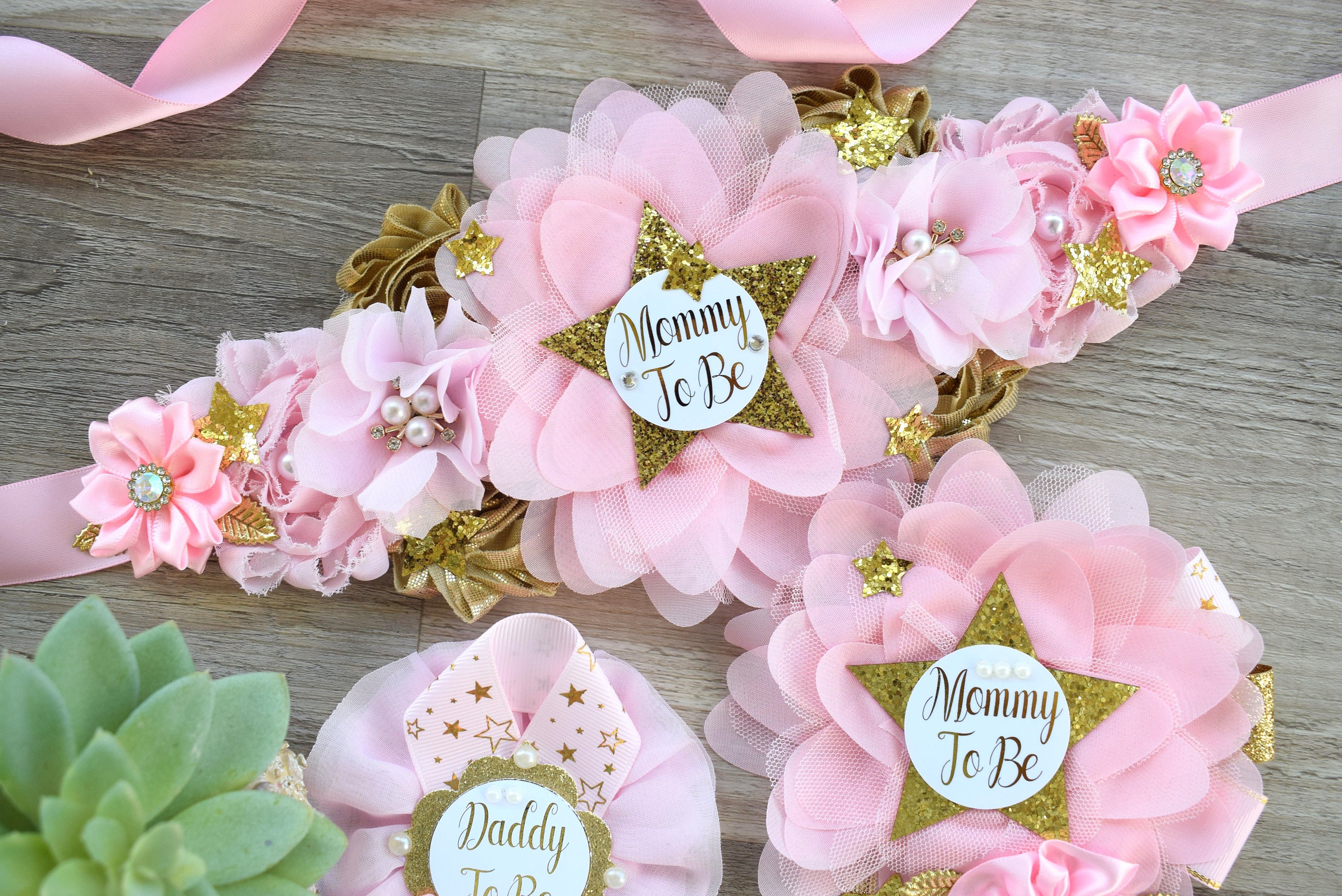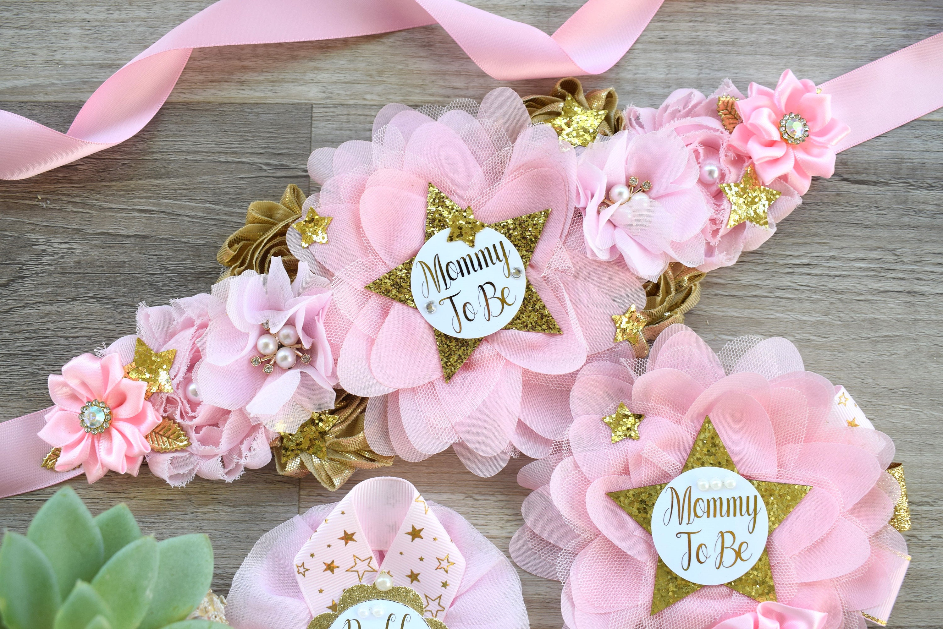 * Maternity Sash: It has eleven beautiful flowers in Light Pink & Gold colors embellished with rhinestones, stars, and pearls. The ribbon sash is 80'' (2 meters) long.