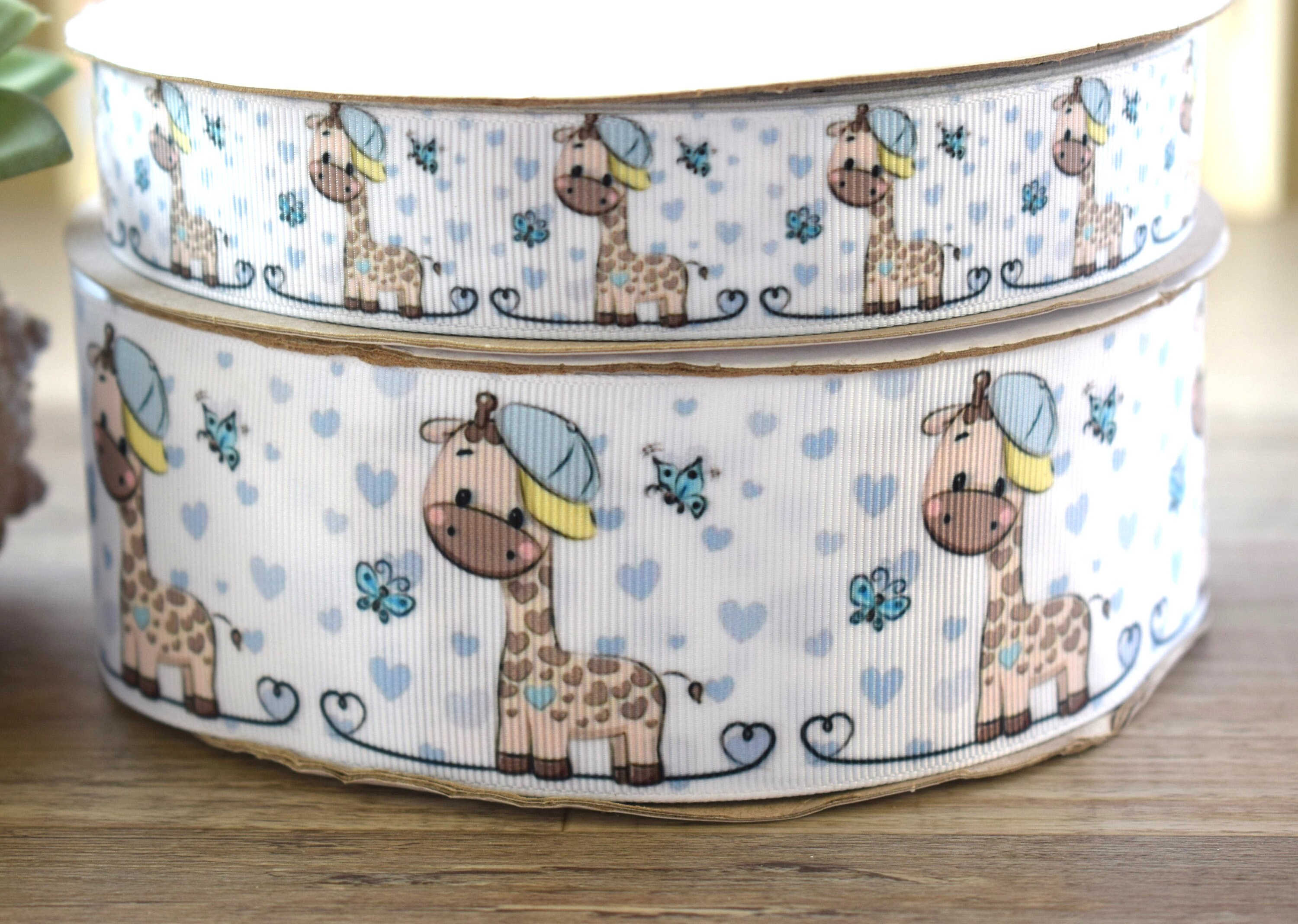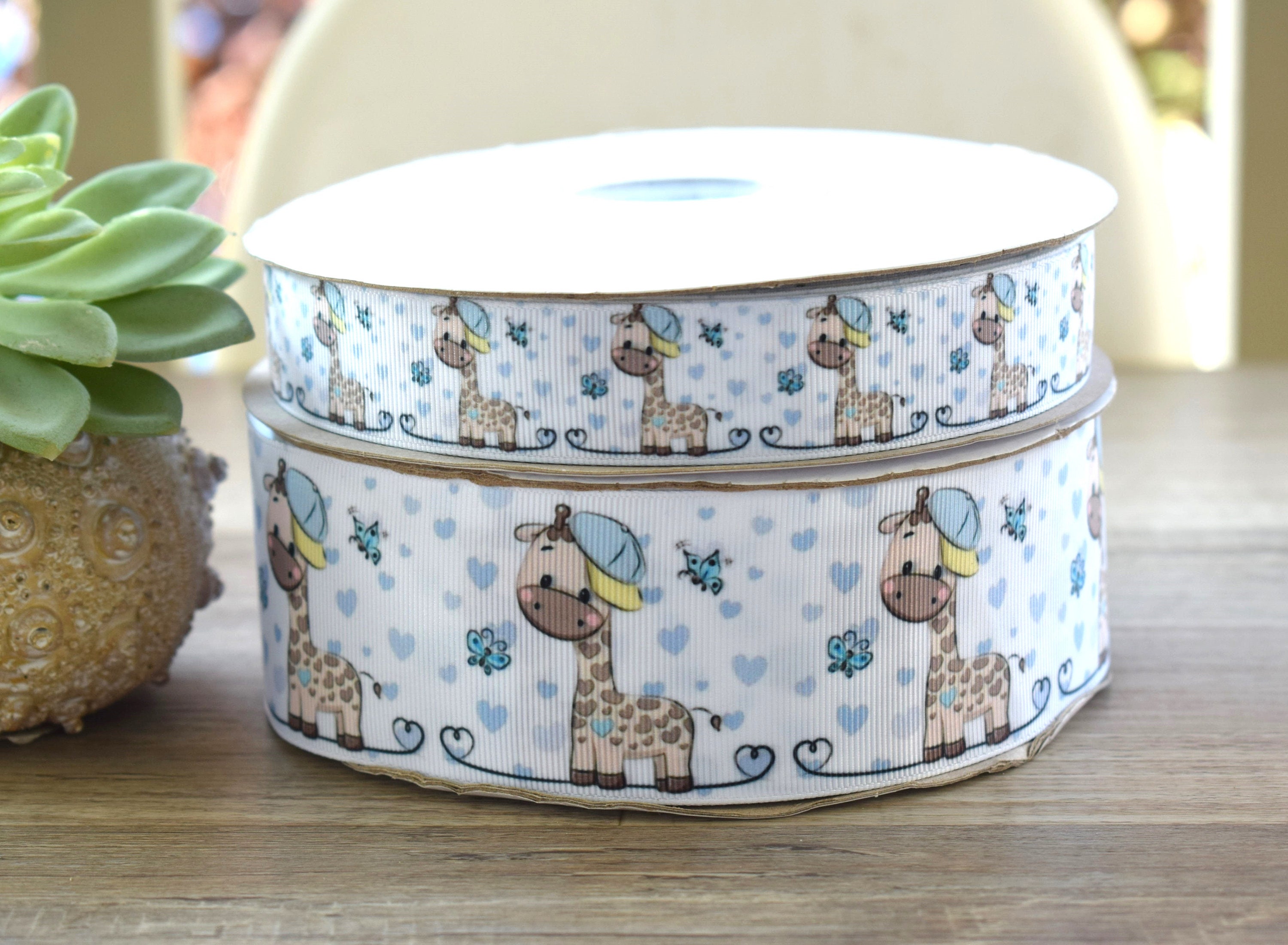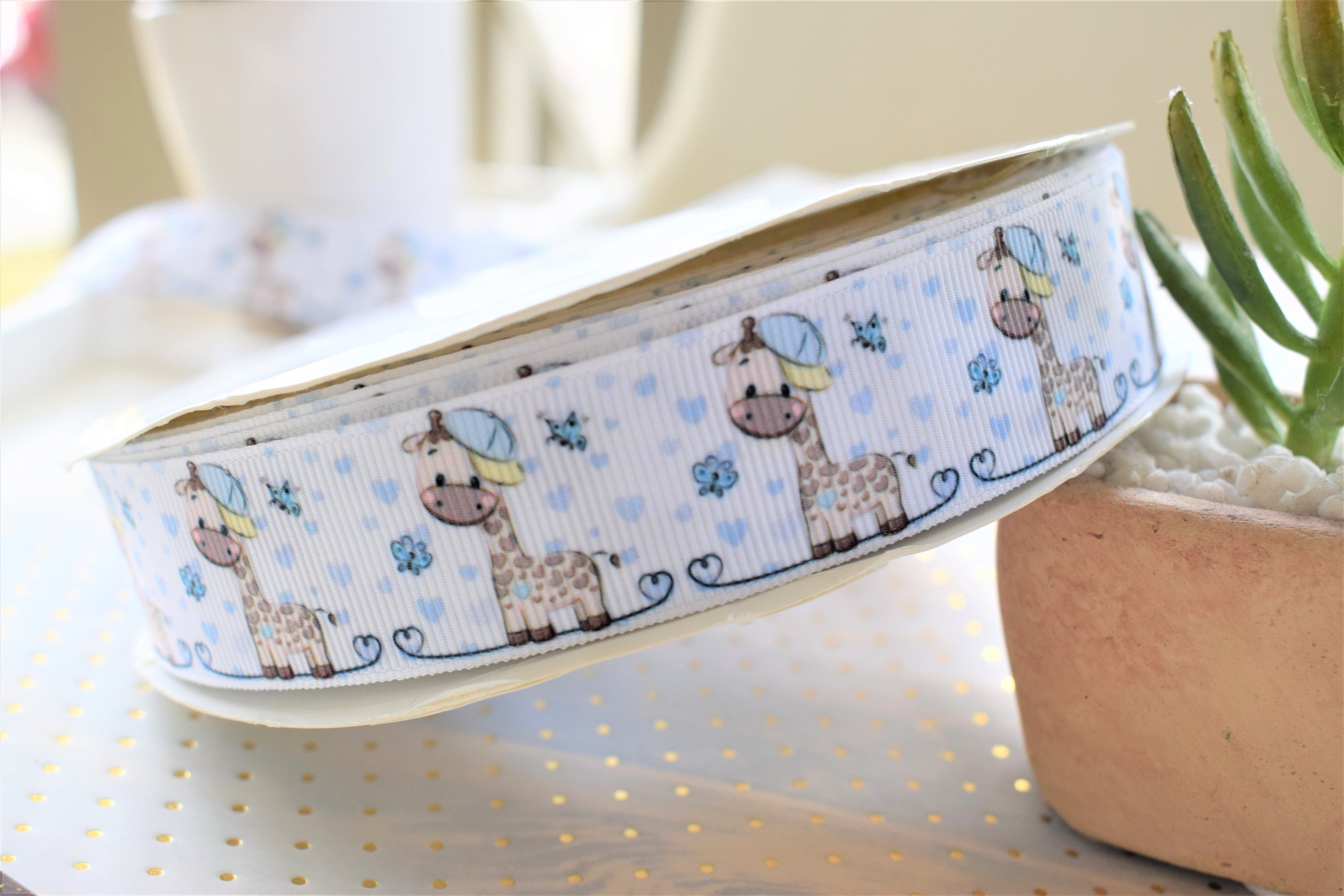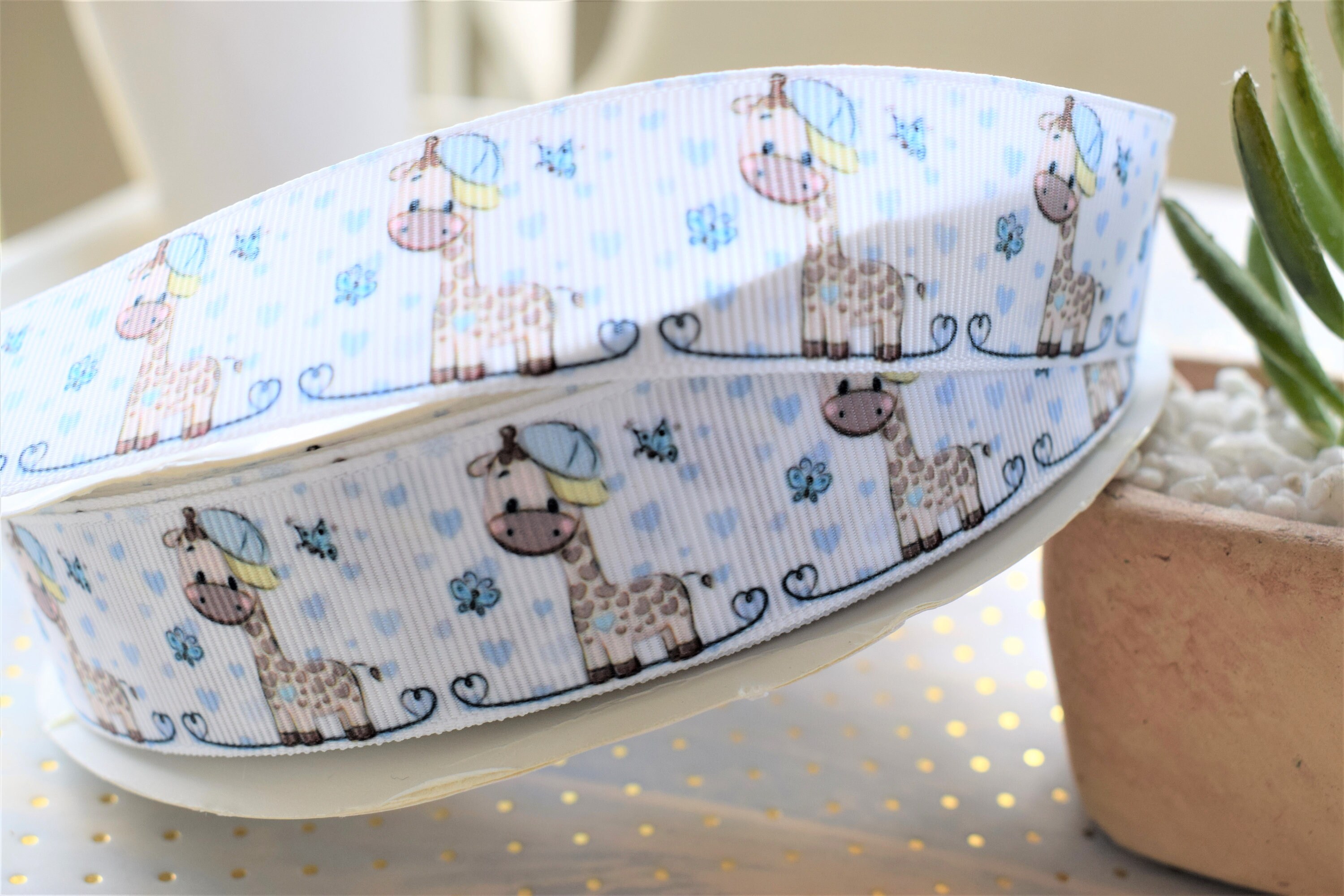 Blue Giraffe Baby Shower Ribbon, Boy Baby Giraffe Ribbon, Blue Giraffe Ribbon, Giraffe Printed Grosgrain || 3 Yards of Ribbon - 1" (25mm)