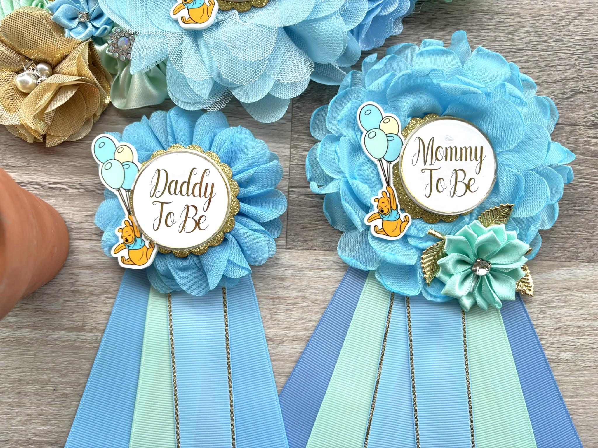 Blue Winnie the Pooh Baby Shower Set, Winnie Maternity Sash, Mommy To Be Pin, Daddy To Be Pin, Baby Shower Gift, Custom Order Welcome
