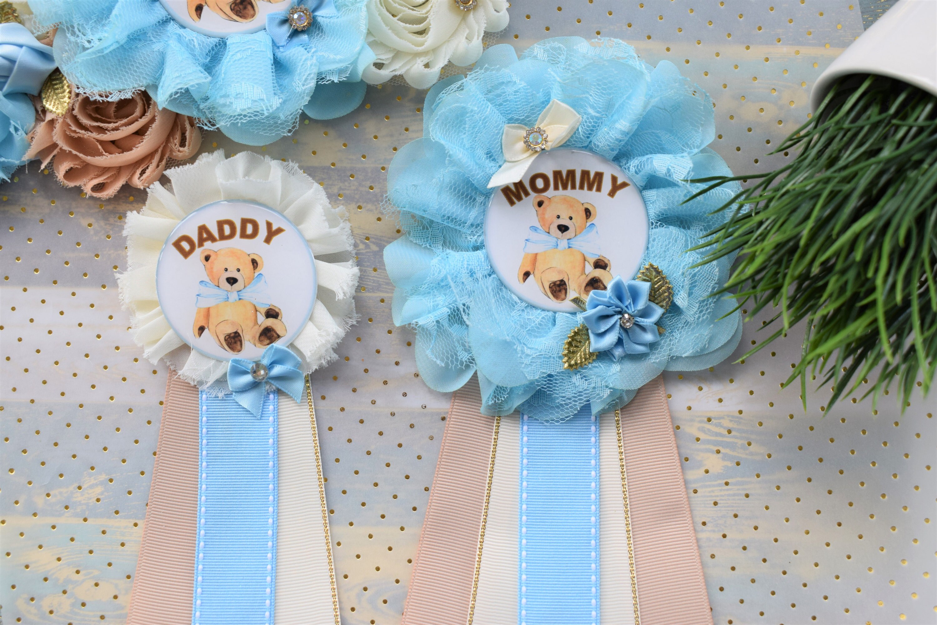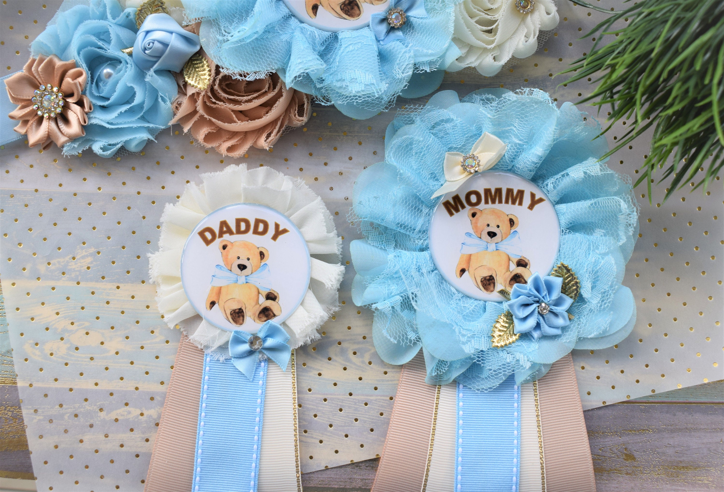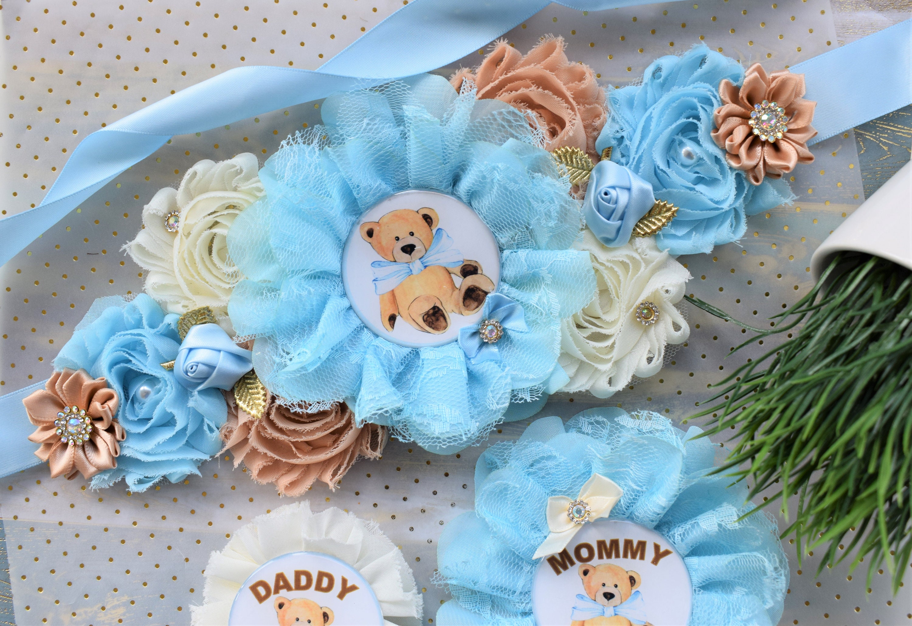 Blue Bear Baby Shower, Teddy Bear Blue Flower Sash, Teddy Bear Corsage Pin, Bear Mommy To Be, Bear Daddy To Be, Bear Baby Shower, Custom