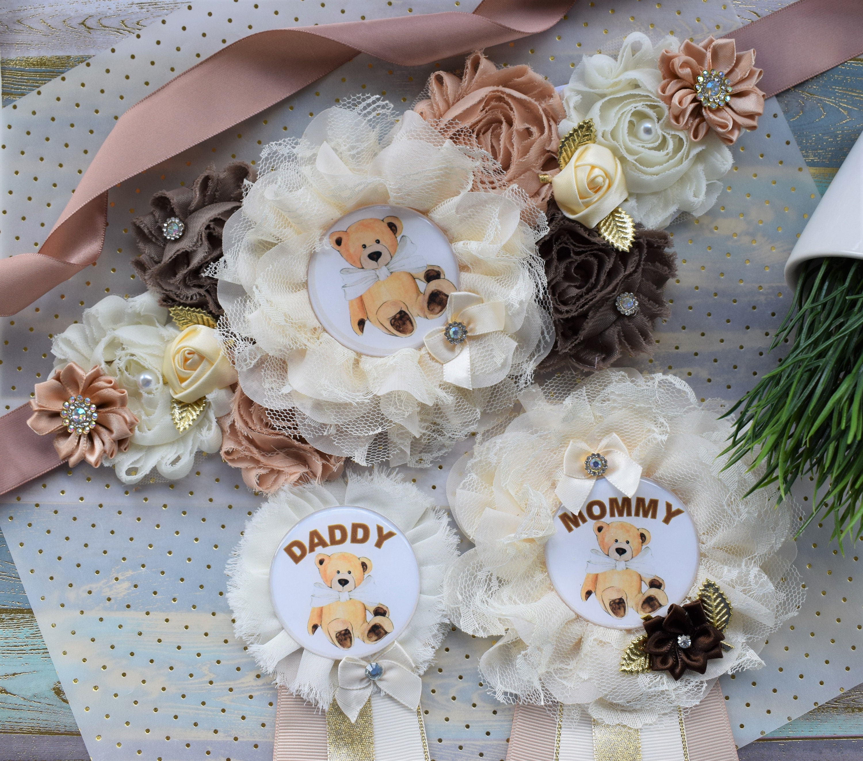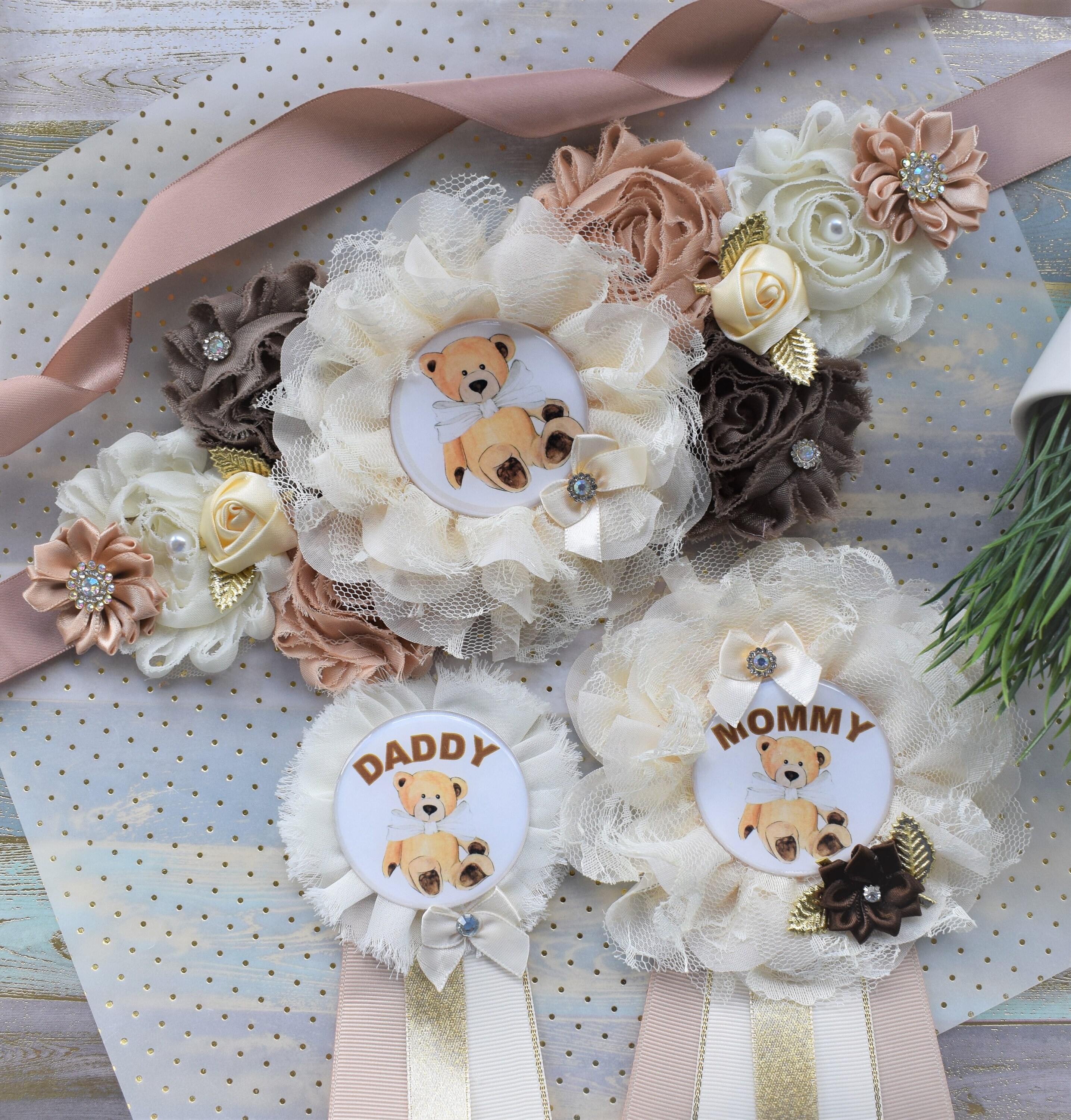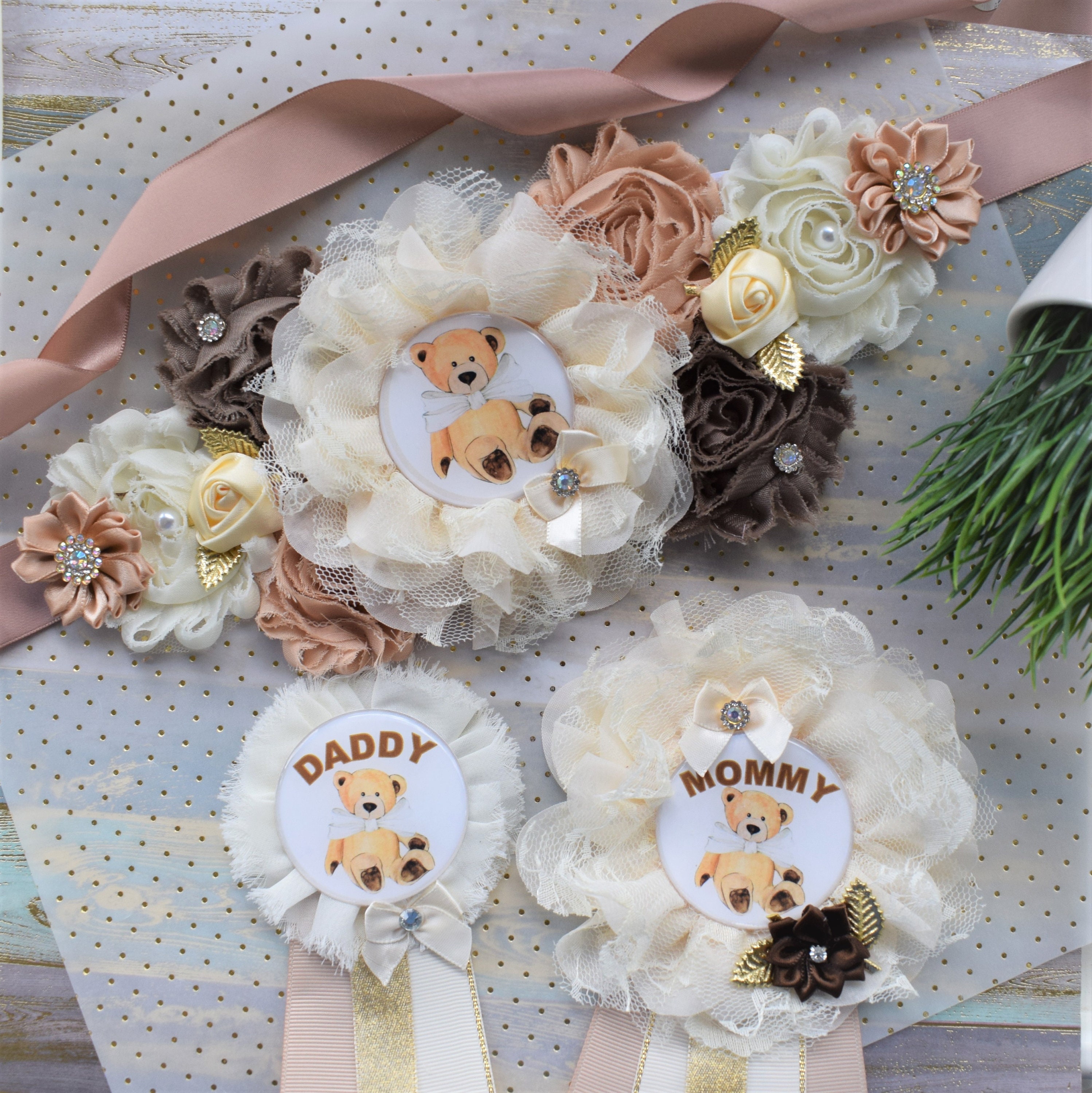 Ivory Brown Teddy Bear Baby Shower, Teddy Bear Flower Sash, Ivory Brown Beige Teddy Bear Corsage Pin, Bear Mommy To Be, Daddy To Be, Custom