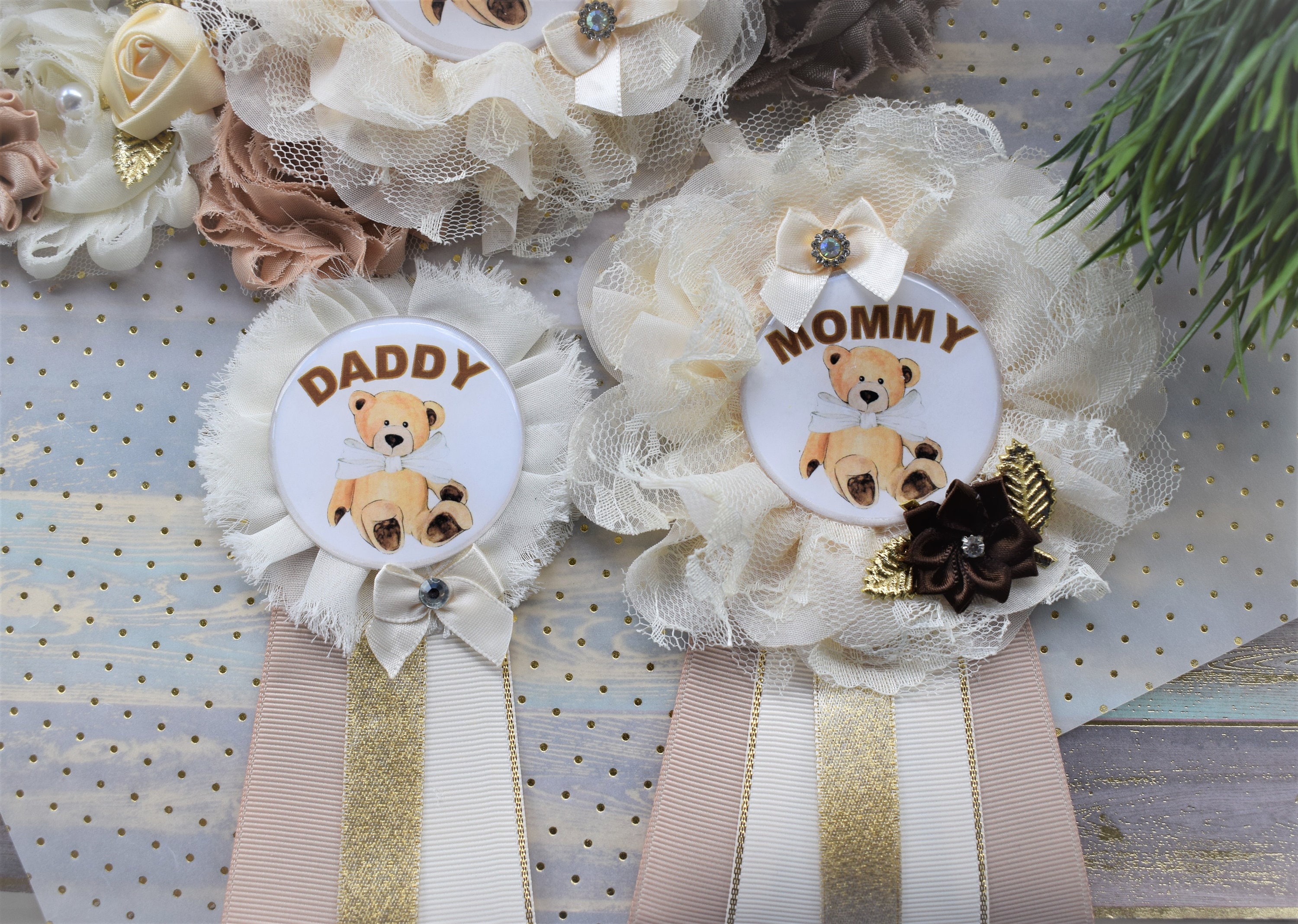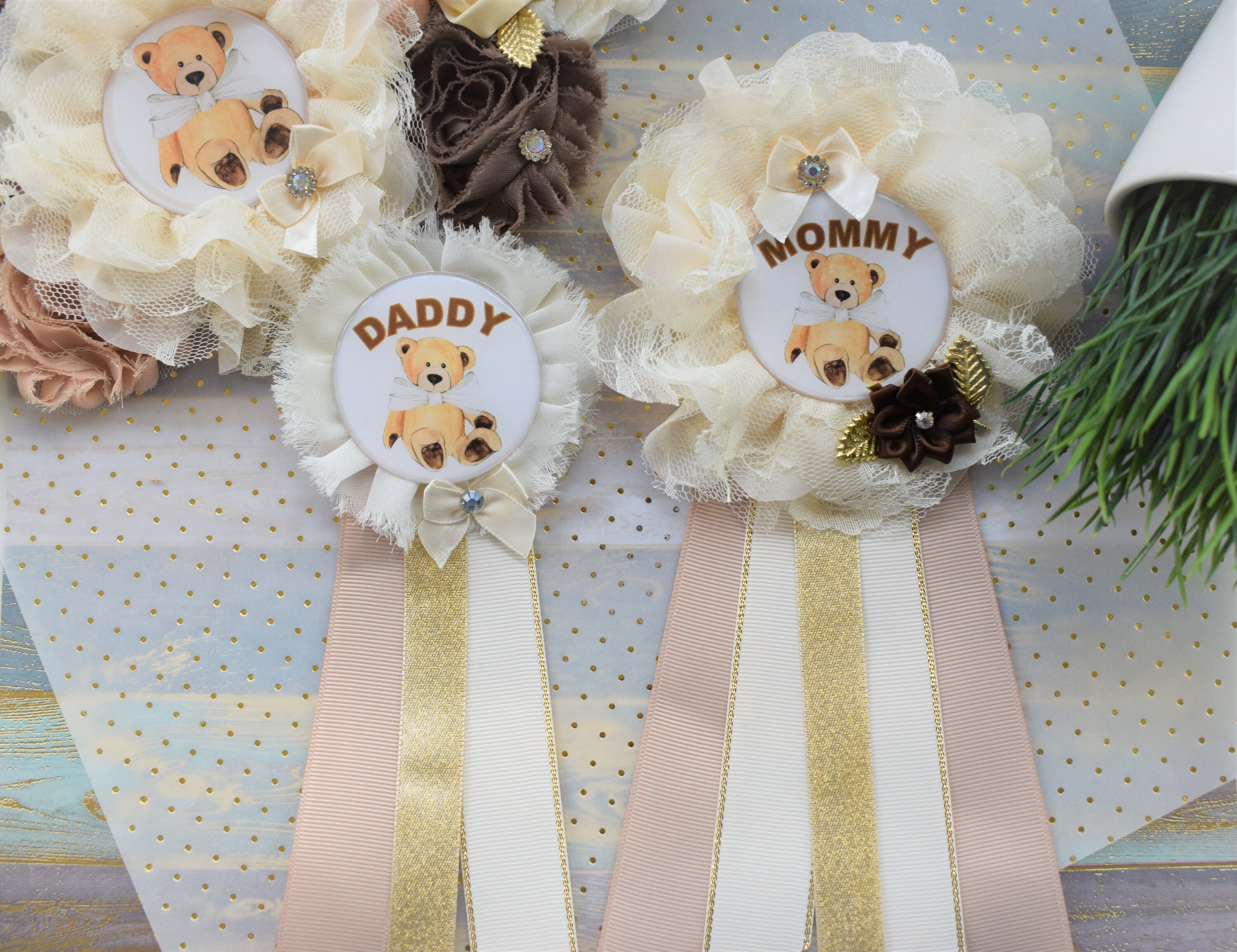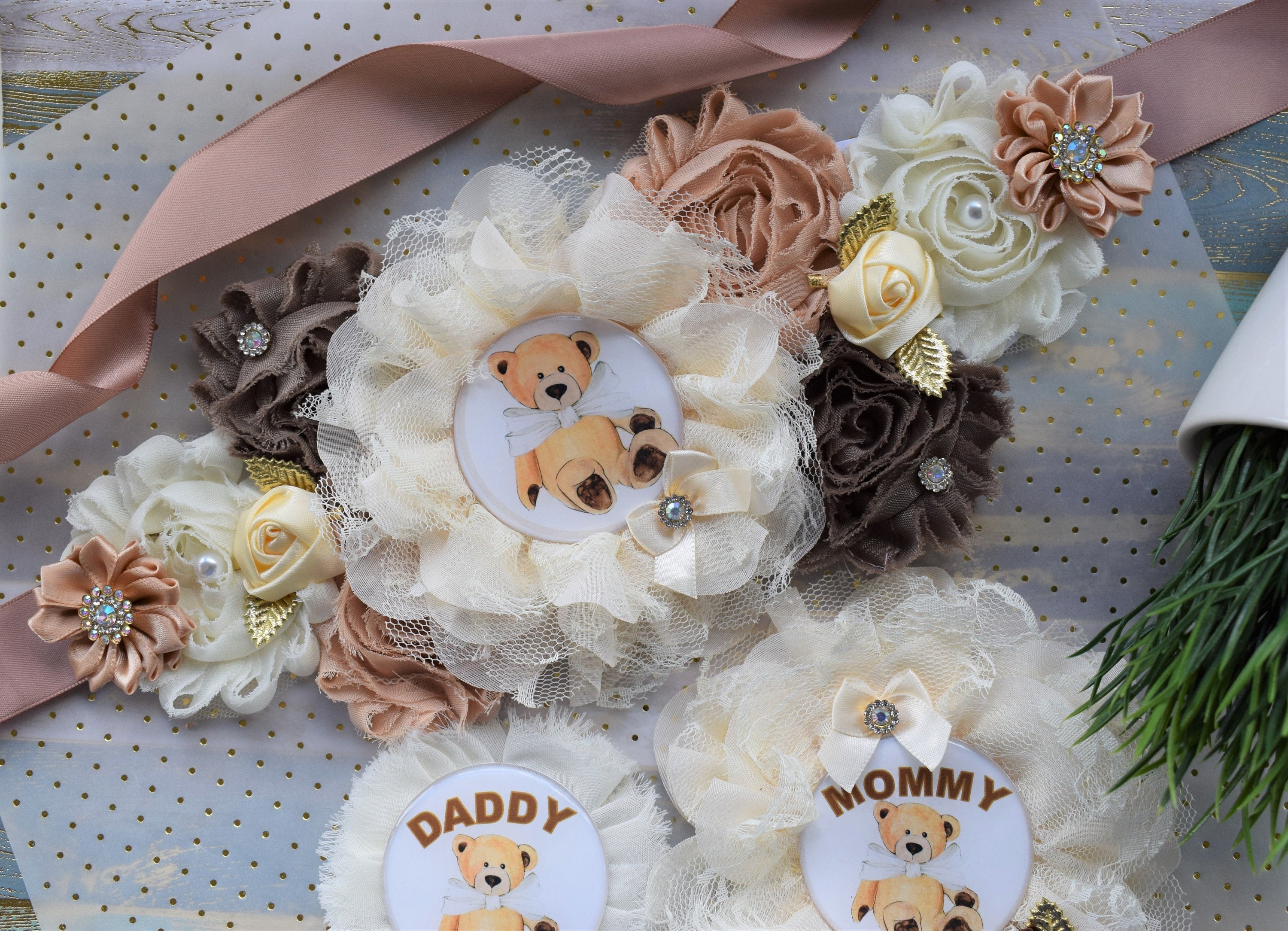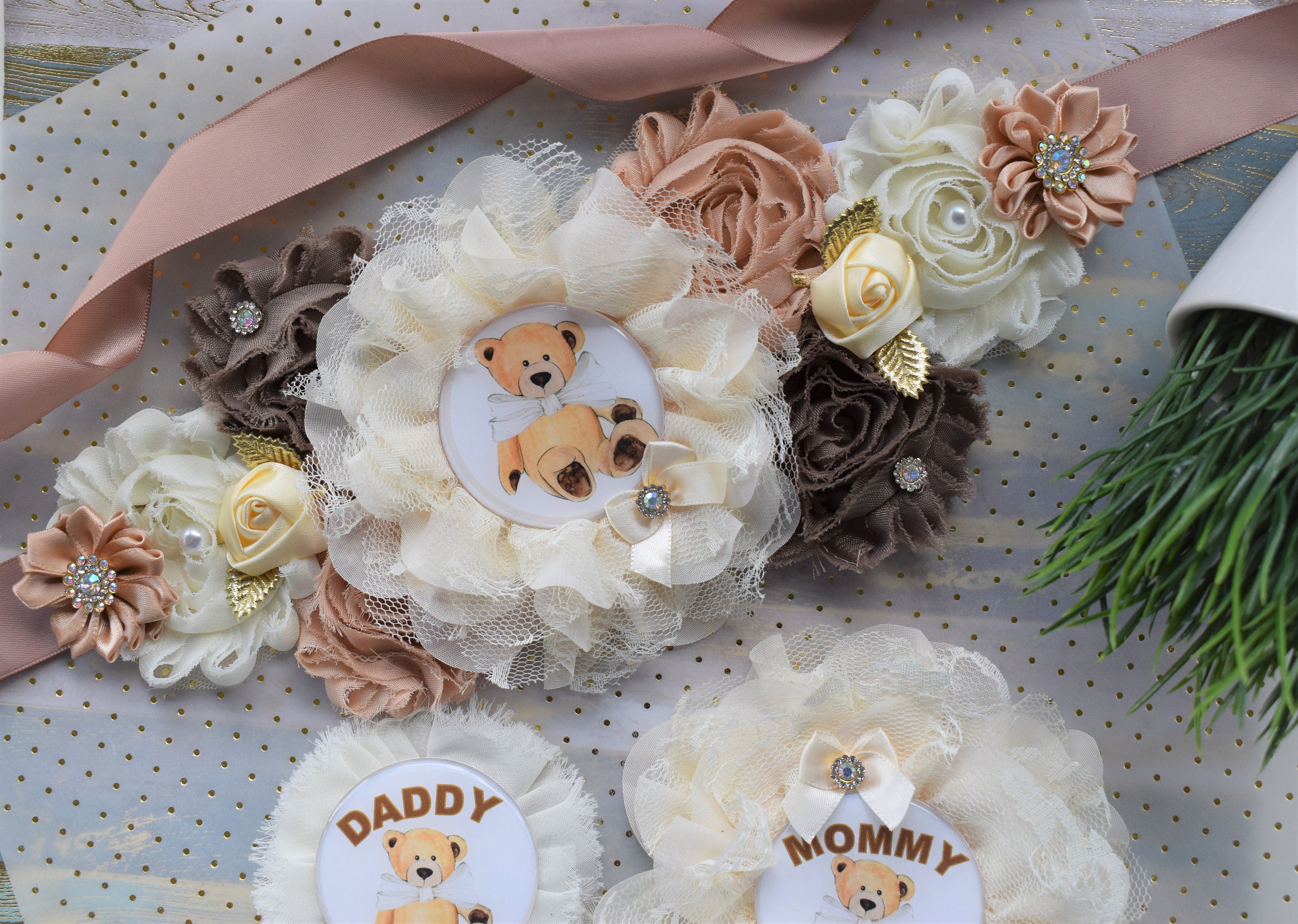 Ivory Brown Teddy Bear Baby Shower, Teddy Bear Flower Sash, Ivory Brown Beige Teddy Bear Corsage Pin, Bear Mommy To Be, Daddy To Be, Custom