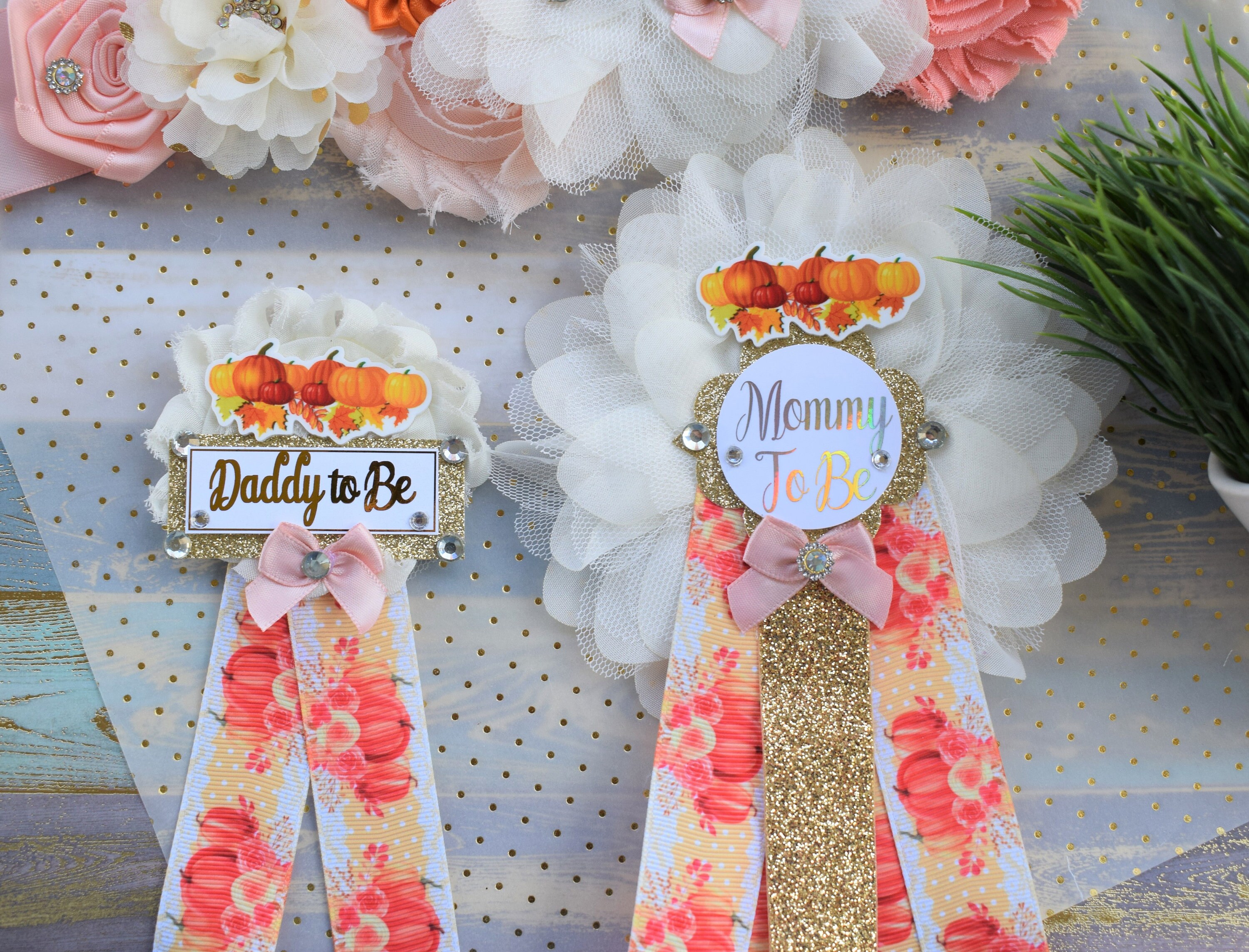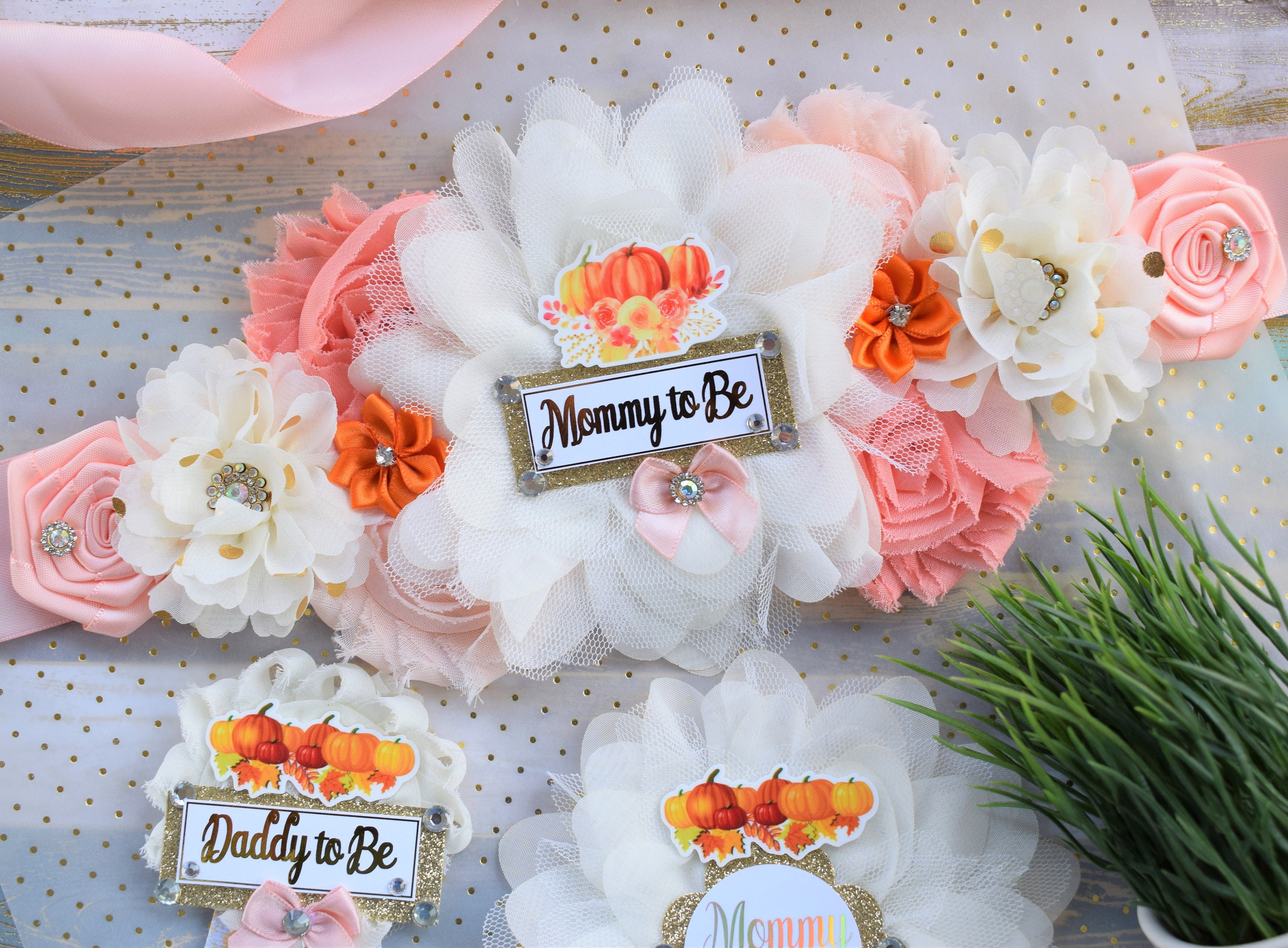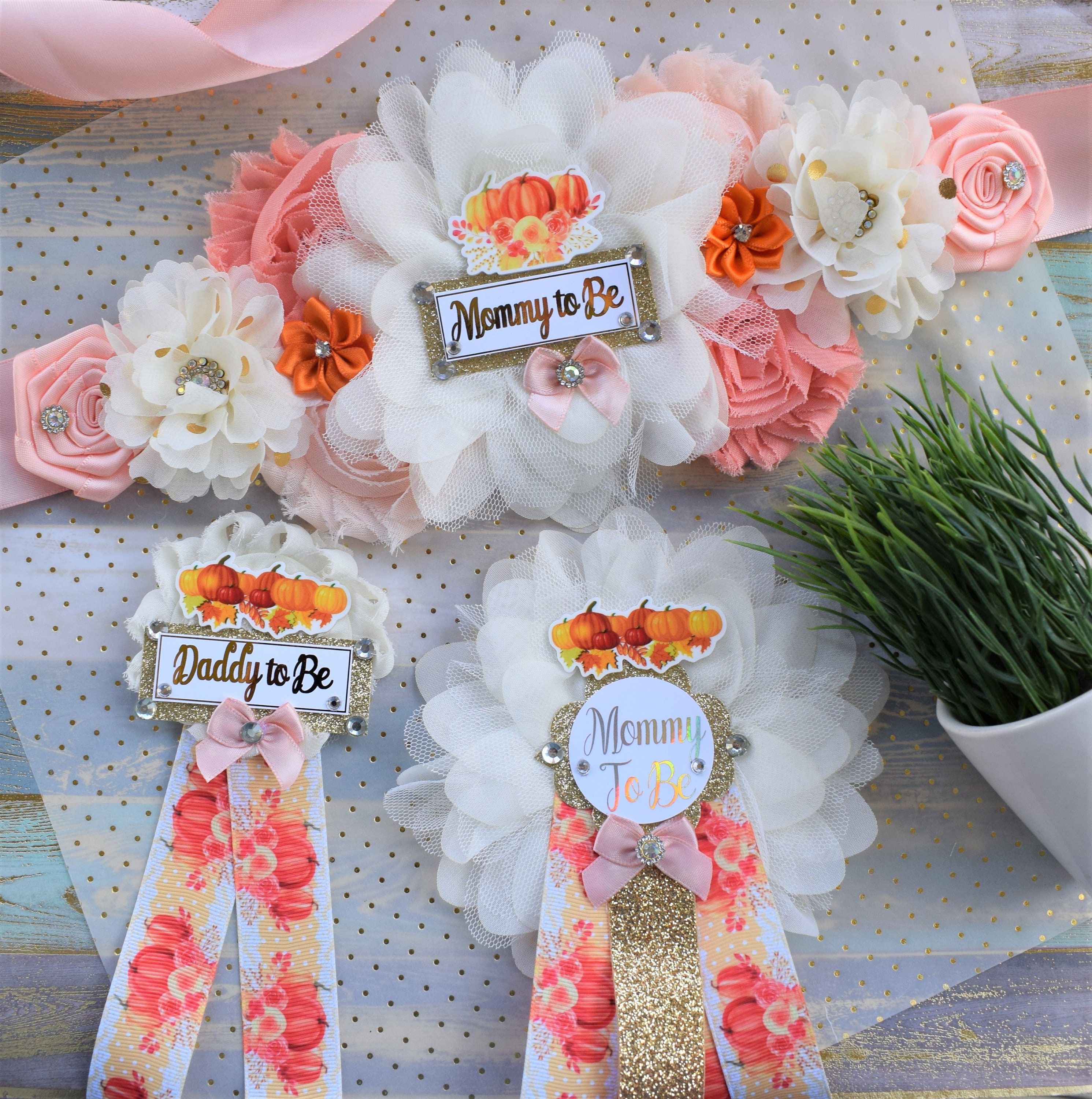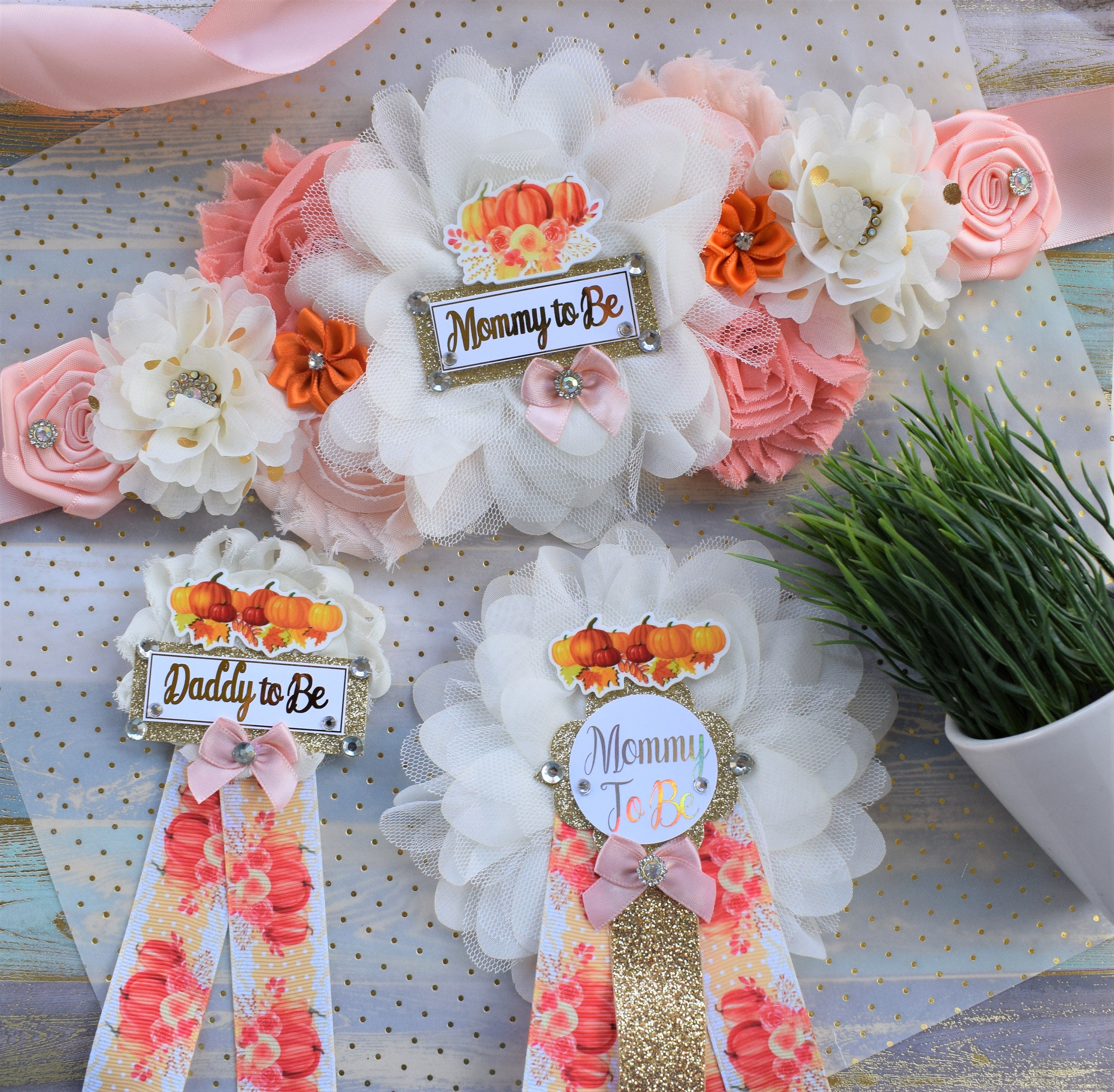 This Gorgeous Pumpkin Corsage Pins Set was made especially for a Baby Shower or a Photo Prop.