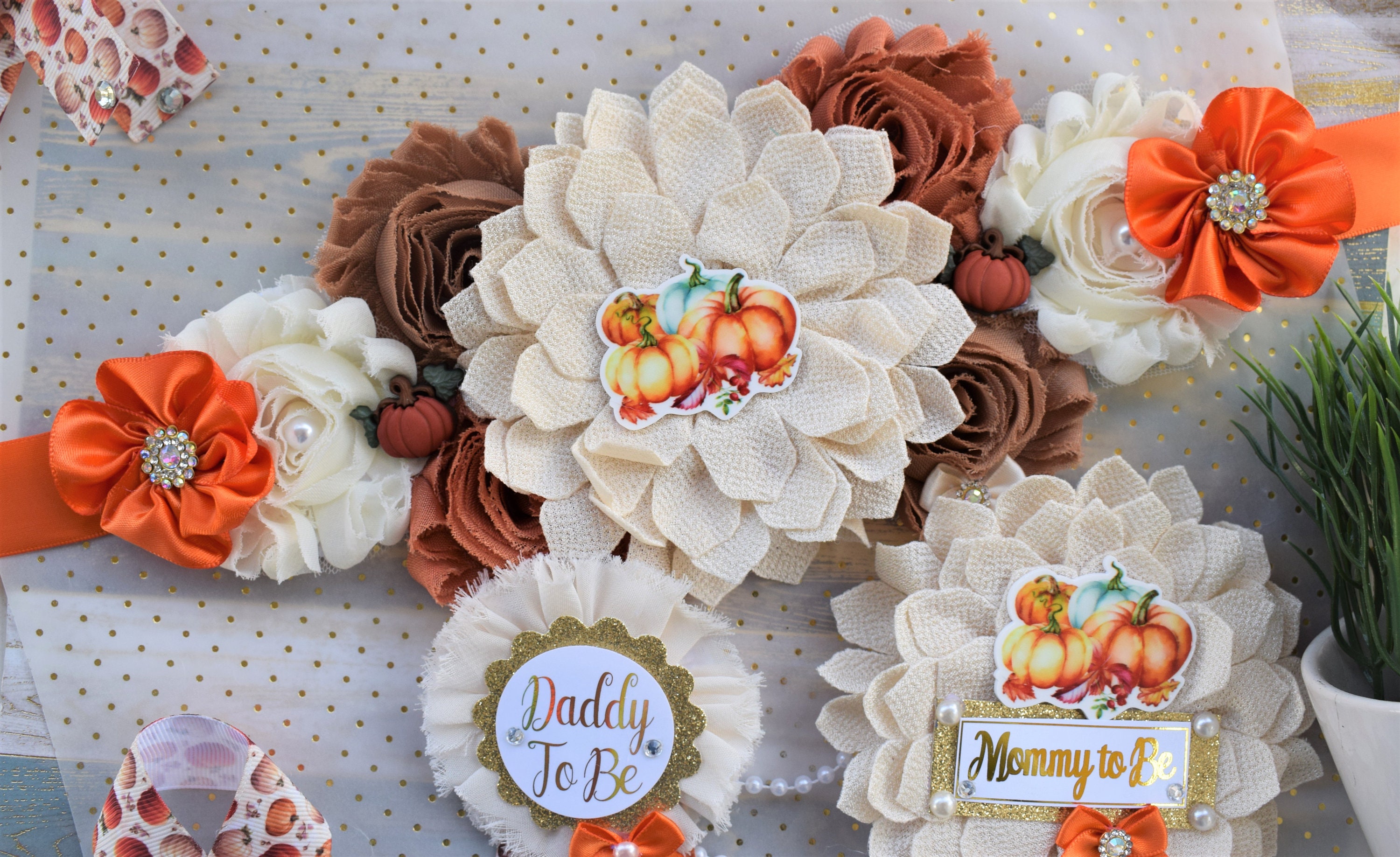 This Gorgeous Pumpkin Sash & Pins Set was made especially for a Baby Shower or a Photo Prop.