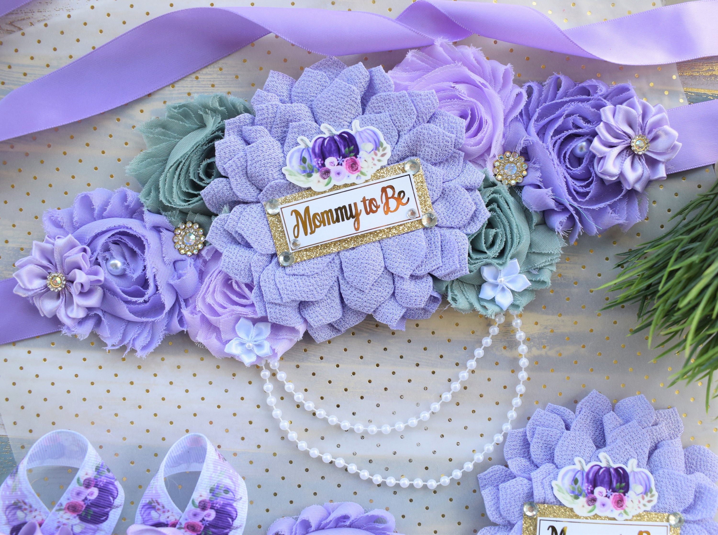 * Maternity Sash: It has eleven beautiful flowers in Lavender, Sage & Gold colors embellished with rhinestones and pearls. The ribbon sash is 80'' (2 meters) long.