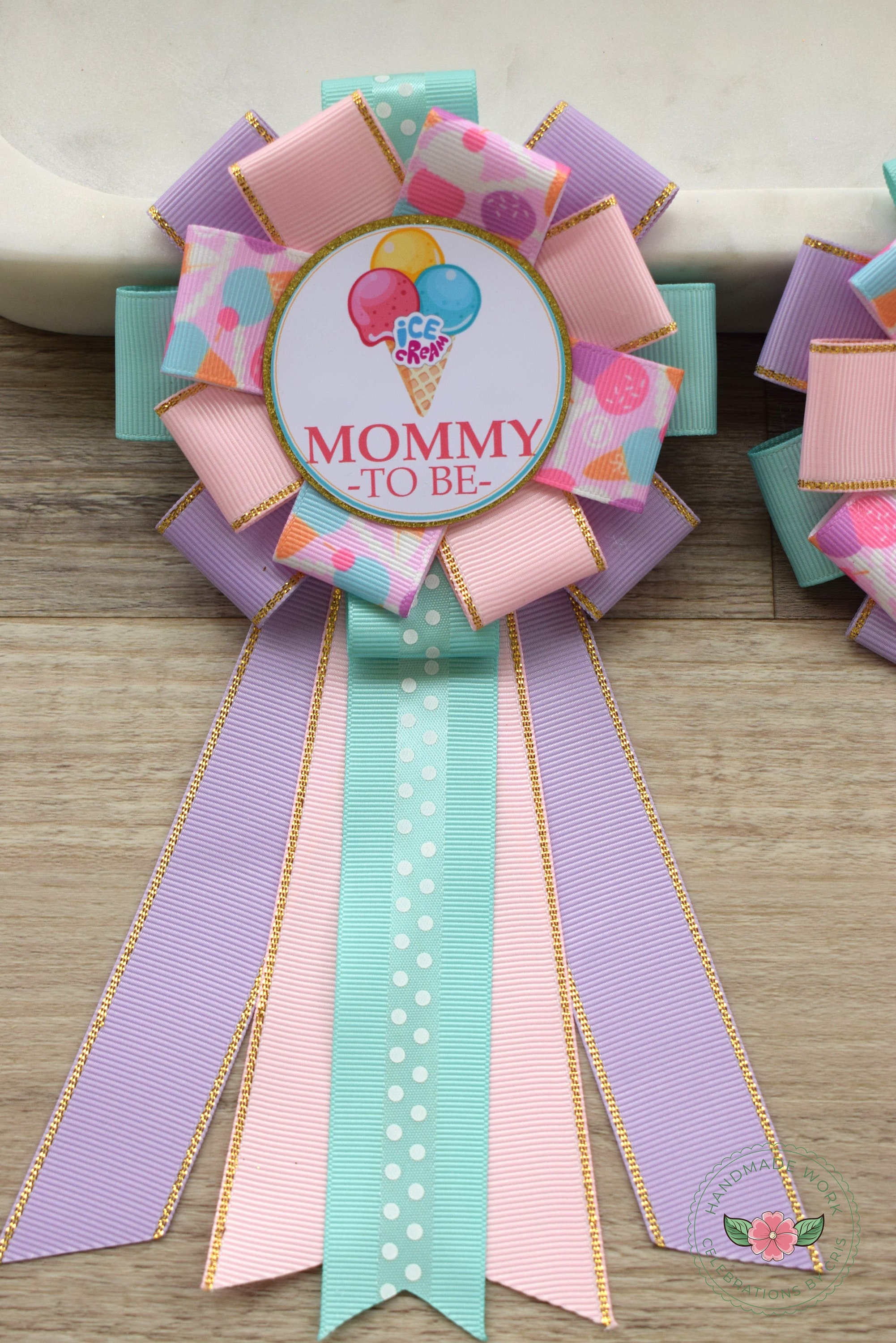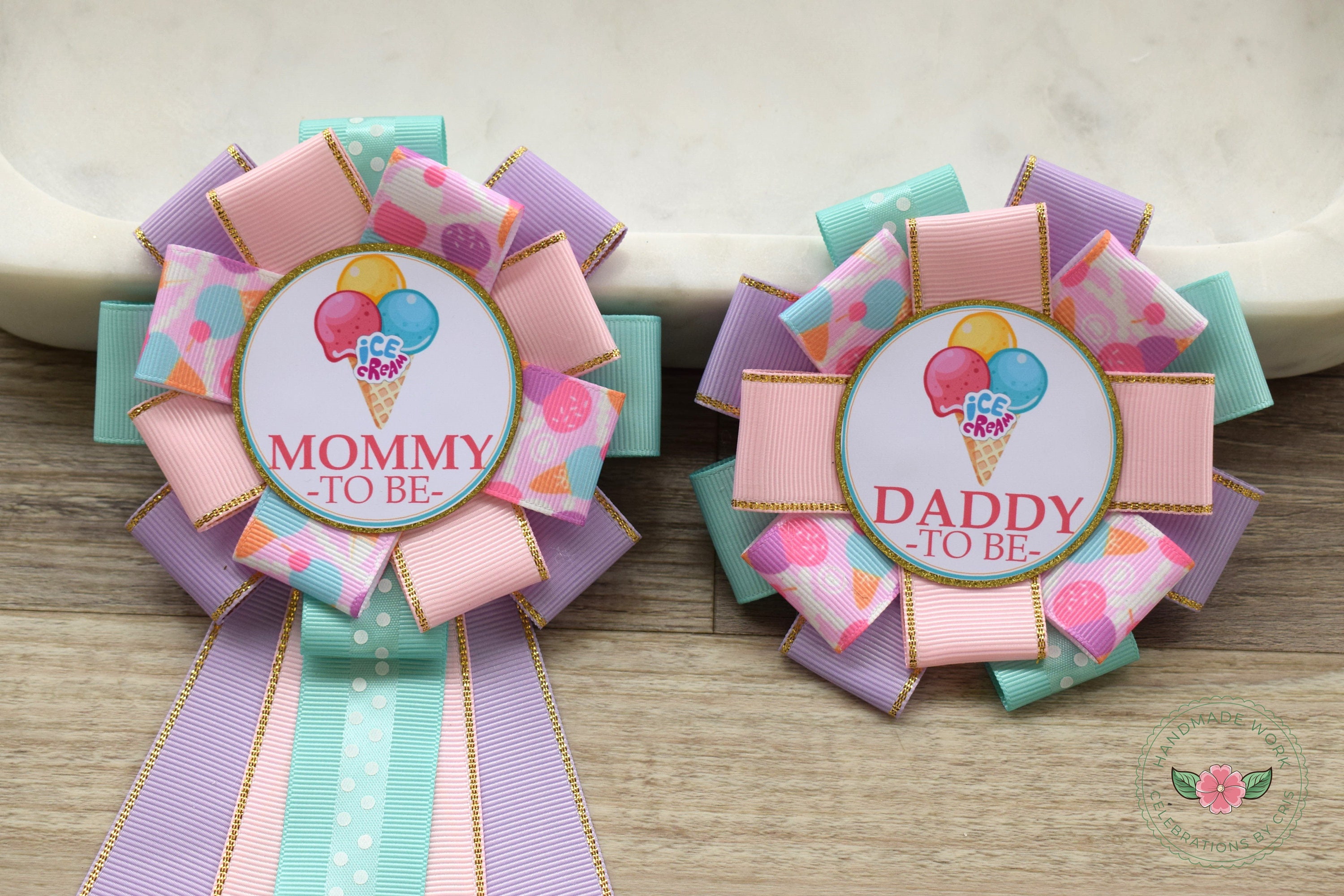 Ice Cream Baby Shower, Lilac Pink Ice Cream Mommy To Be Ribbon Pin, Daddy To Be Pin