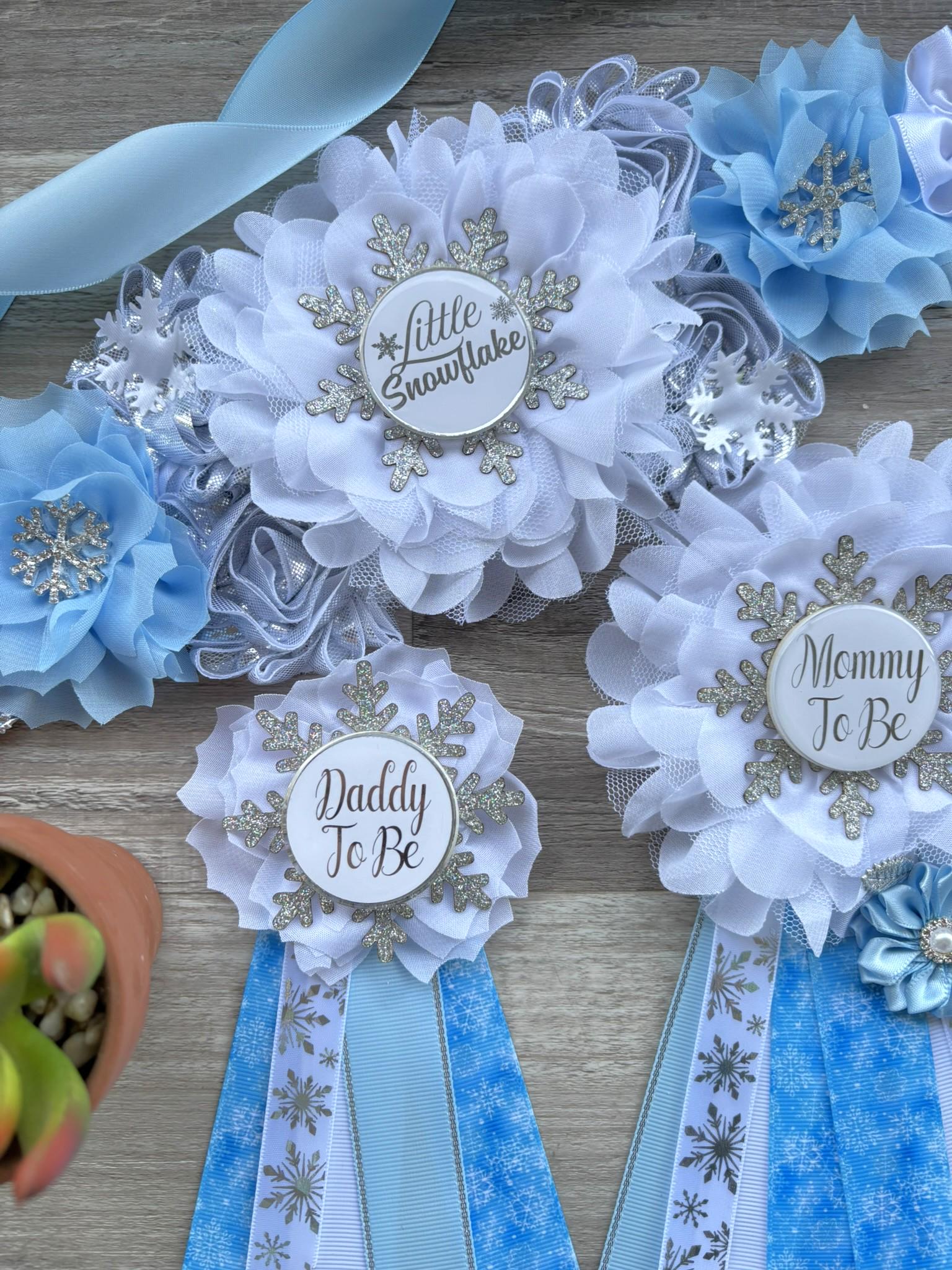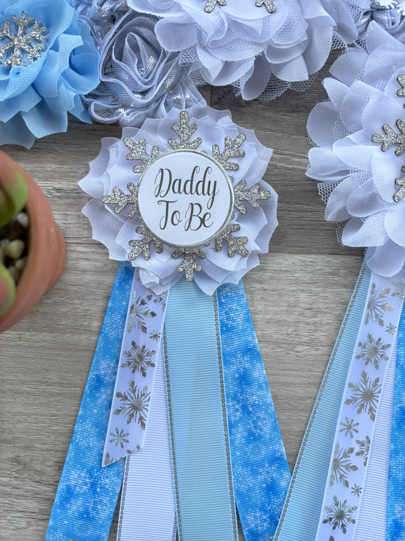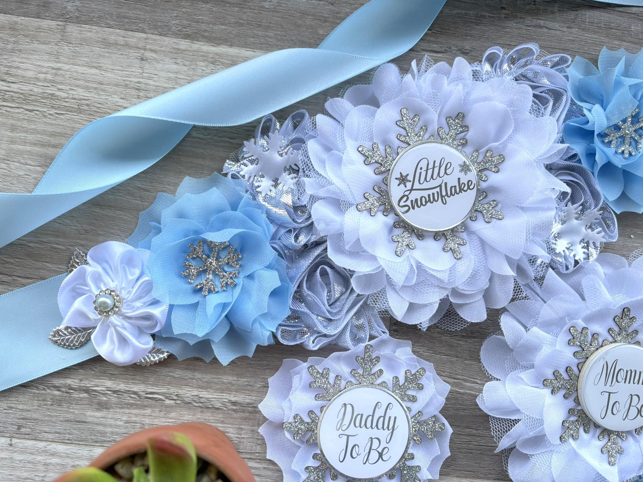 Boy Snowflake Baby Shower Set, Blue White Maternity Sash, Snowflake Mommy To Be Pin, Daddy To Be Pin, Custom Order Welcome