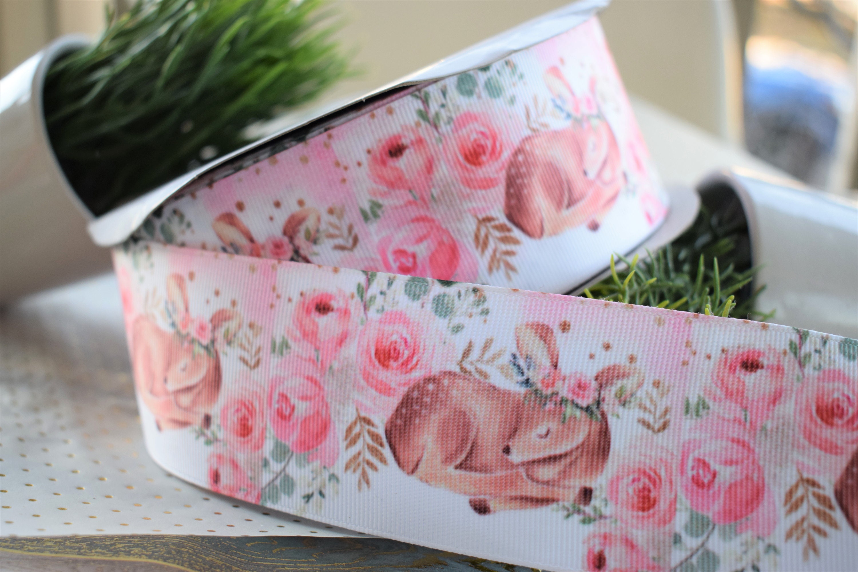 Pink Deer Baby Shower Ribbon, Girl Baby Deer Ribbon, Pink Grey Deer Ribbon, Deer Printed Grosgrain, Deer Baby Shower, 2" (50mm)