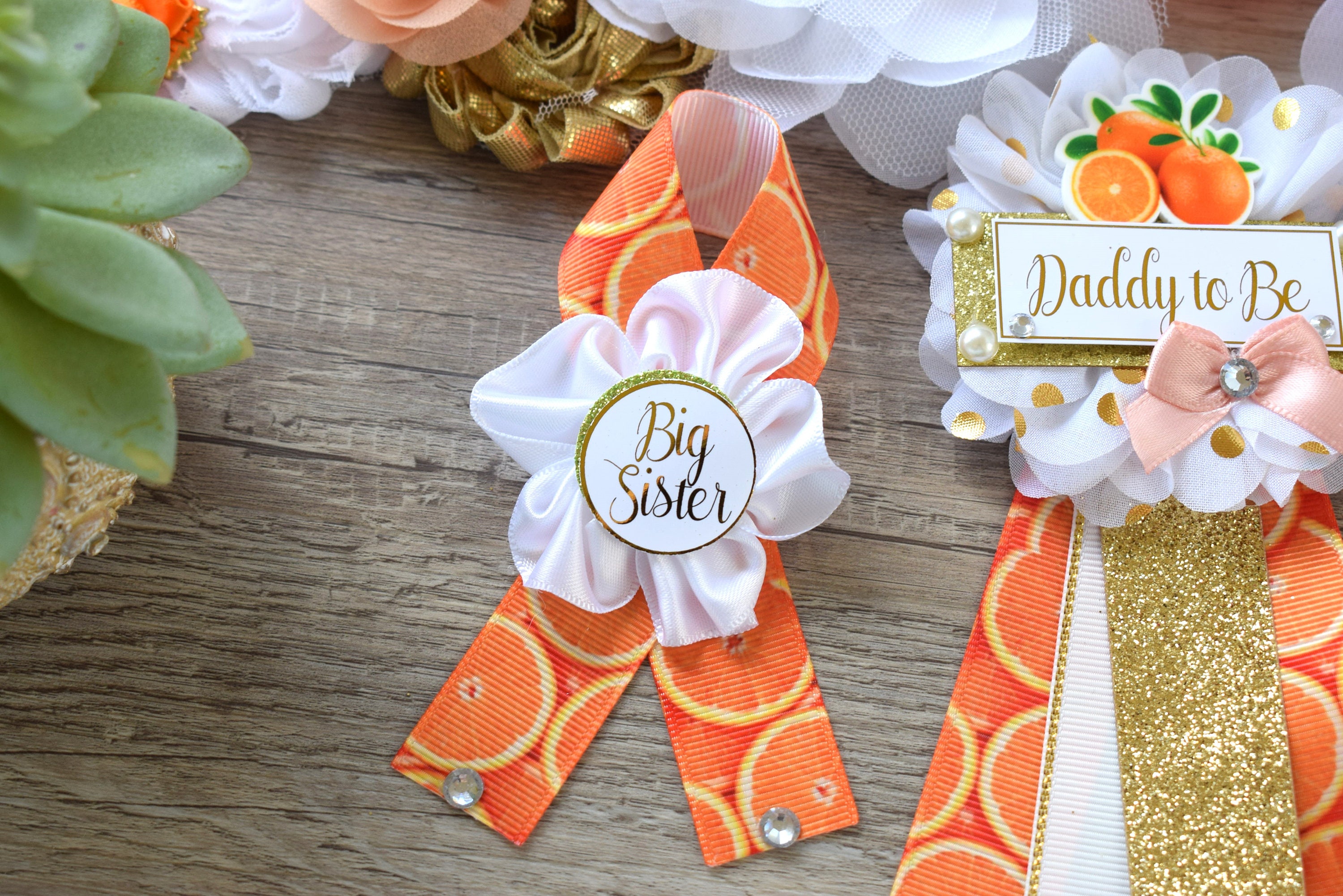 Orange Baby Shower, A Little Cutie Is On The Way, Fruit Orange Maternity Sash, Mommy To Be Ribbon Pin, Daddy To Be Ribbon, Baby Shower Gift