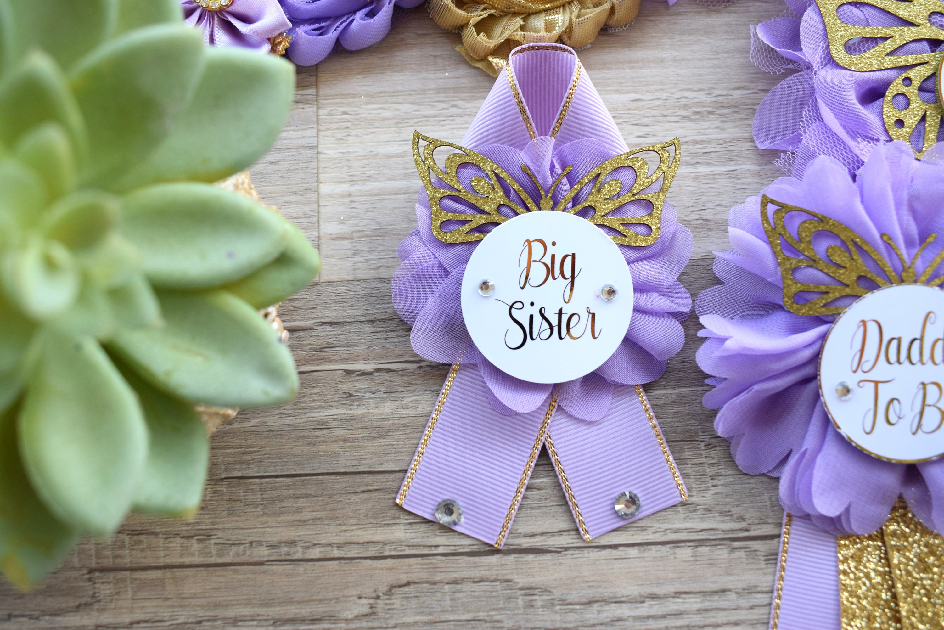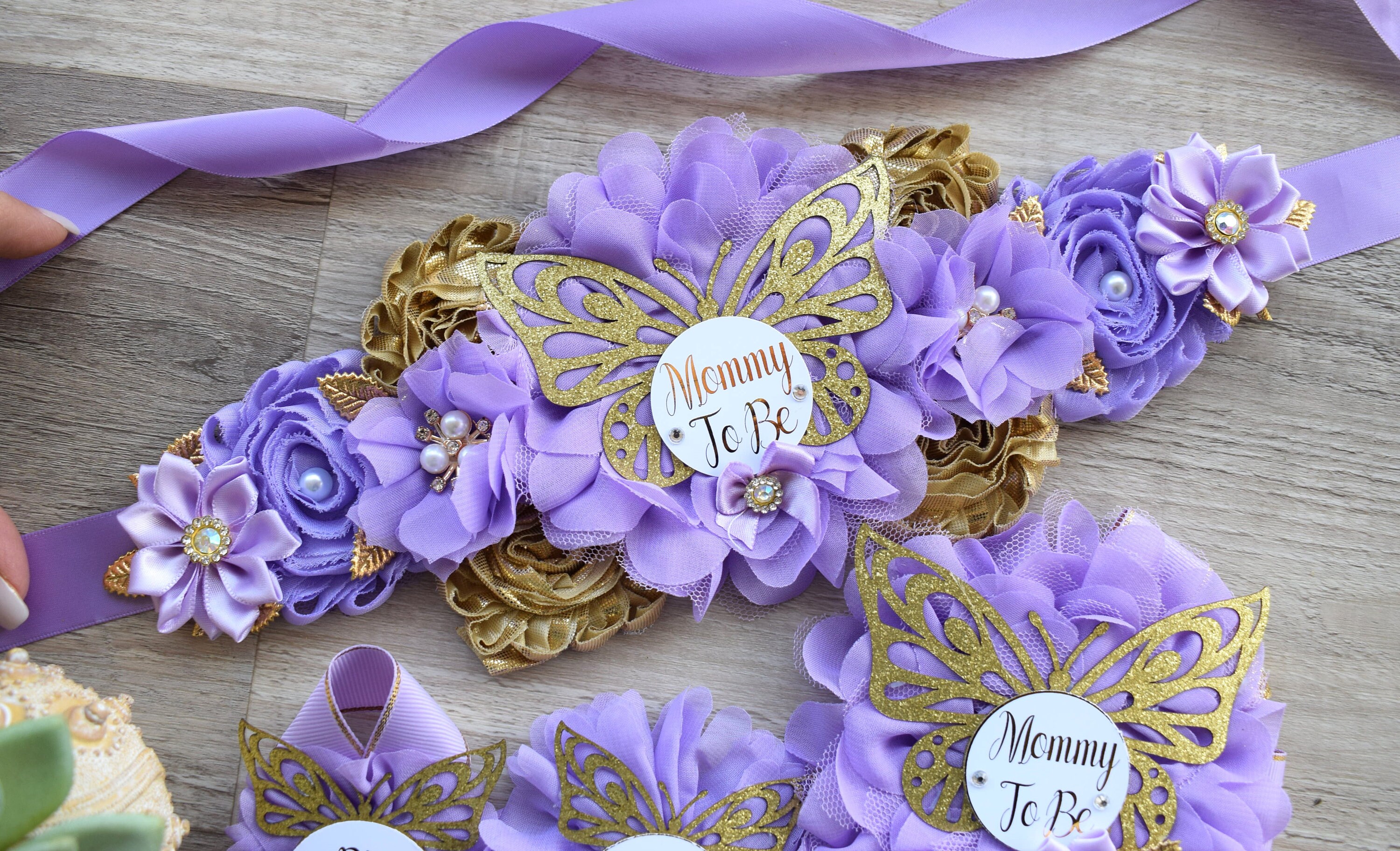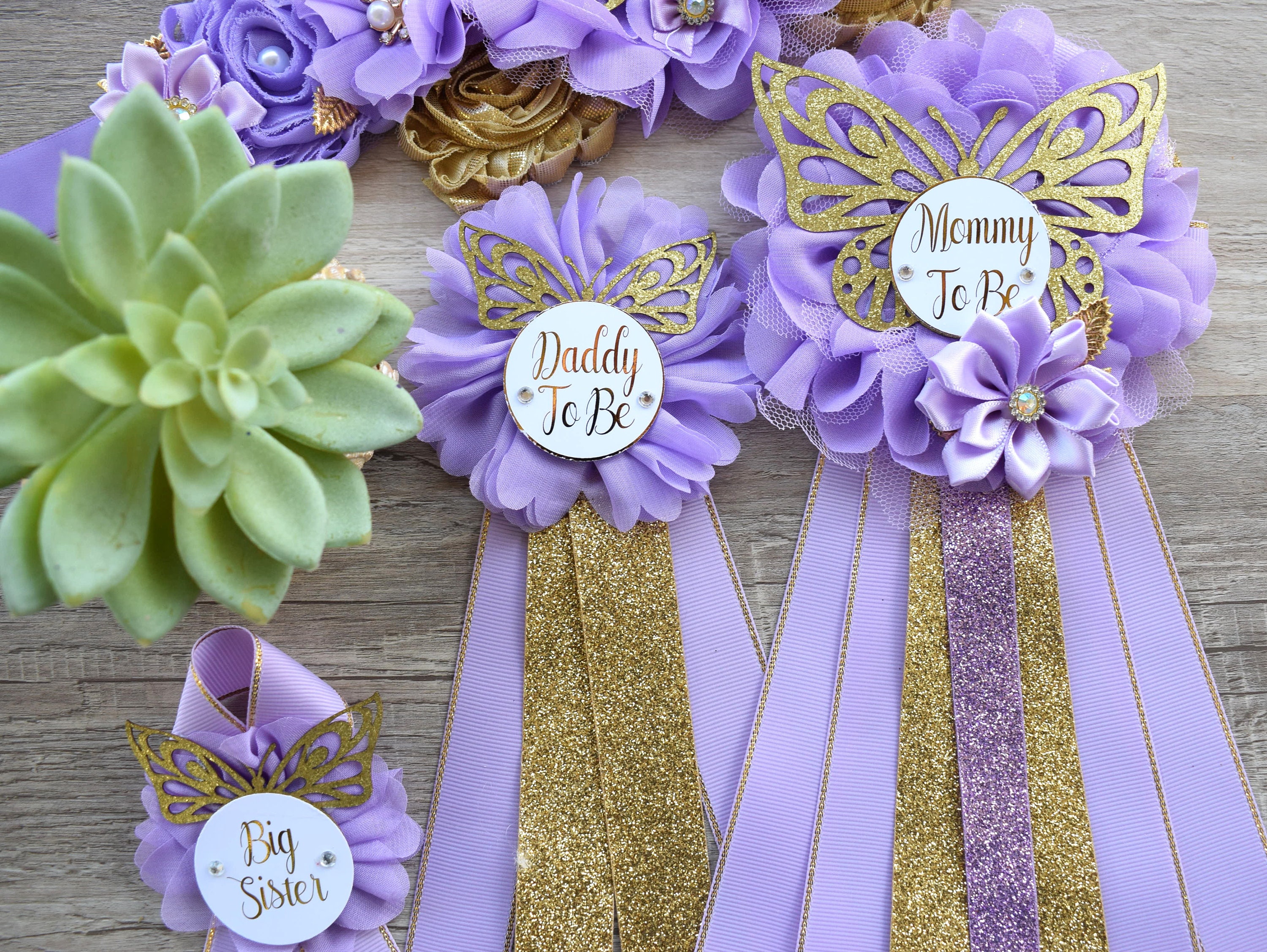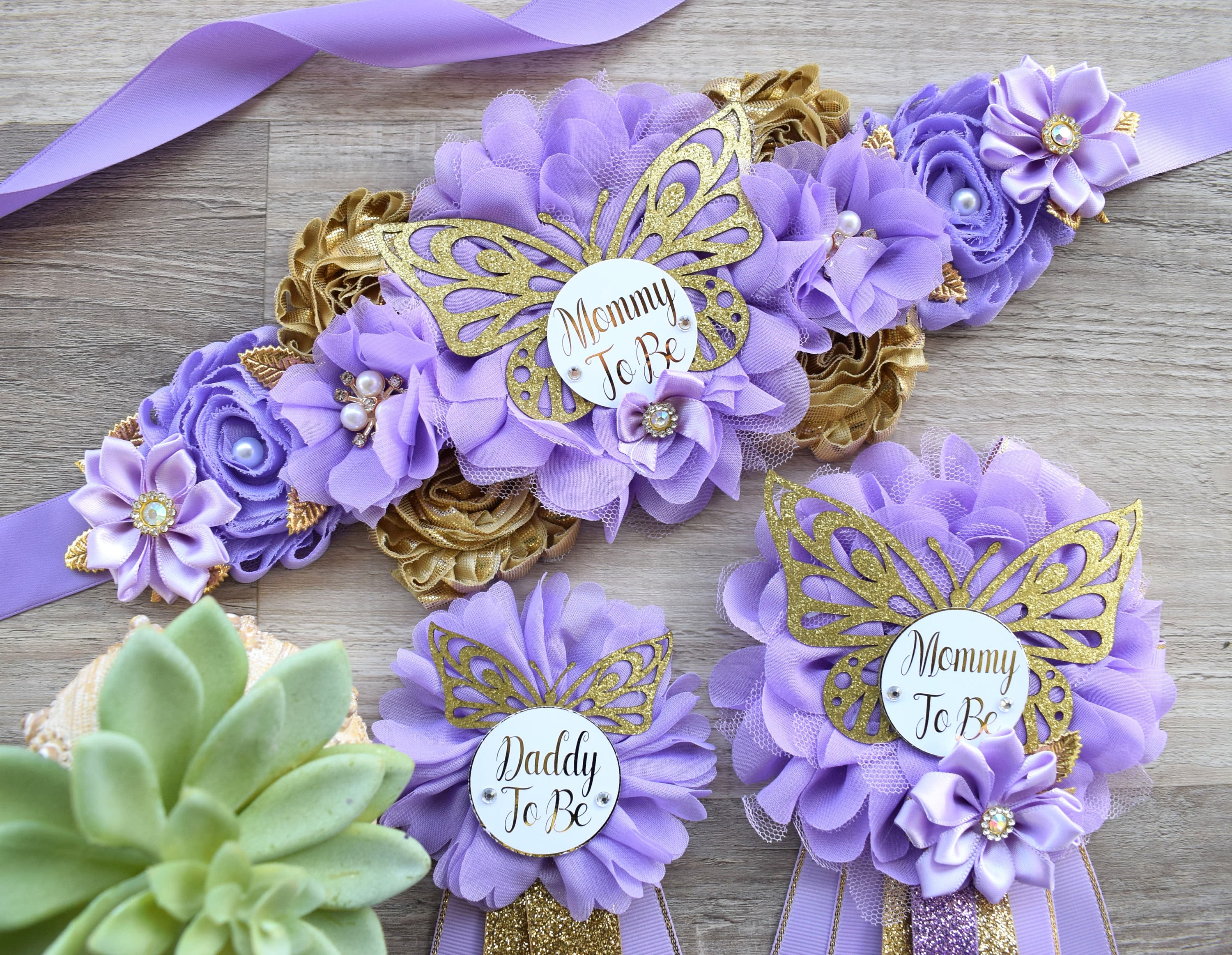 Lavender Butterfly Baby Shower, Butterfly Maternity Belly Sash, Gold Butterfly Mommy To Be Ribbon, Lilac Butterfly Daddy To Be Pin, Custom