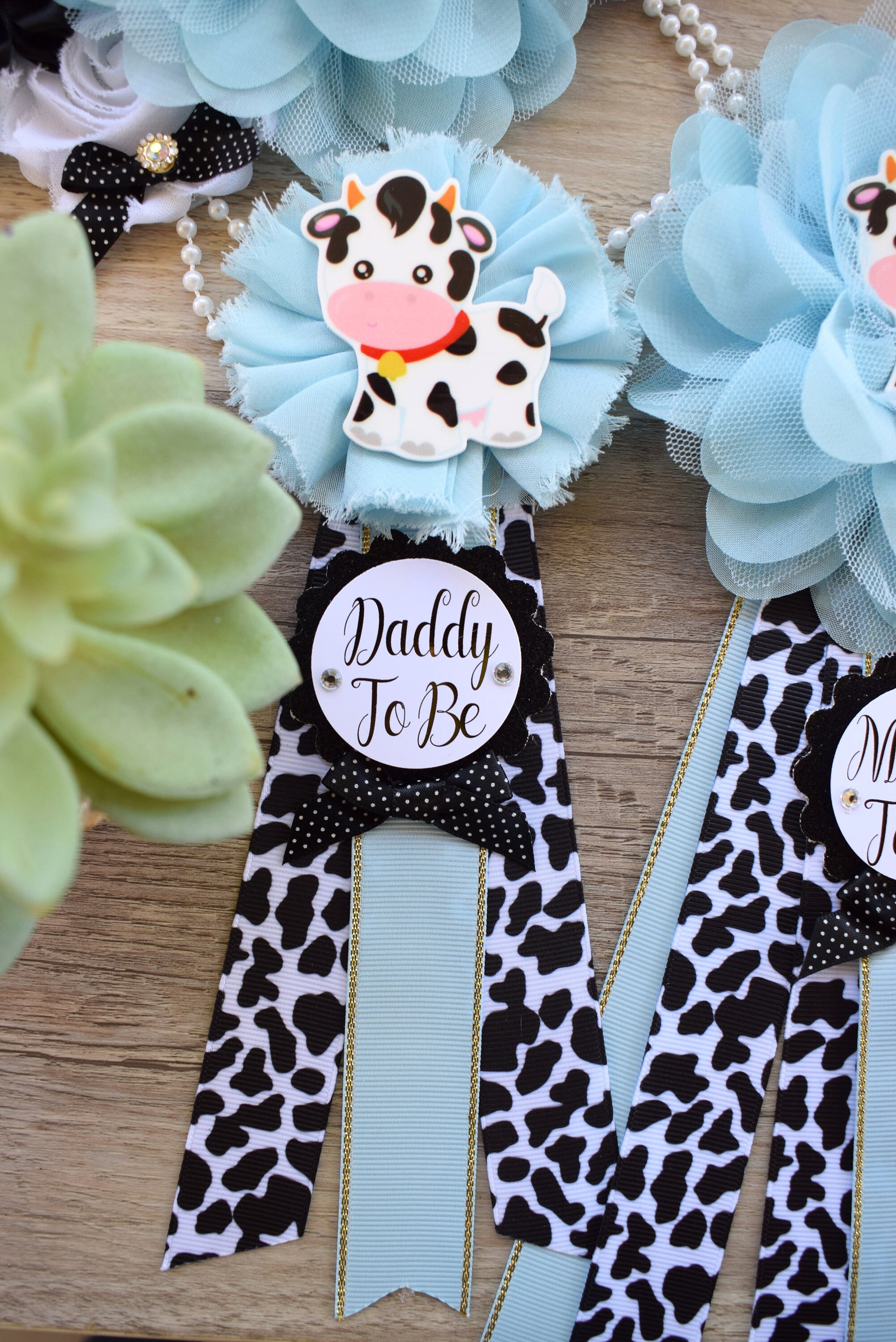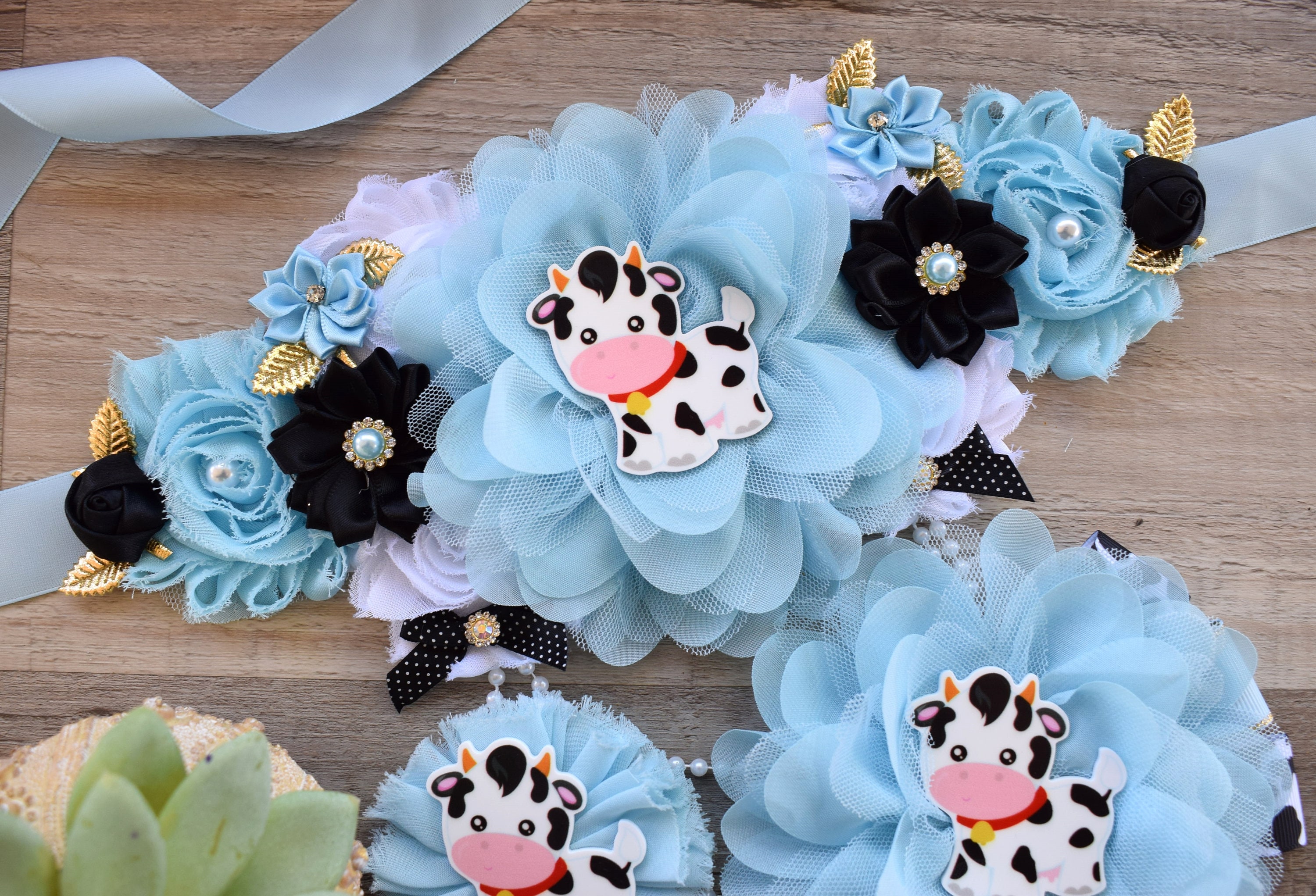 Blue Cow Baby Shower, Boy Cow Maternity Sash, Farm Boy Cow Mommy and Daddy To Be Pin, Blue Black White Flower Sash, Baby Shower
