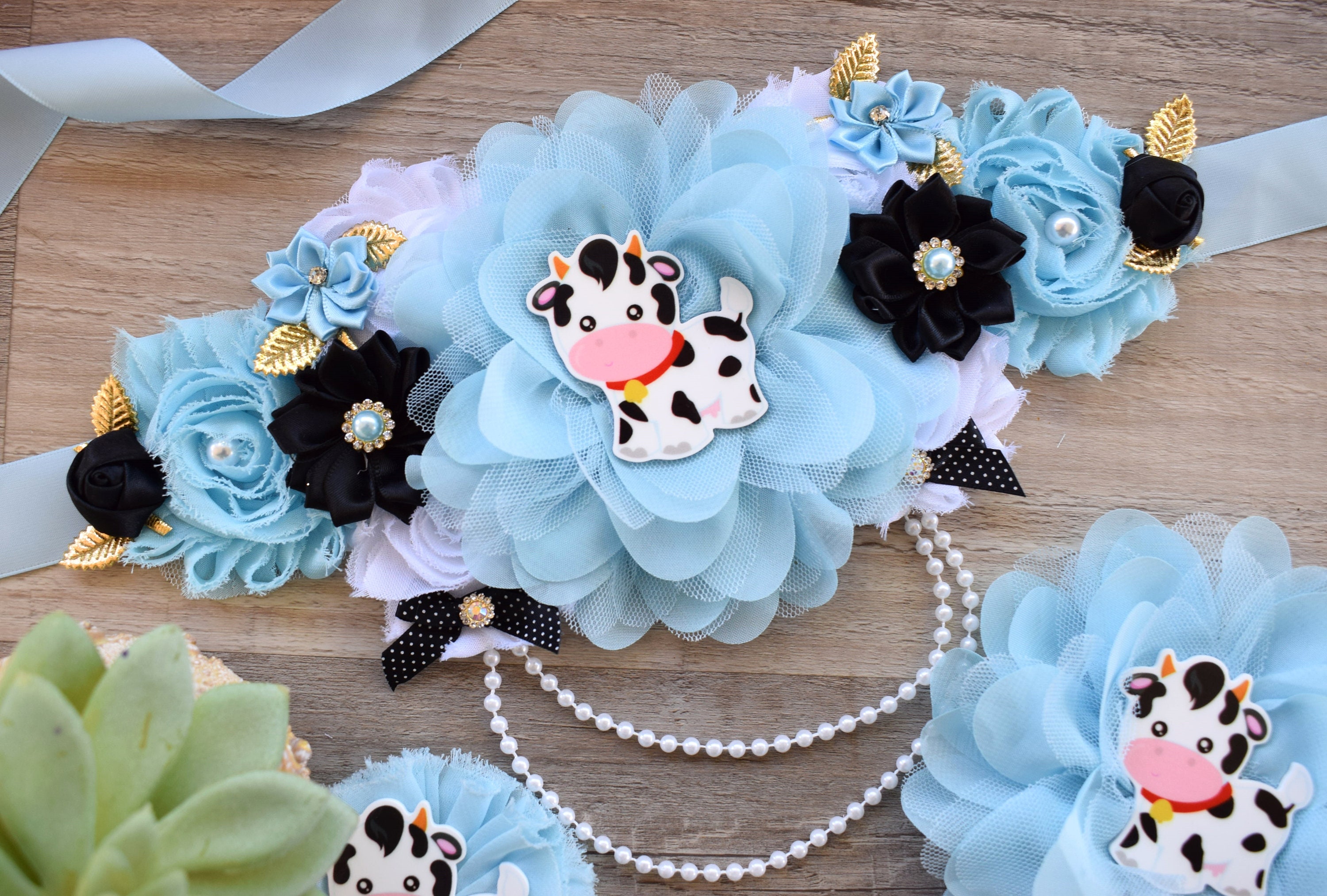 Blue Cow Baby Shower, Boy Cow Maternity Sash, Farm Boy Cow Mommy and Daddy To Be Pin, Blue Black White Flower Sash, Baby Shower