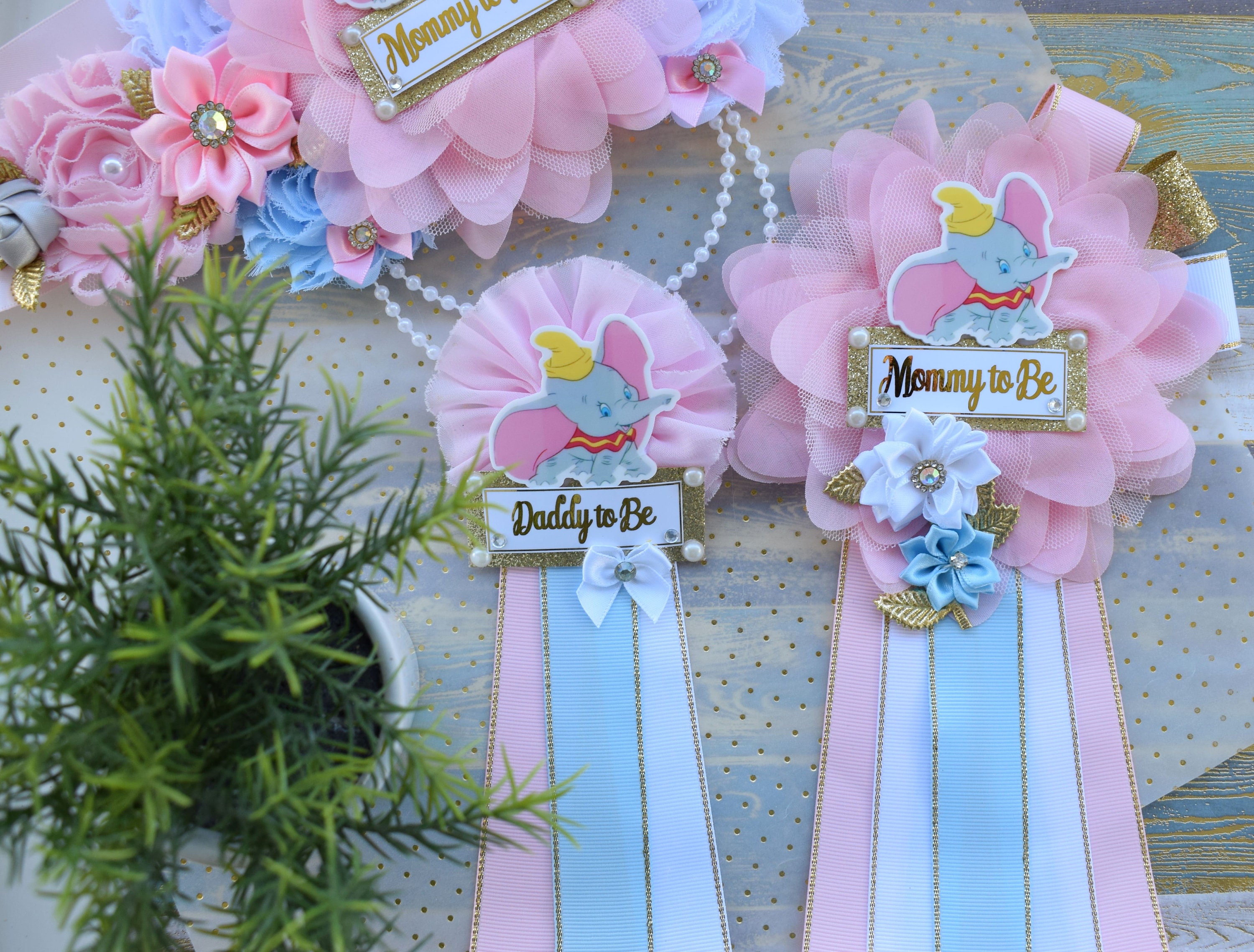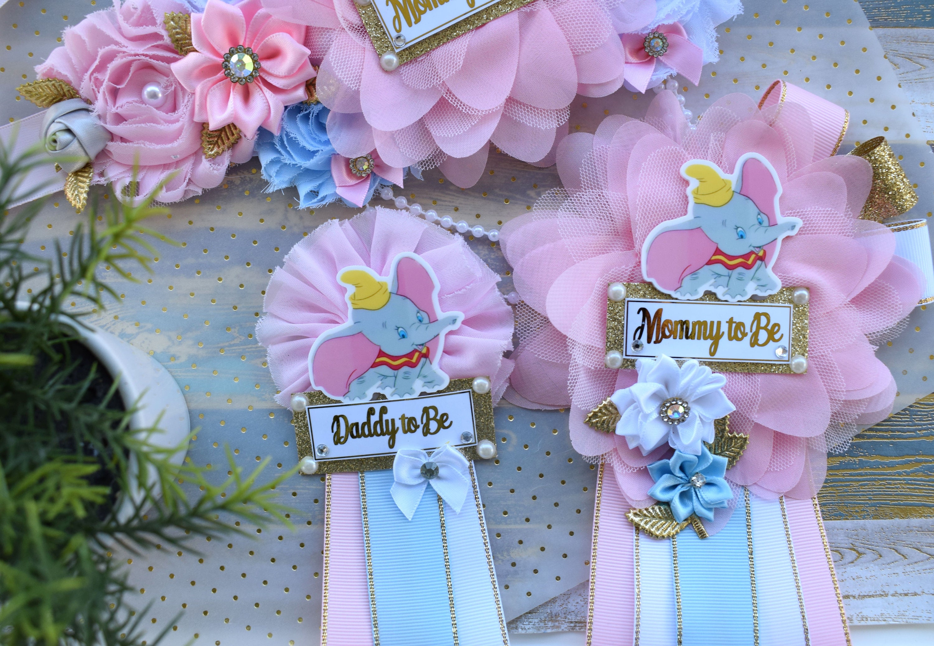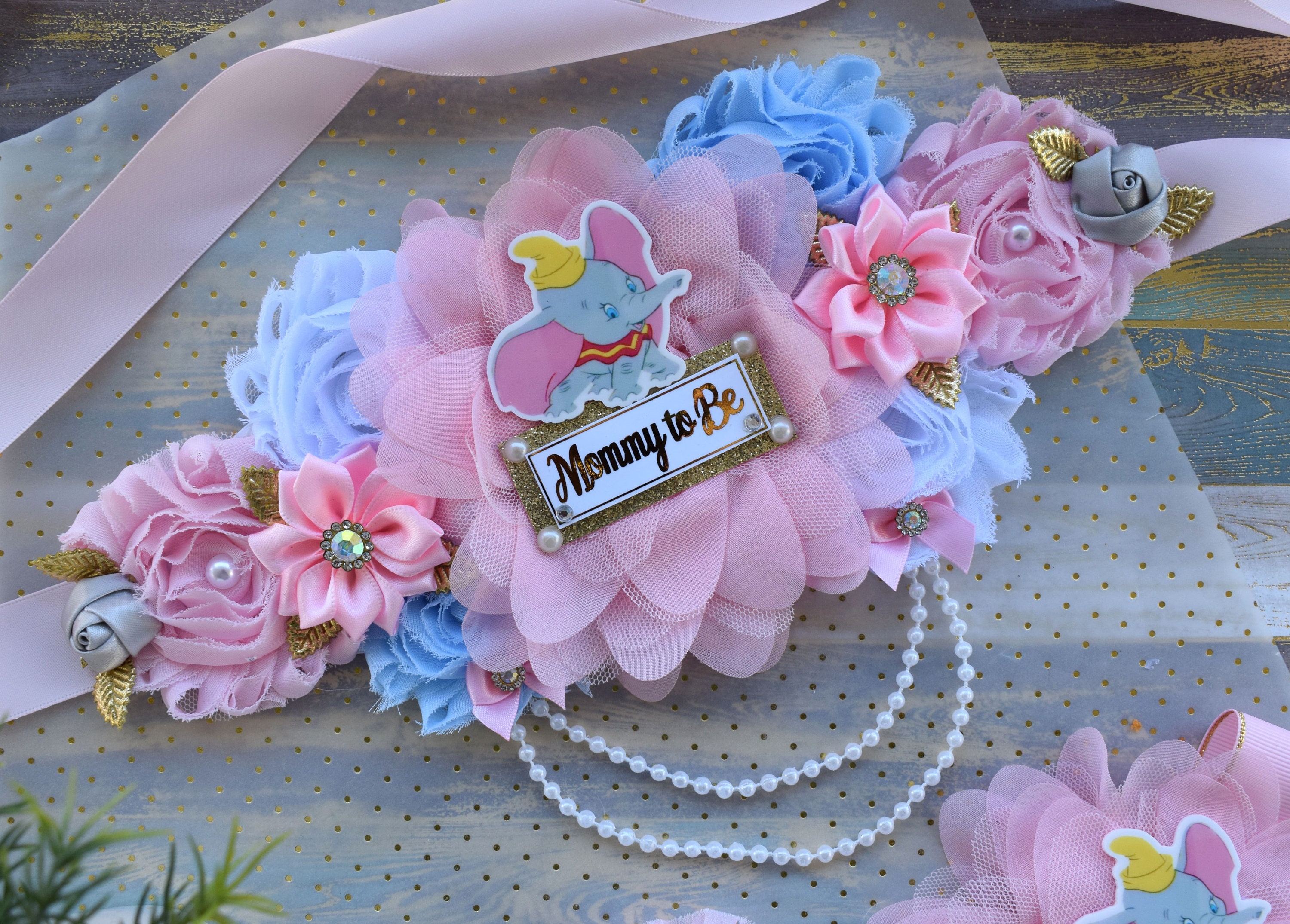 This Gorgeous Elephant Sash & Pins Set was made especially for a Baby Shower or a Photo Prop.
