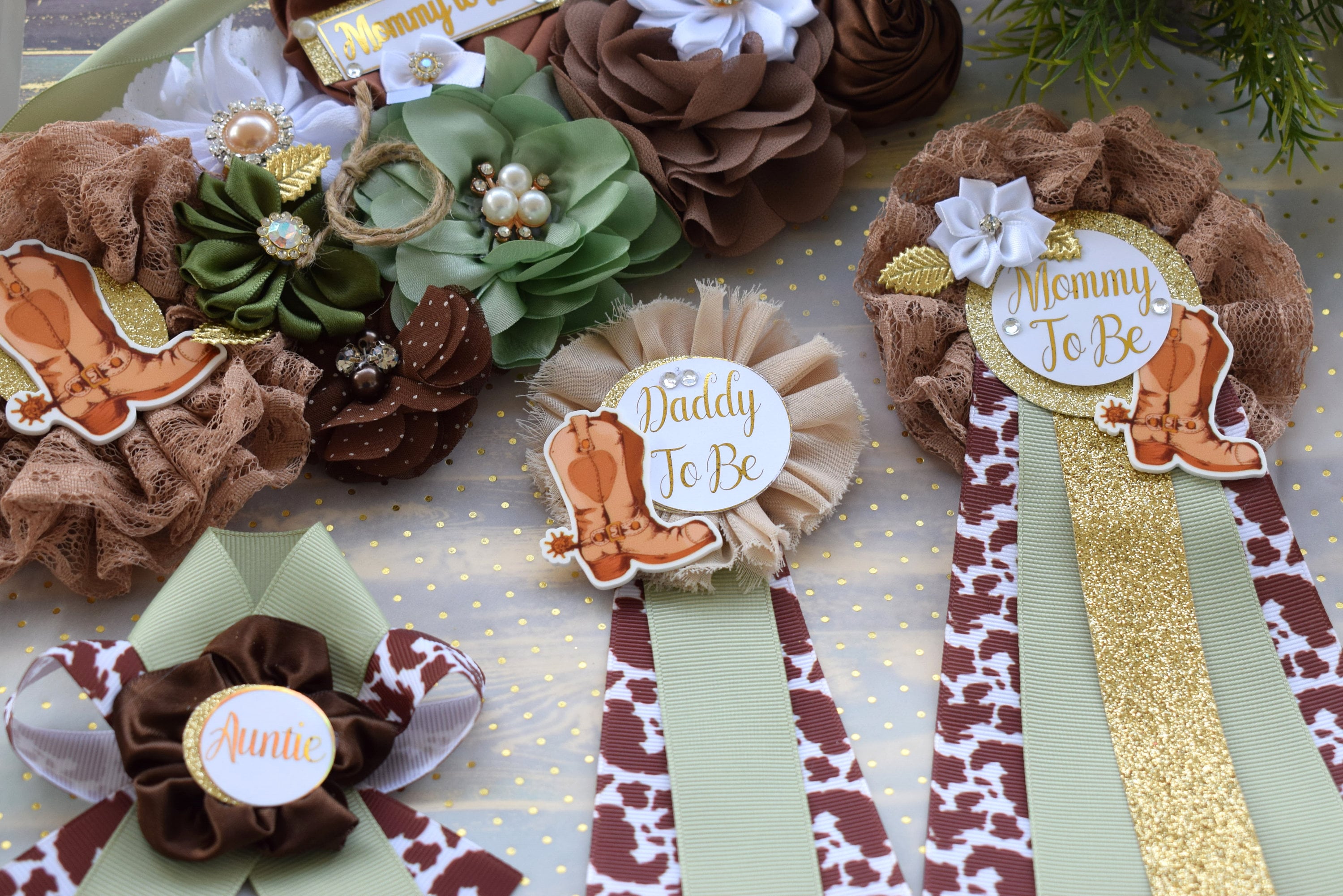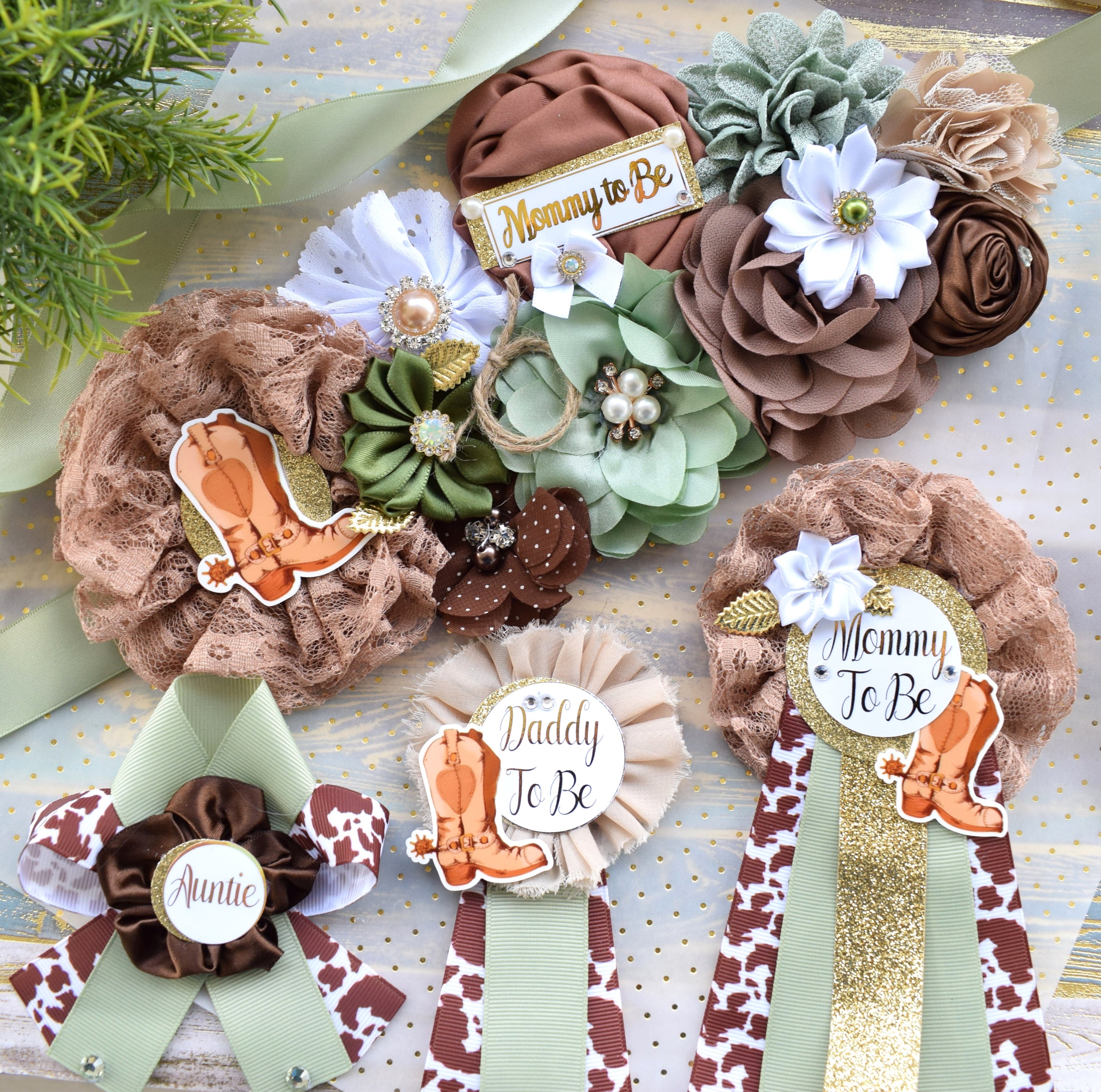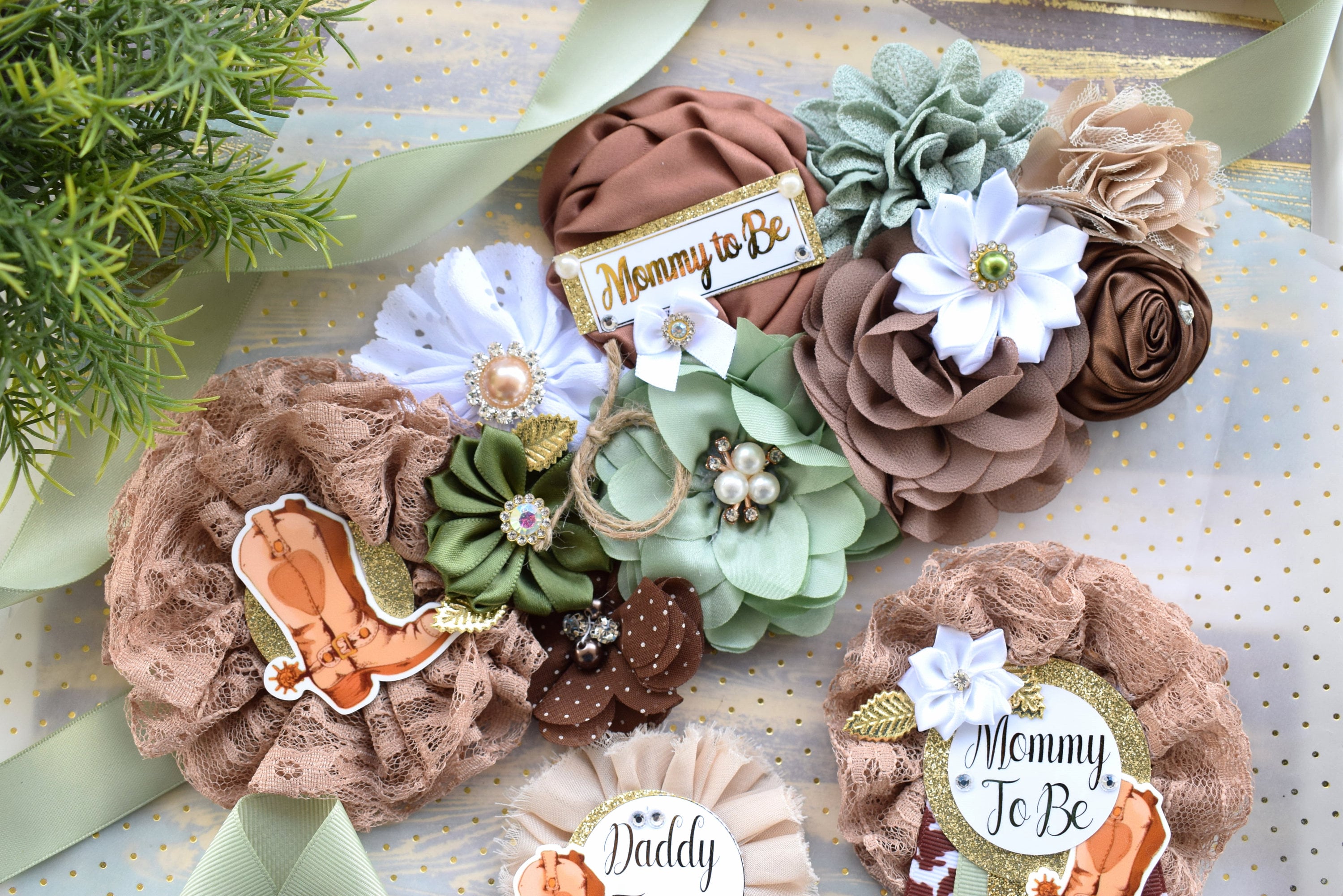 Sage Cowboy Baby Shower, Sage Cowboy Maternity Sash, Boy Cowboy Mommy and Daddy To Be Pin, Sage Brown Flower Sash, Sage Boot Hat Corsage Pin