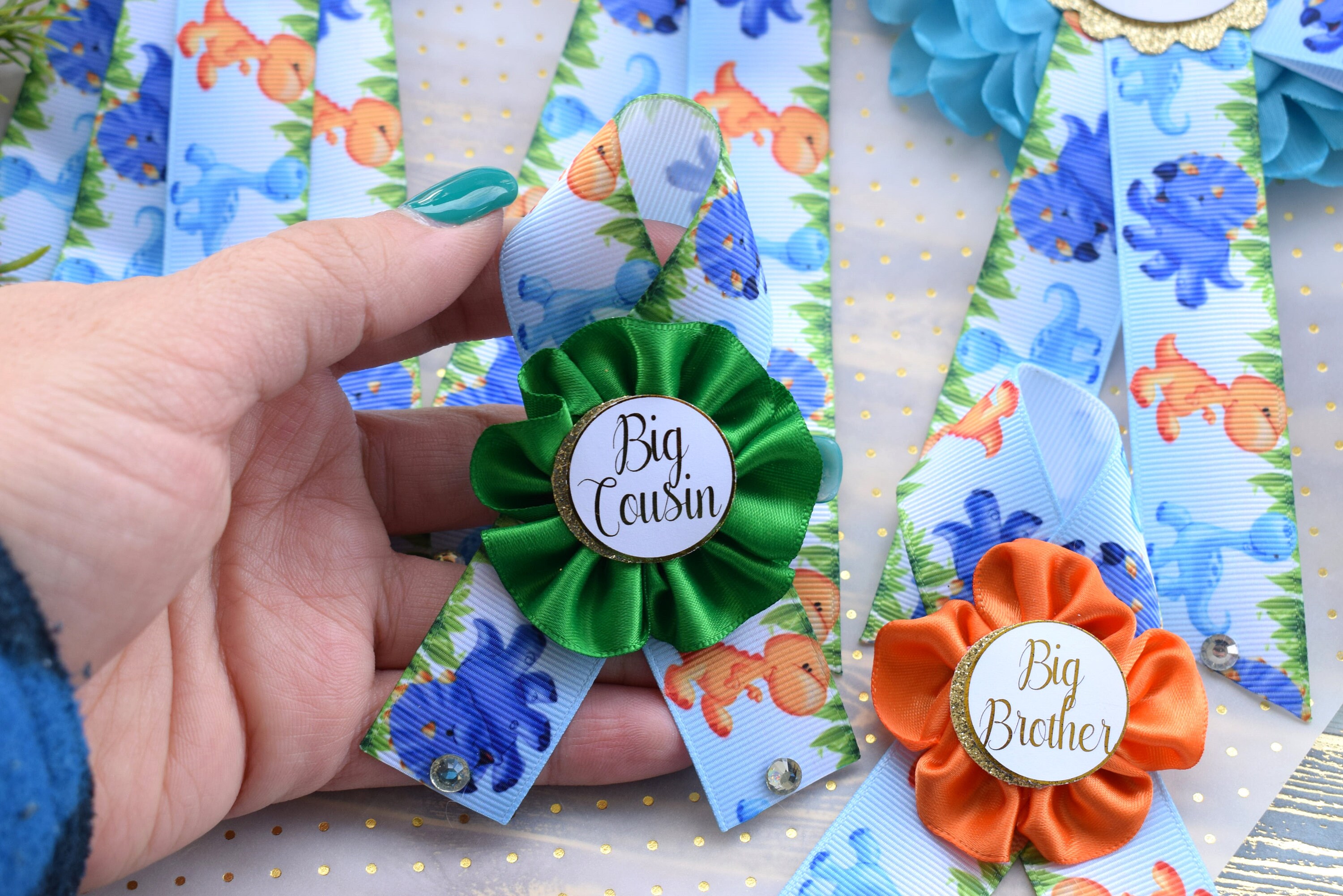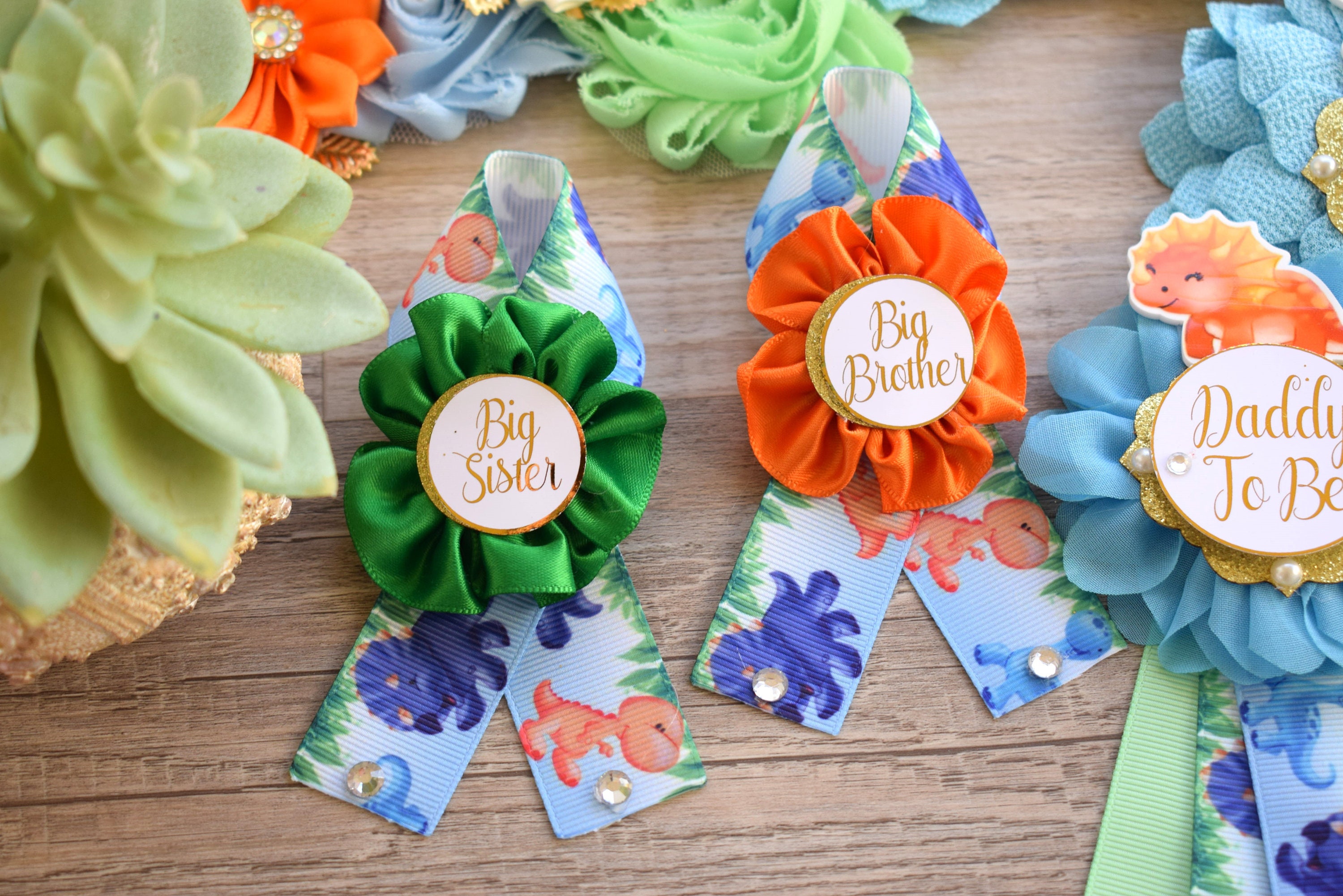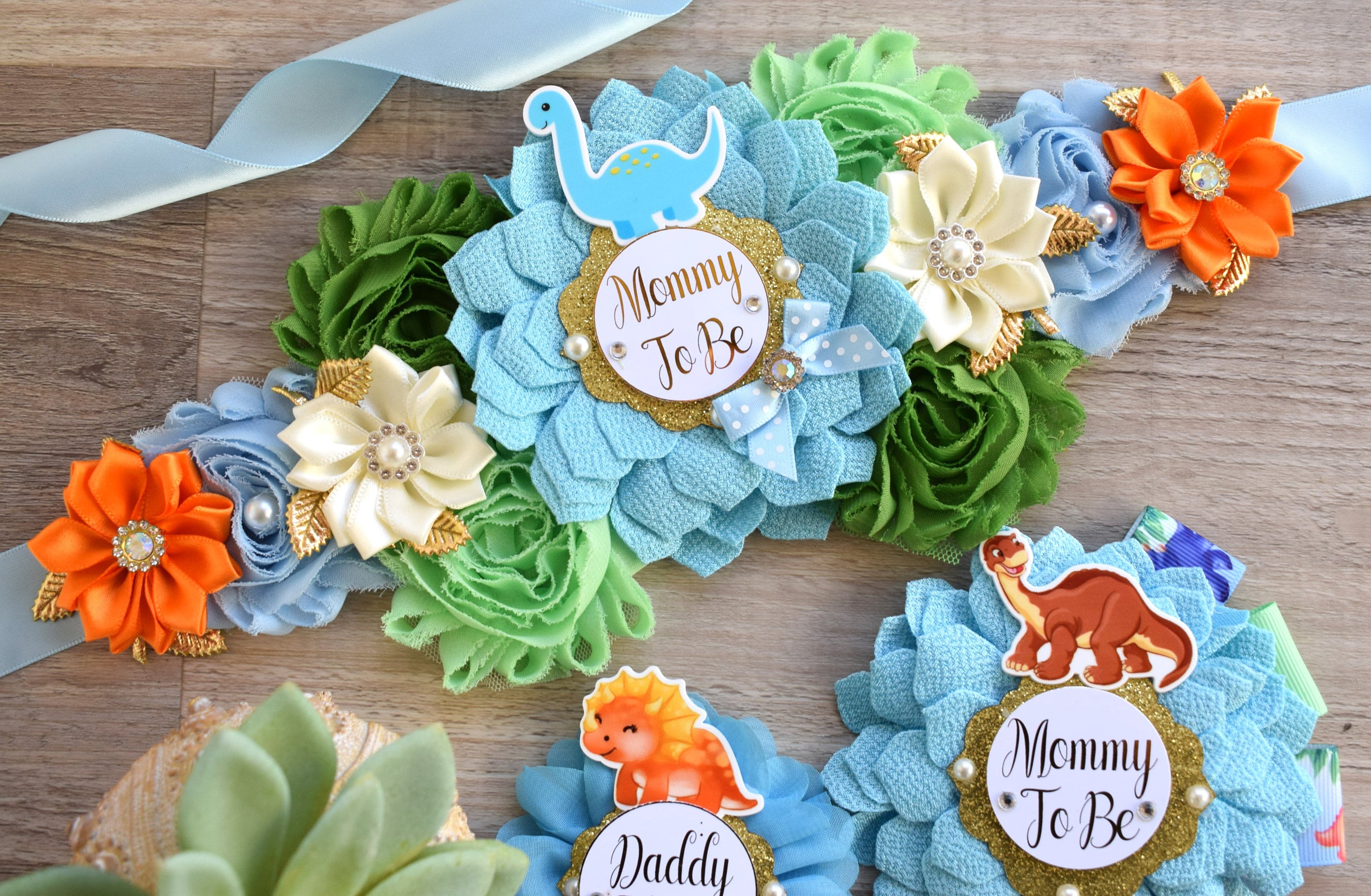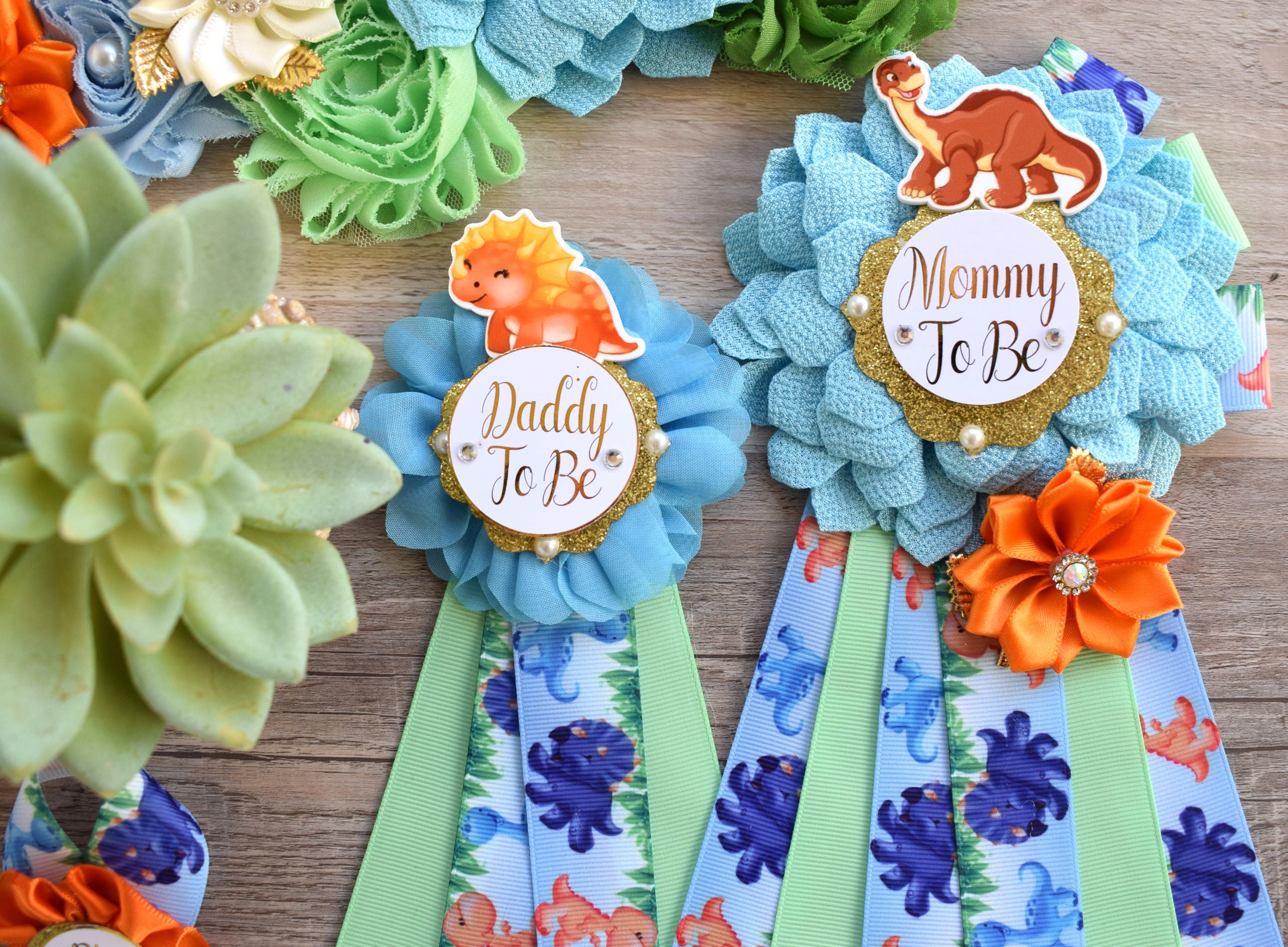 Dinosaur Baby Shower, Dinosaur Corsage Pin Set, Dinosaur Mommy to Be, Dinosaur Daddy to Be, Mamasaurus, Dinosaur Orange Green Blue, Custom