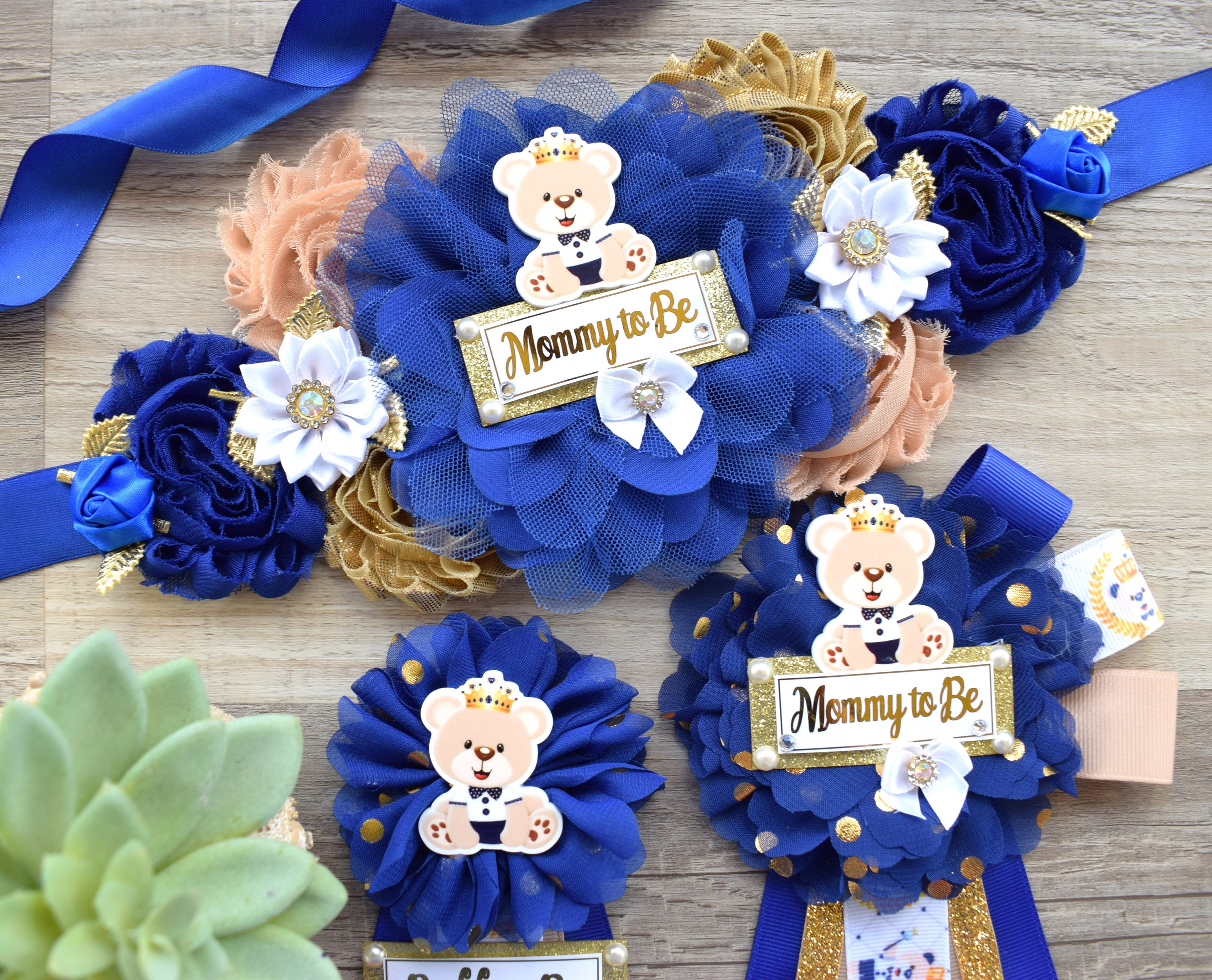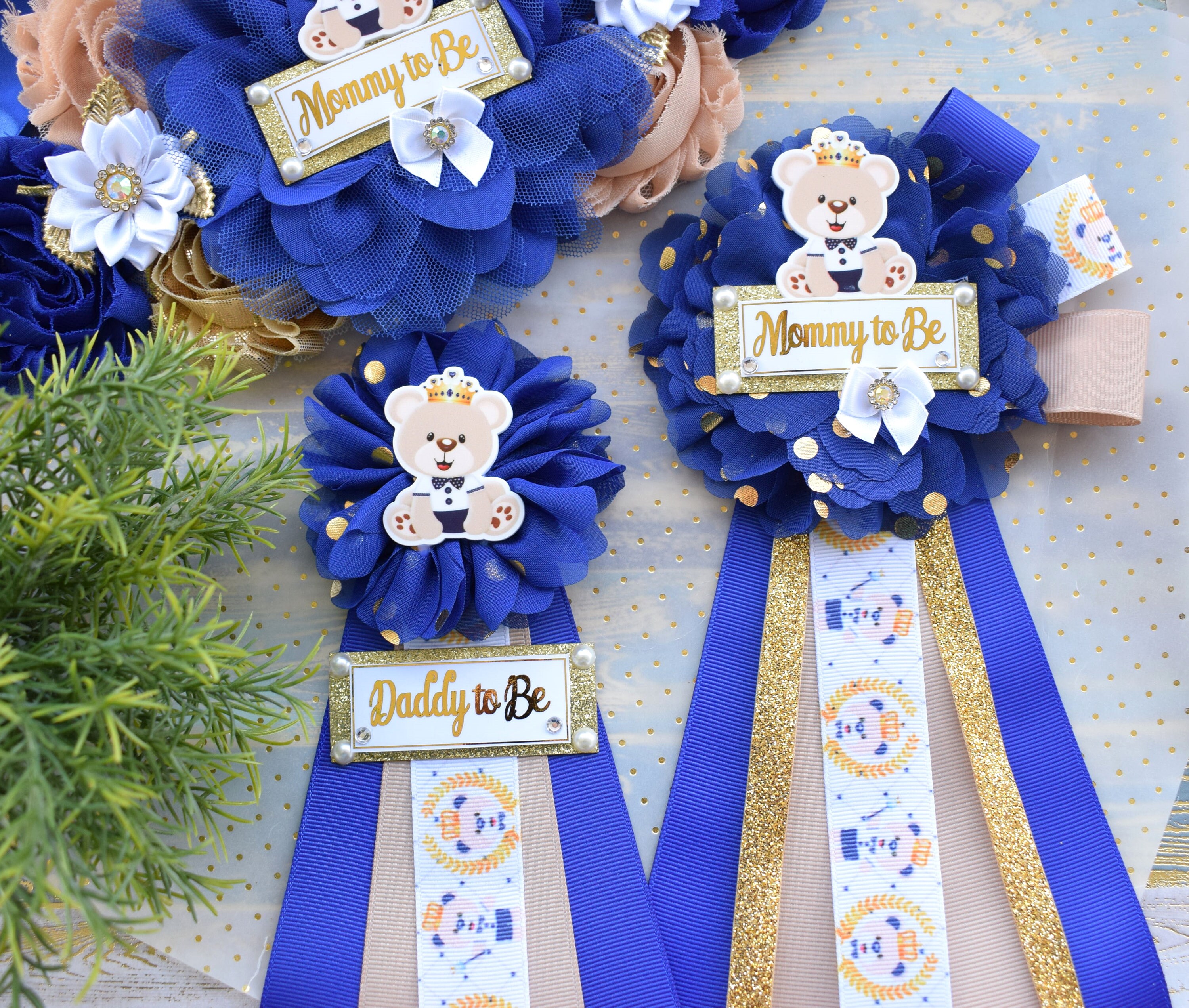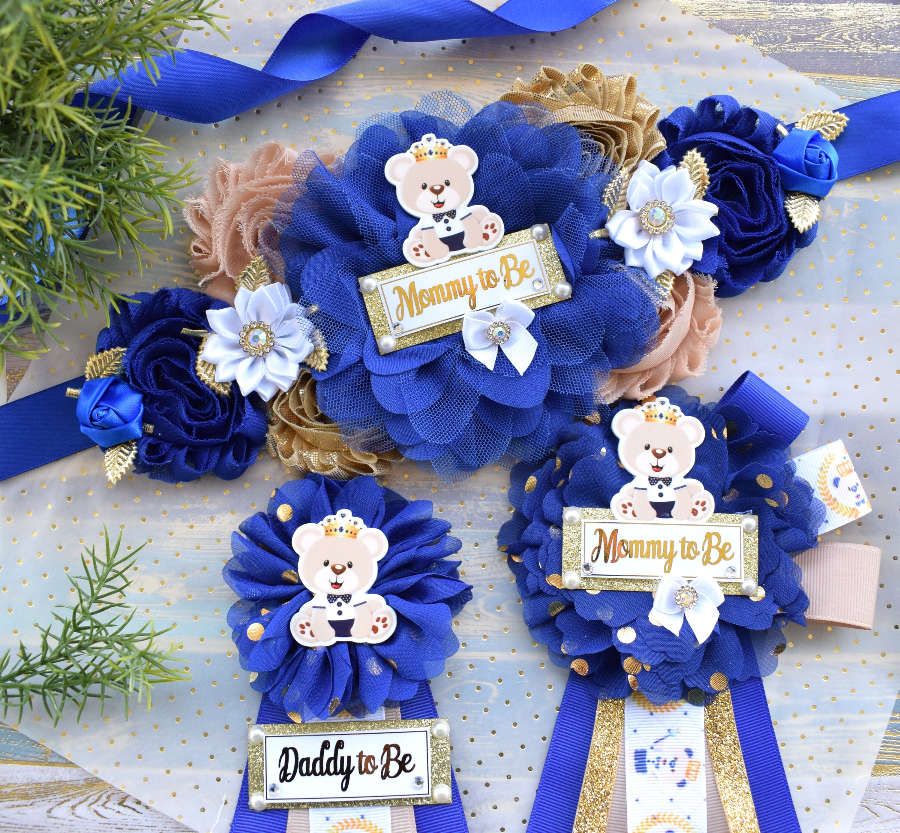 Royal Teddy Bear Baby Shower, Teddy Bear Blue Flower Sash, Crown Teddy Bear Pin, Bear Mommy To Be, Bear Daddy To Be, Royal Bear Baby Shower