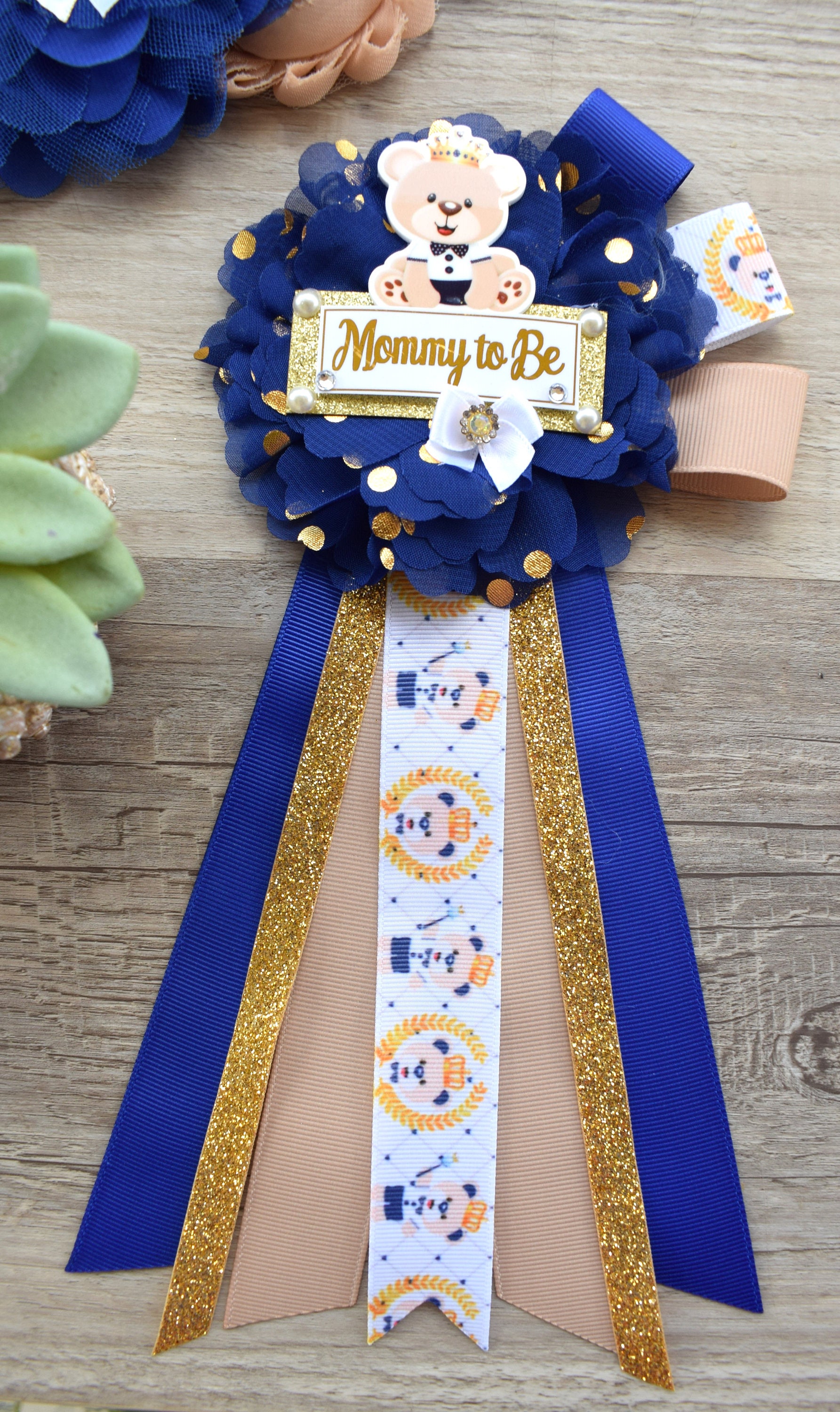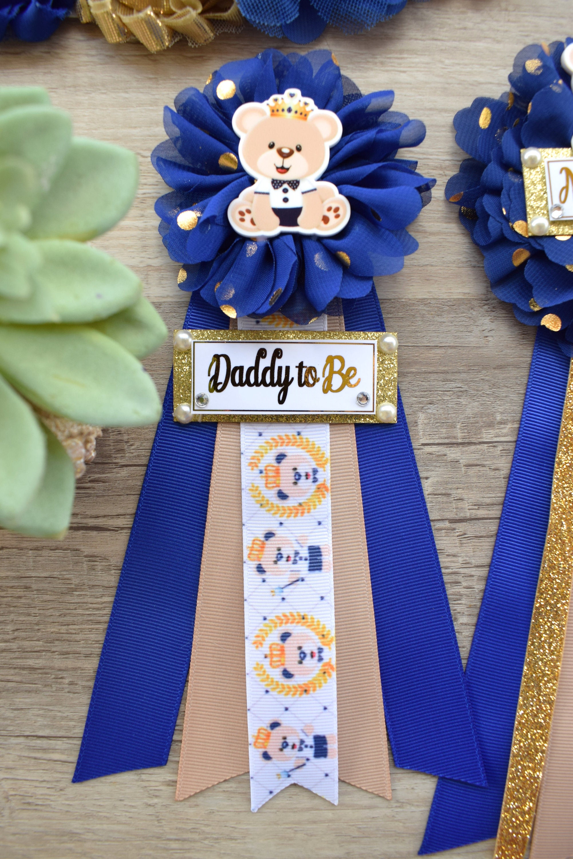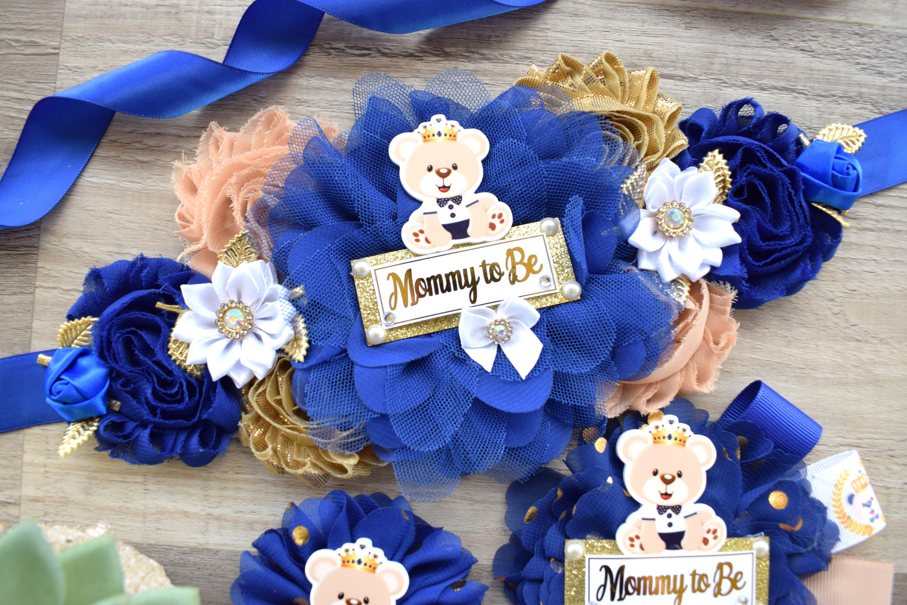Royal Teddy Bear Baby Shower, Teddy Bear Blue Flower Sash, Crown Teddy Bear Pin, Bear Mommy To Be, Bear Daddy To Be, Royal Bear Baby Shower