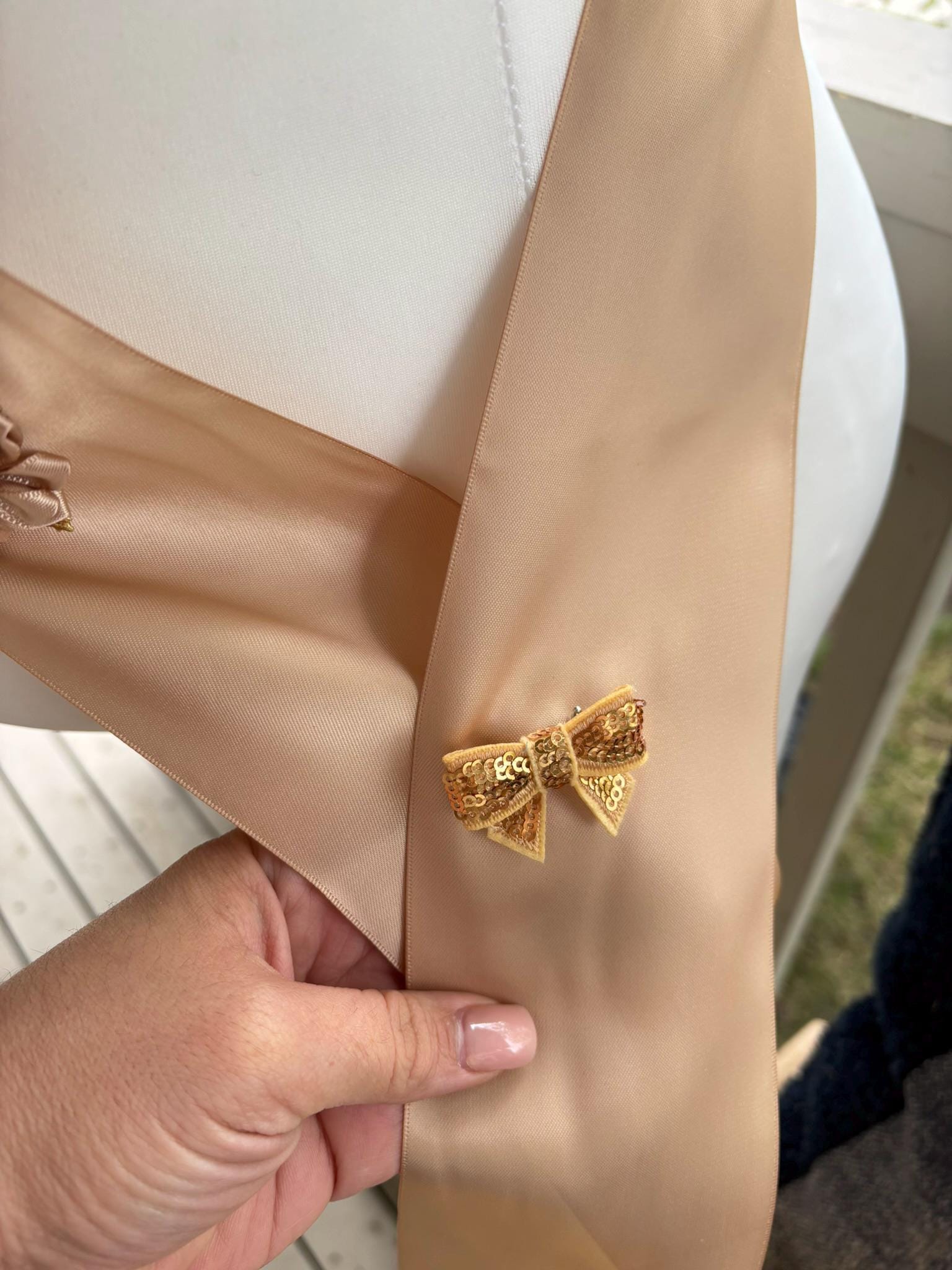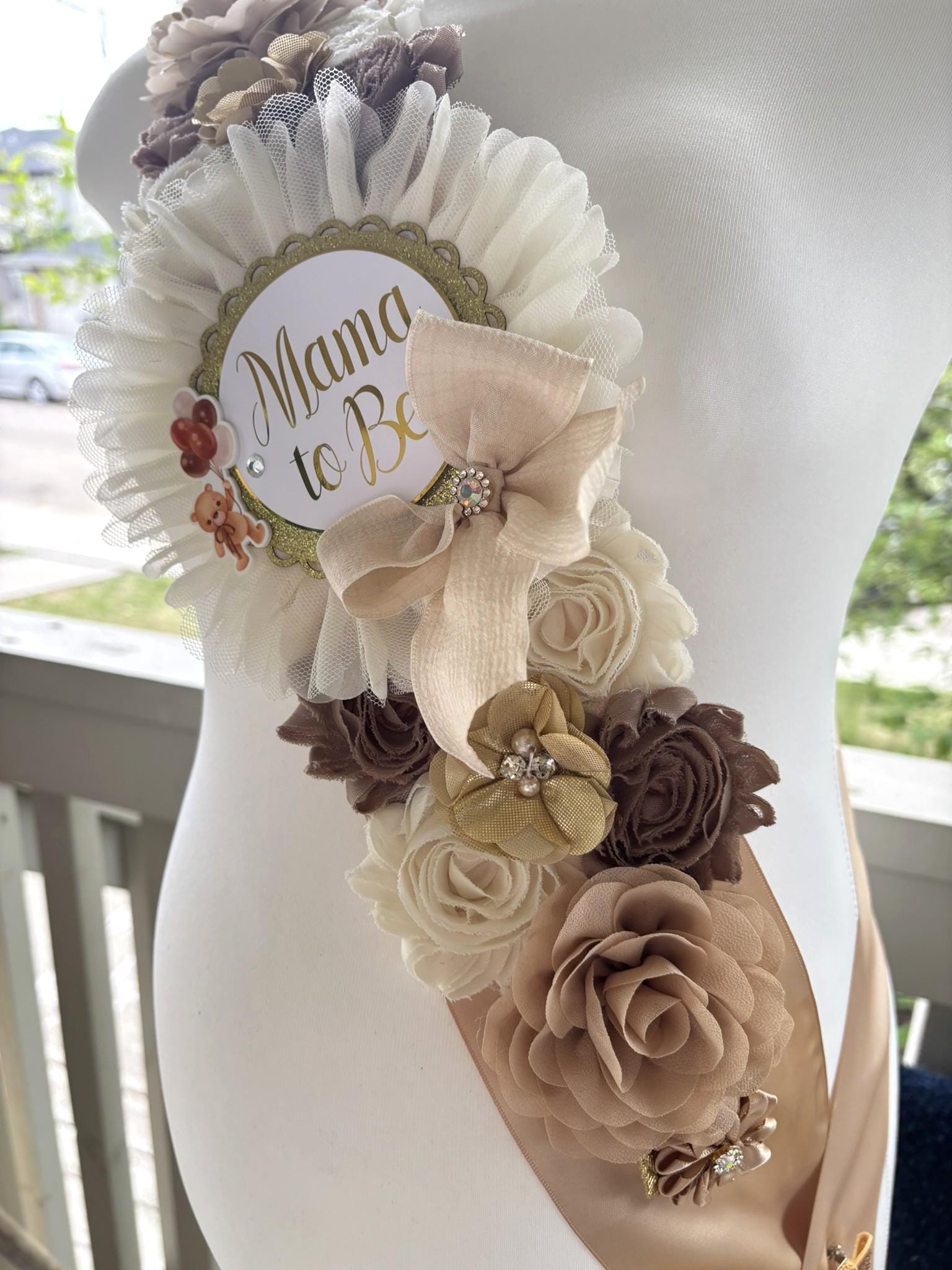 * Maternity Sash: It has thirteen beautiful flowers in beige, tan, ivory & brown colors embellished with rhinestones and pearls. The ribbon sash is 80'' (2 meters) long.