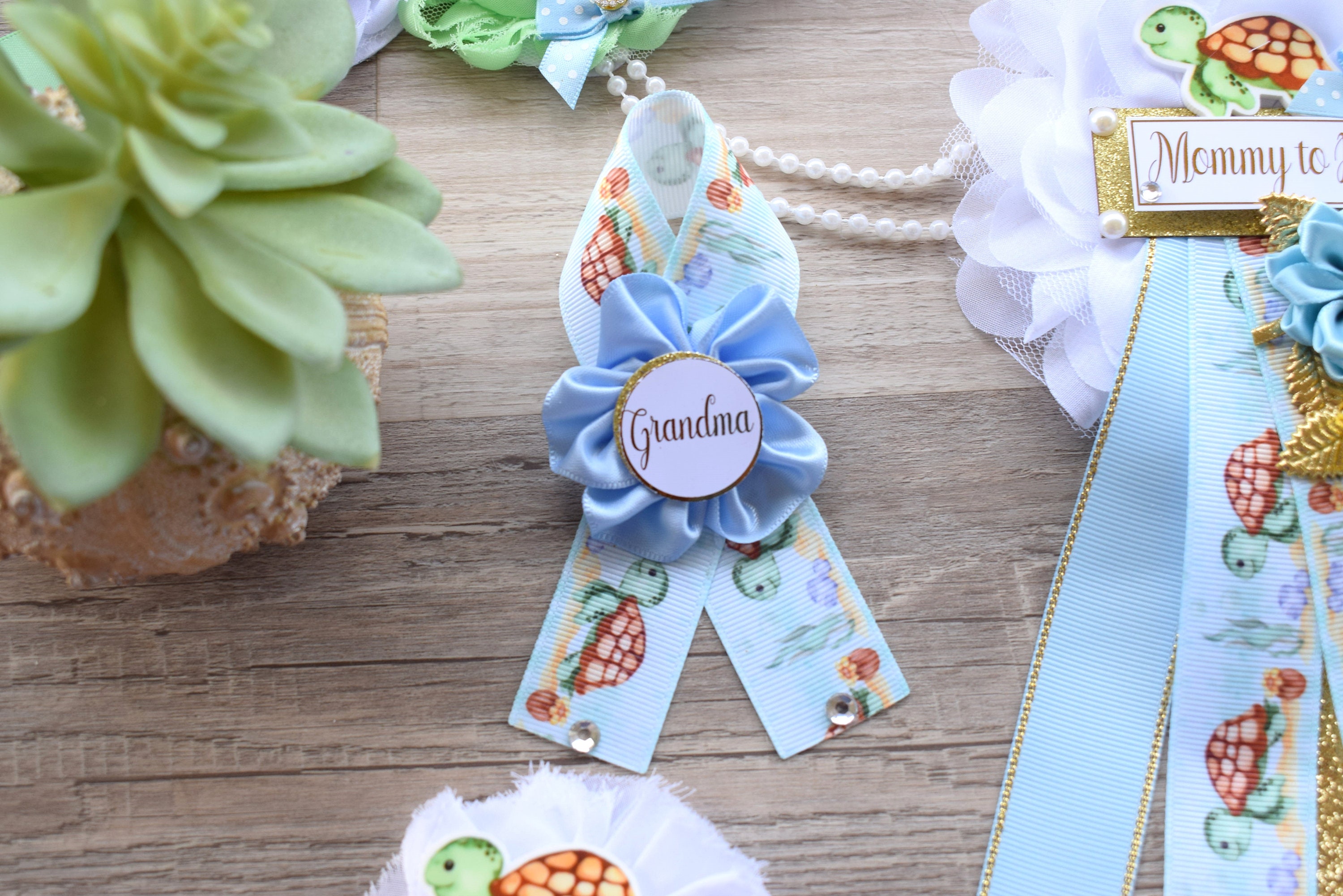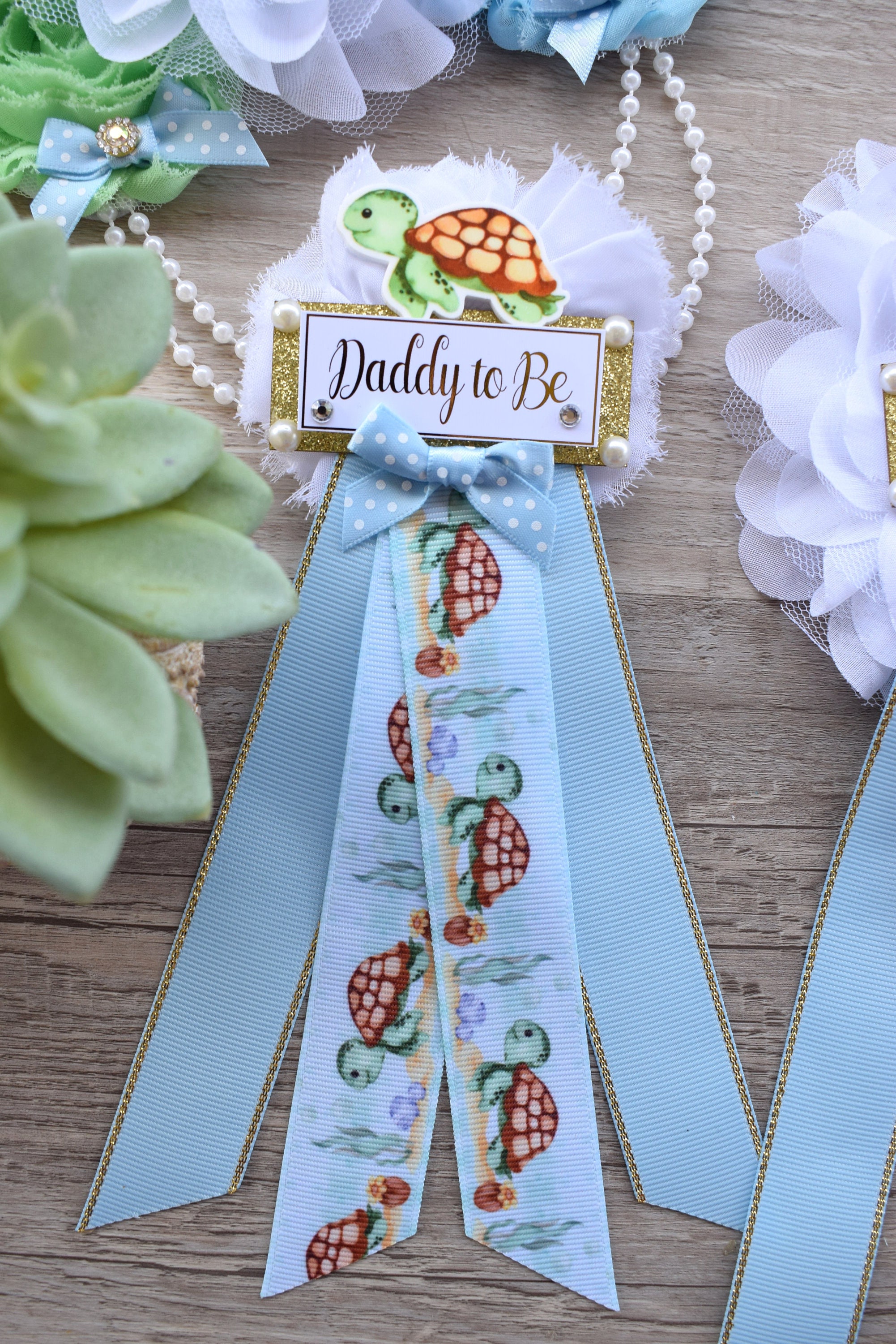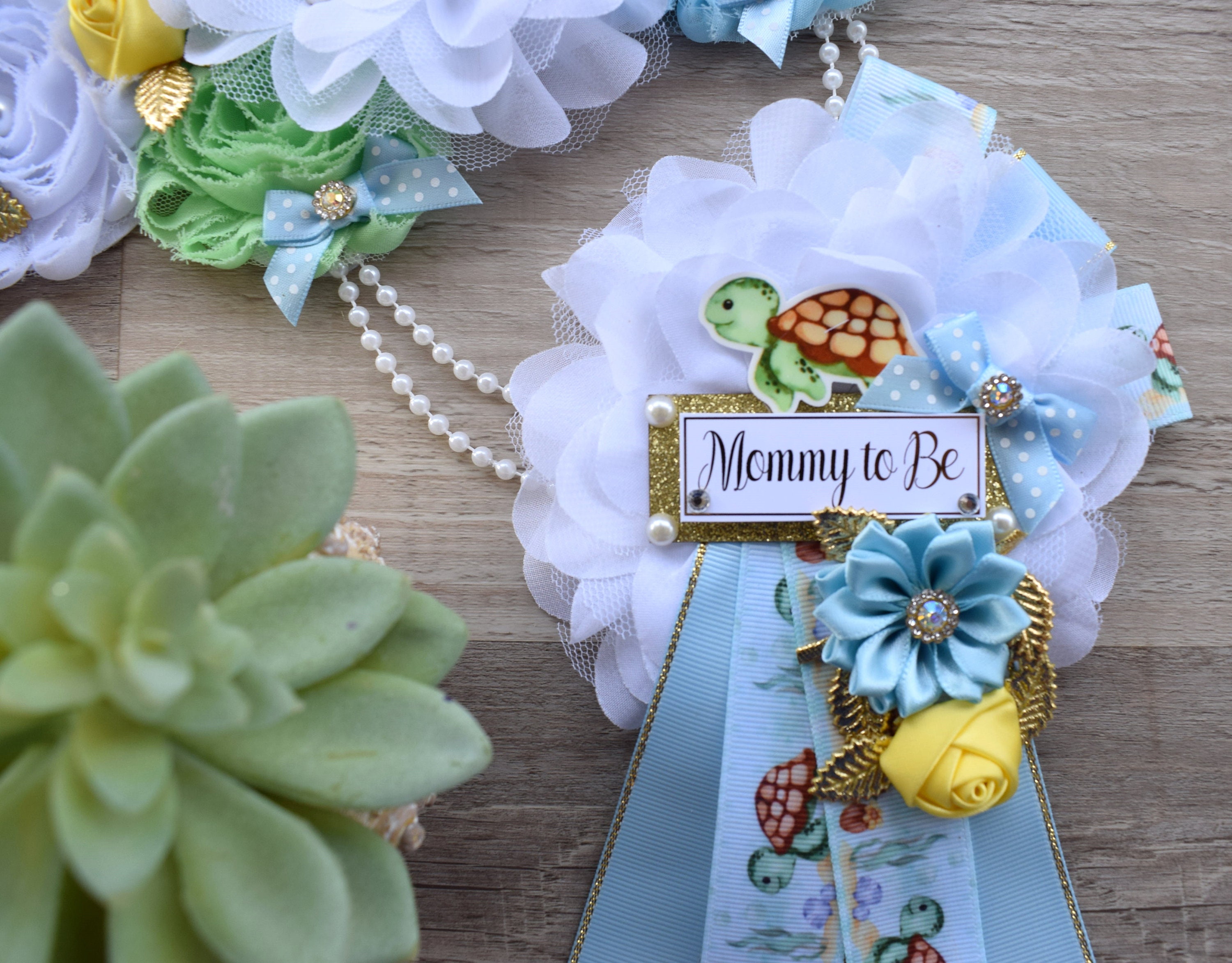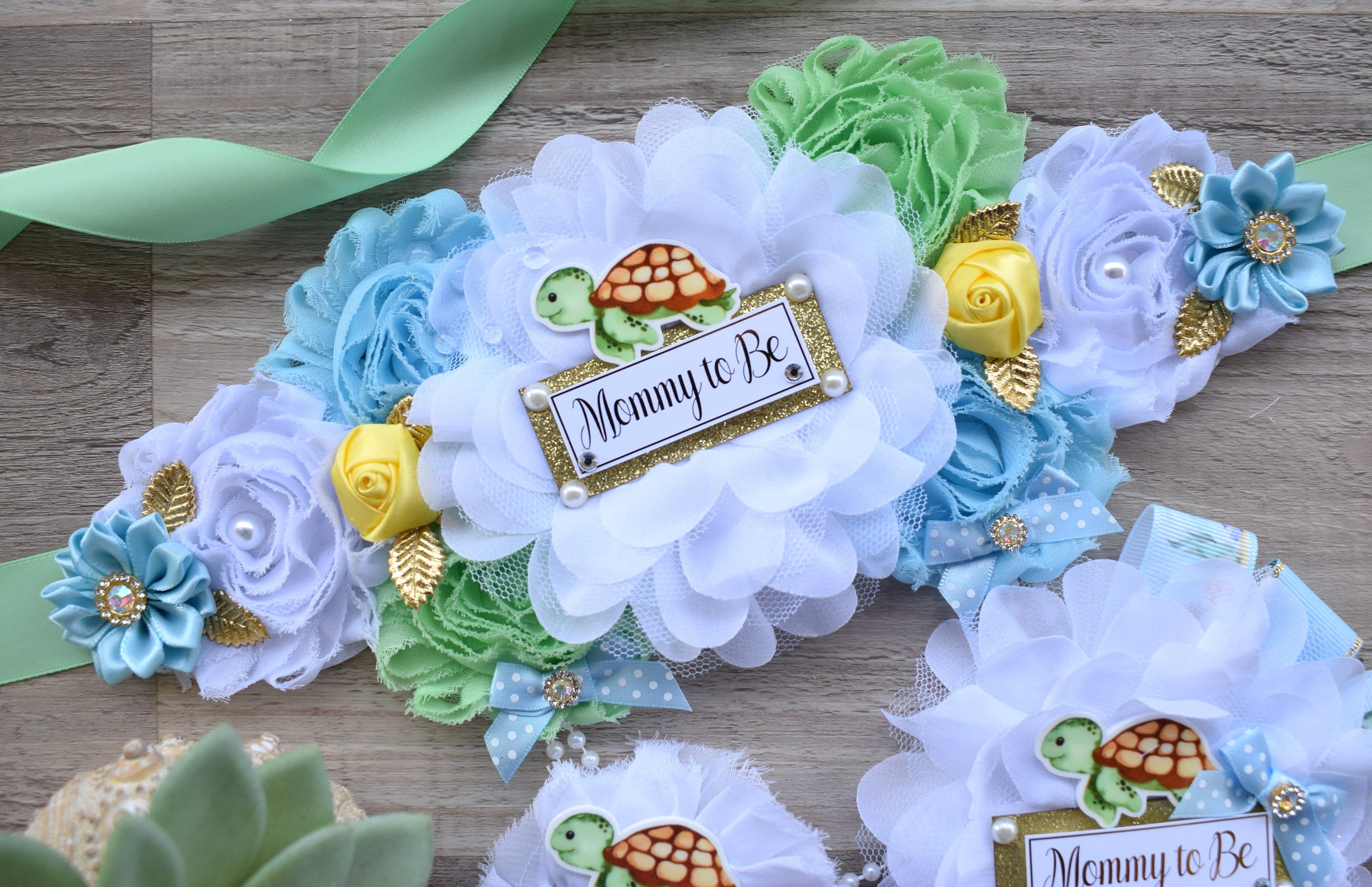 Turtle Baby Shower, Turtle Aqua Blue Flower Sash, Under The Sea Corsage Pin, Turtle Mommy To Be, Turtle Daddy To Be, Turtle Shower