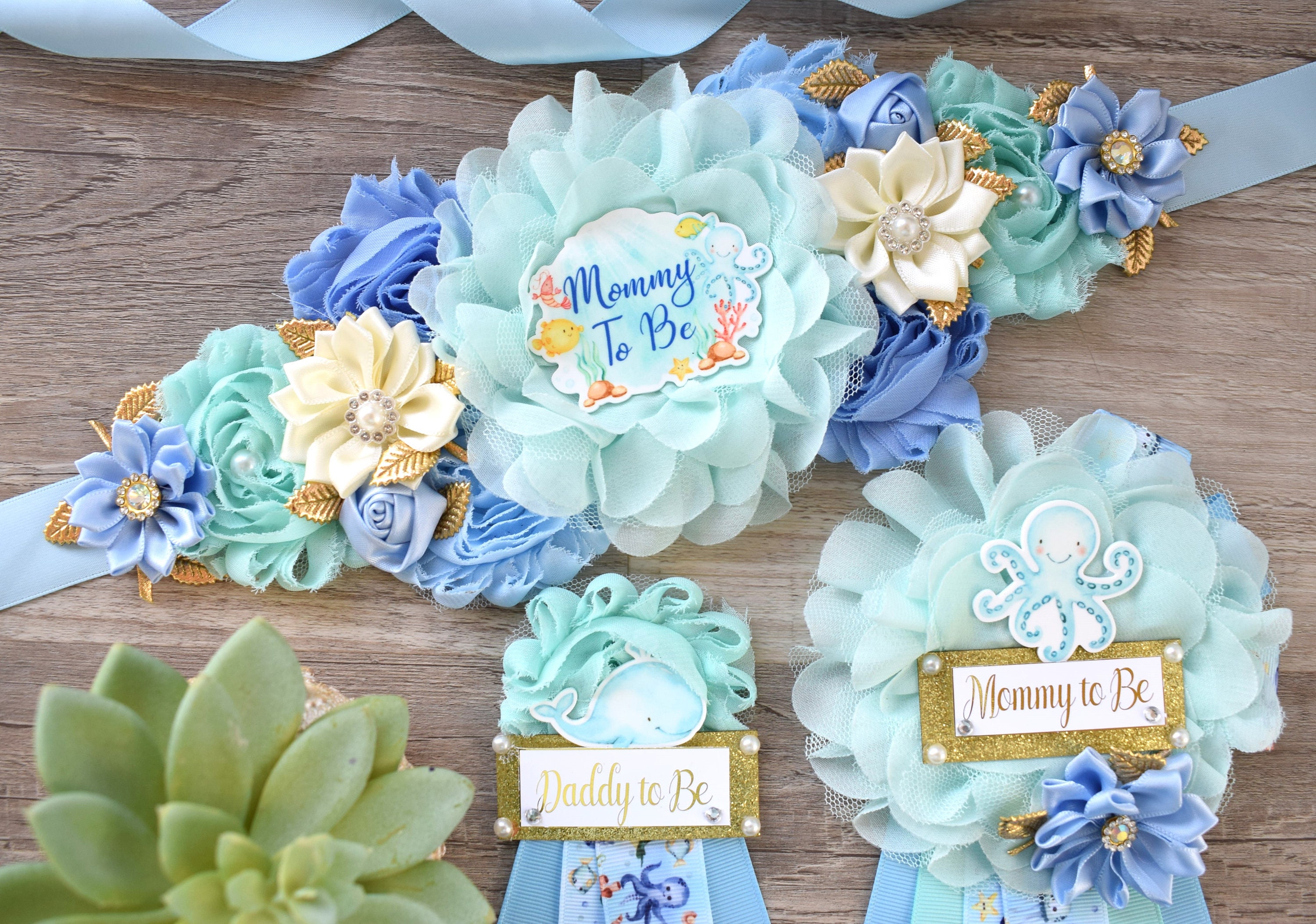 Under The Sea Baby Shower, Turtle Octopus Starfish Aqua Blue Flower Maternity Sash, Under The Sea Mommy To Be, Under The Sea Daddy To Be