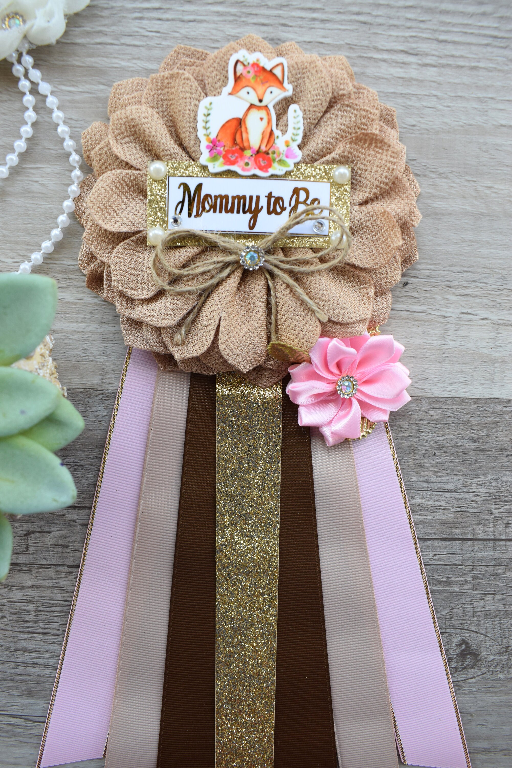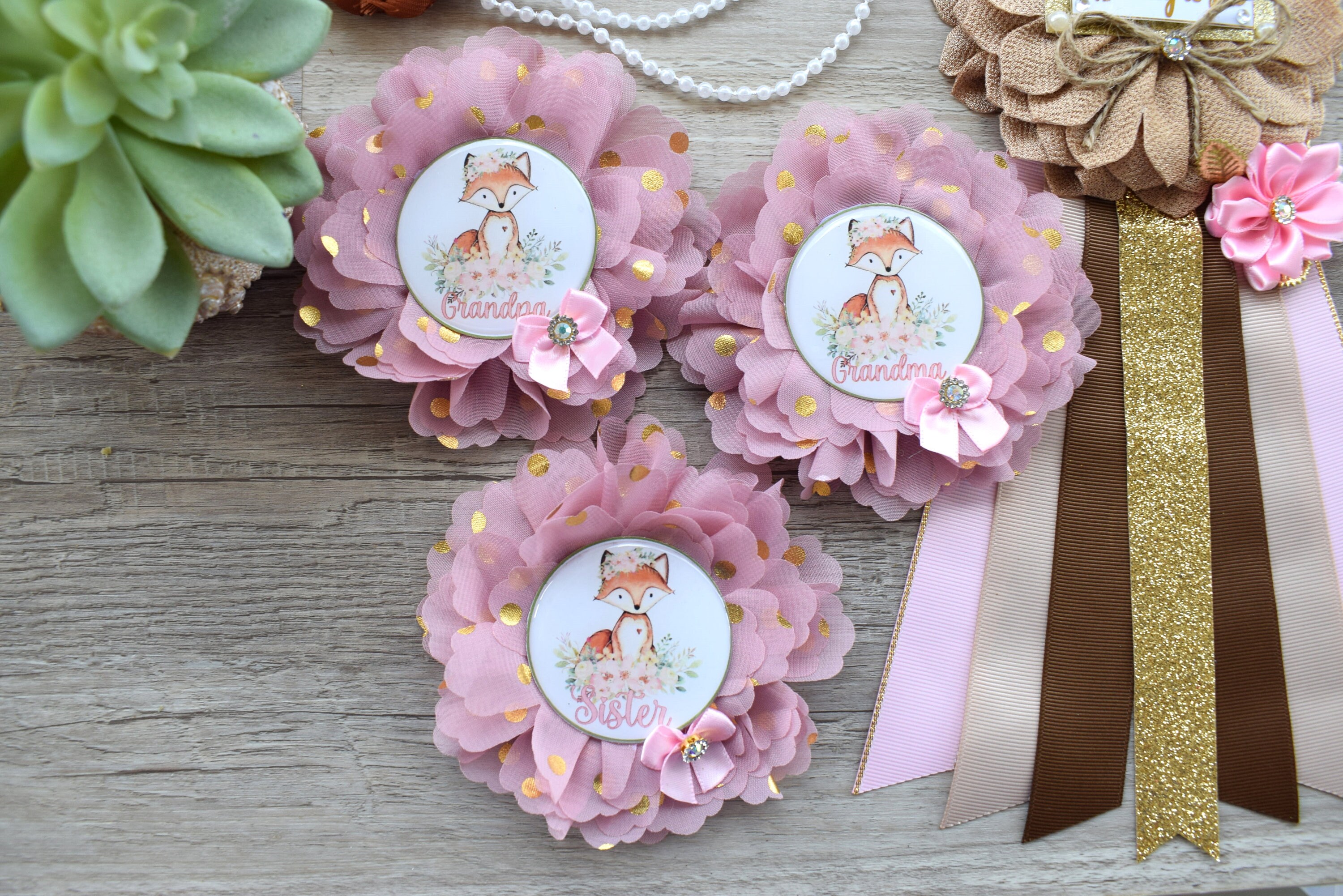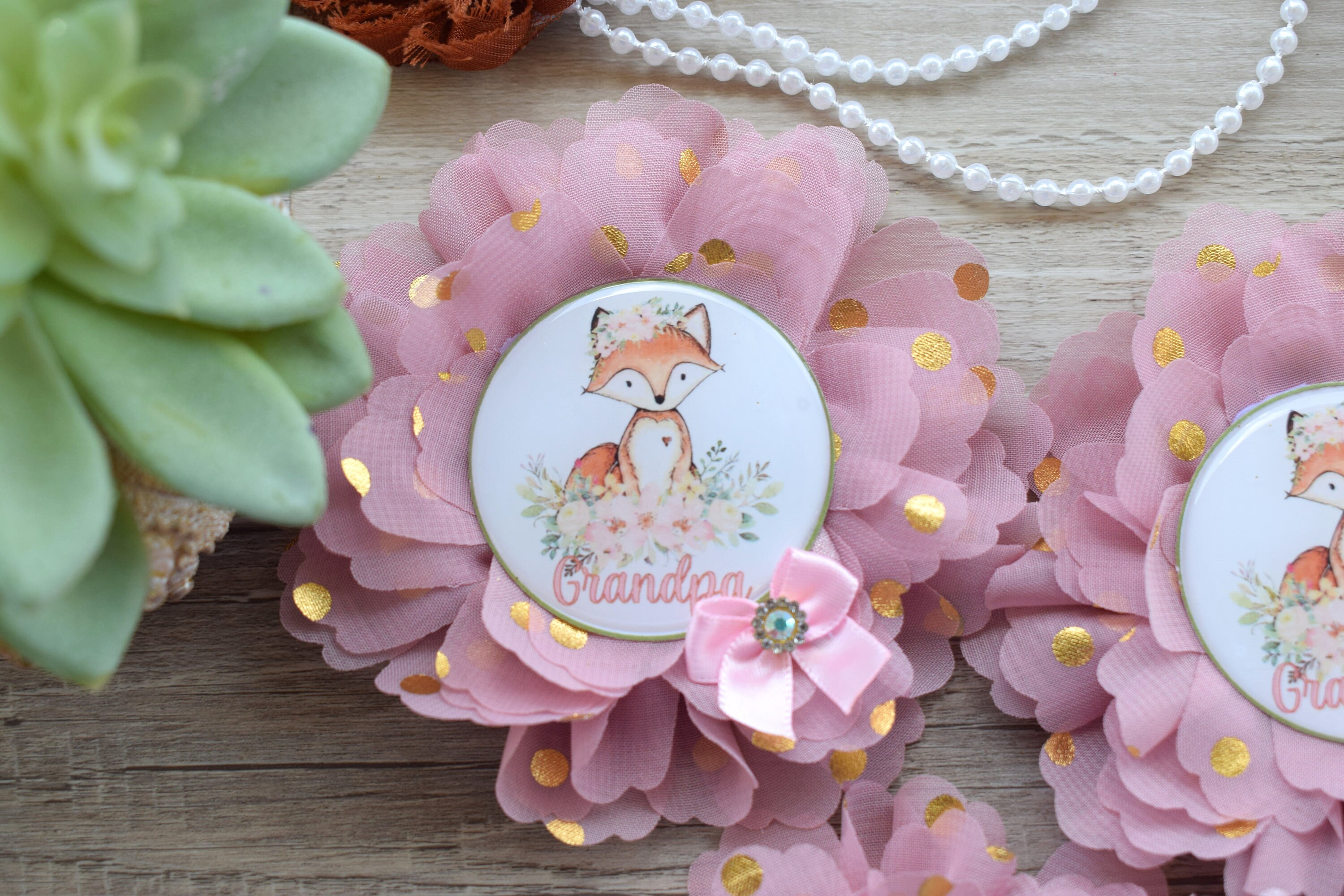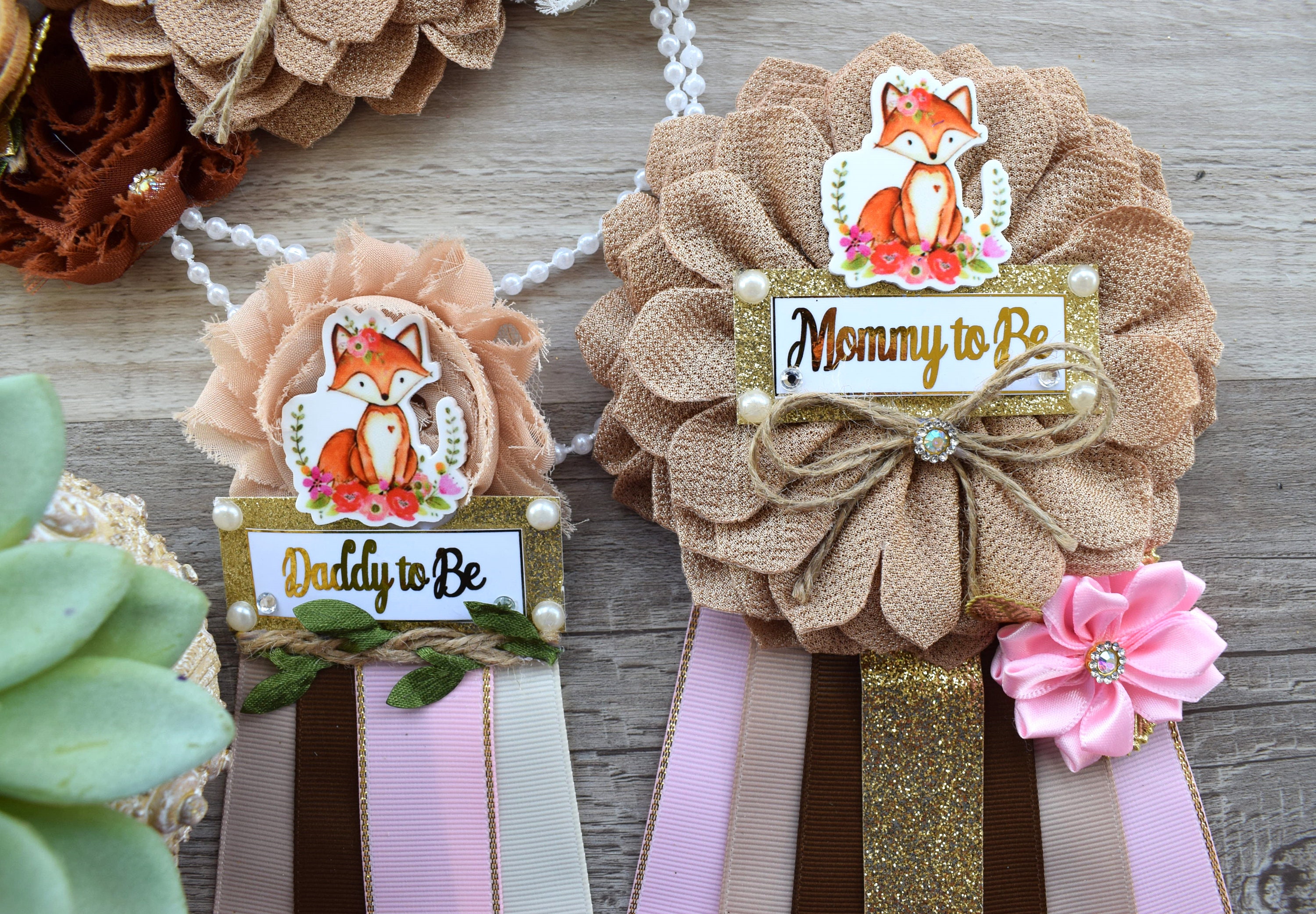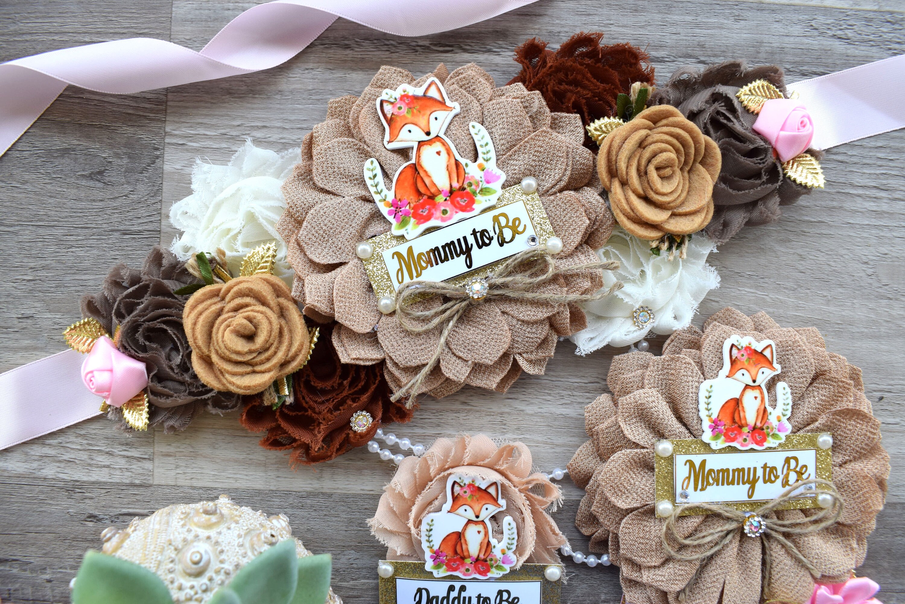 Girl Fox Woodland Baby Shower, Maternity Sash, Flower Fox Woodland Mommy To Be Pin, Girl Fox Woodland Daddy To Be Pin, Fox Woodland Shower