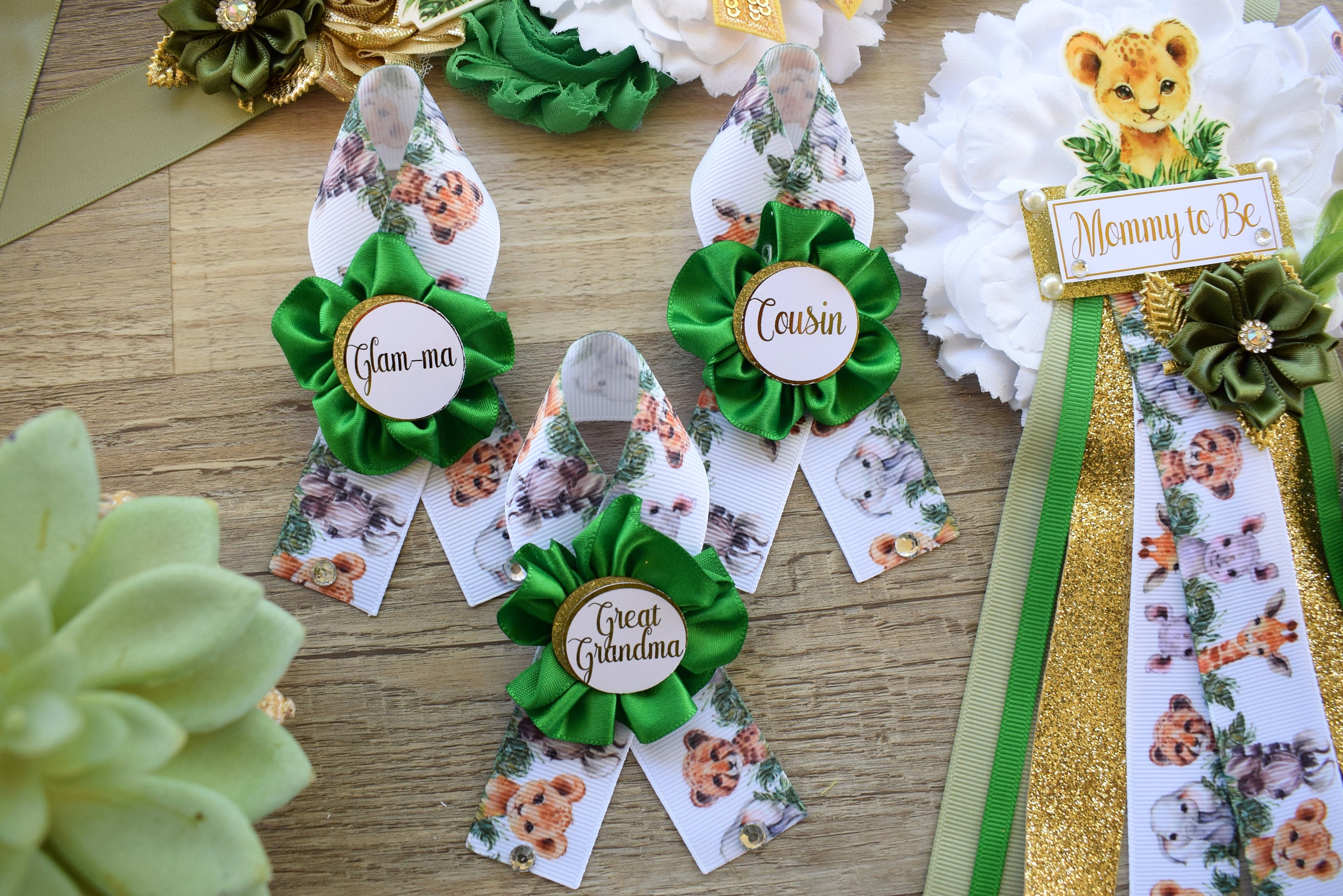 This Jungle Safari Sash & Pin Set was made especially for a Baby Shower or a Photo Prop. Details: