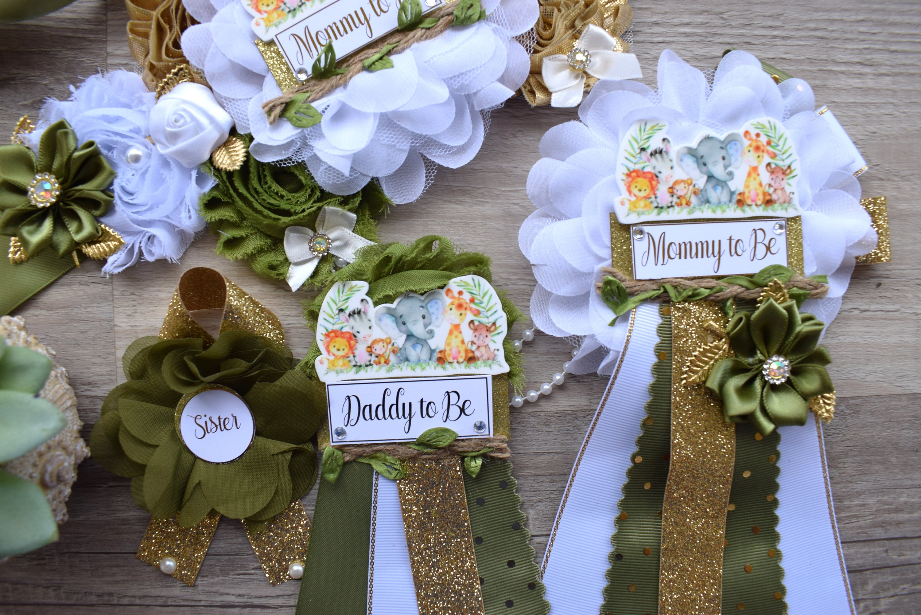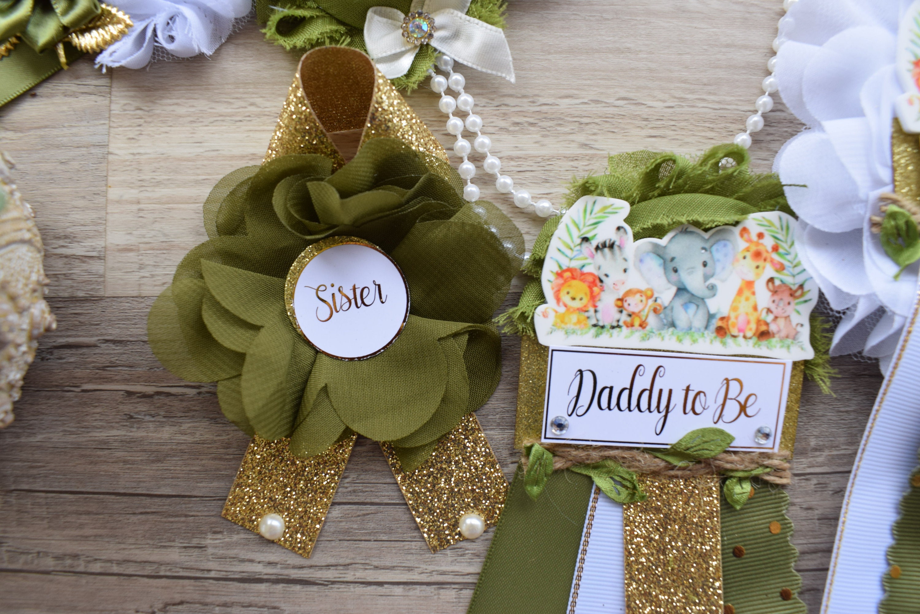 This Safari Olive Green, Gold & White Prince Flower Sash is made especially for a Baby Shower or a Photo Prop.