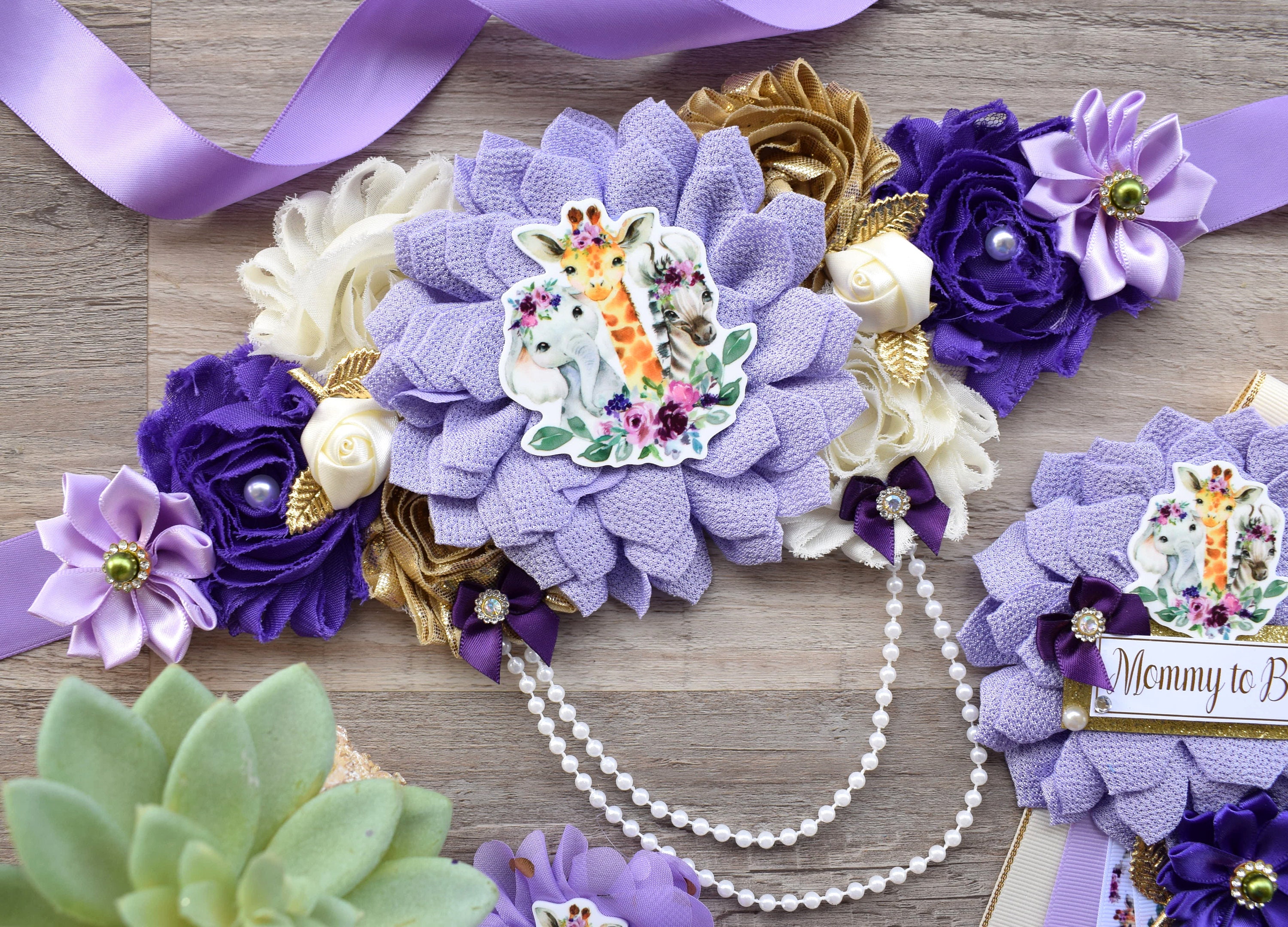 Girl Purple Safari Jungle Maternity Sash, Purple Lavender Gold Green Safari Maternity Sash, Purple Floral Animal Flower Baby Shower