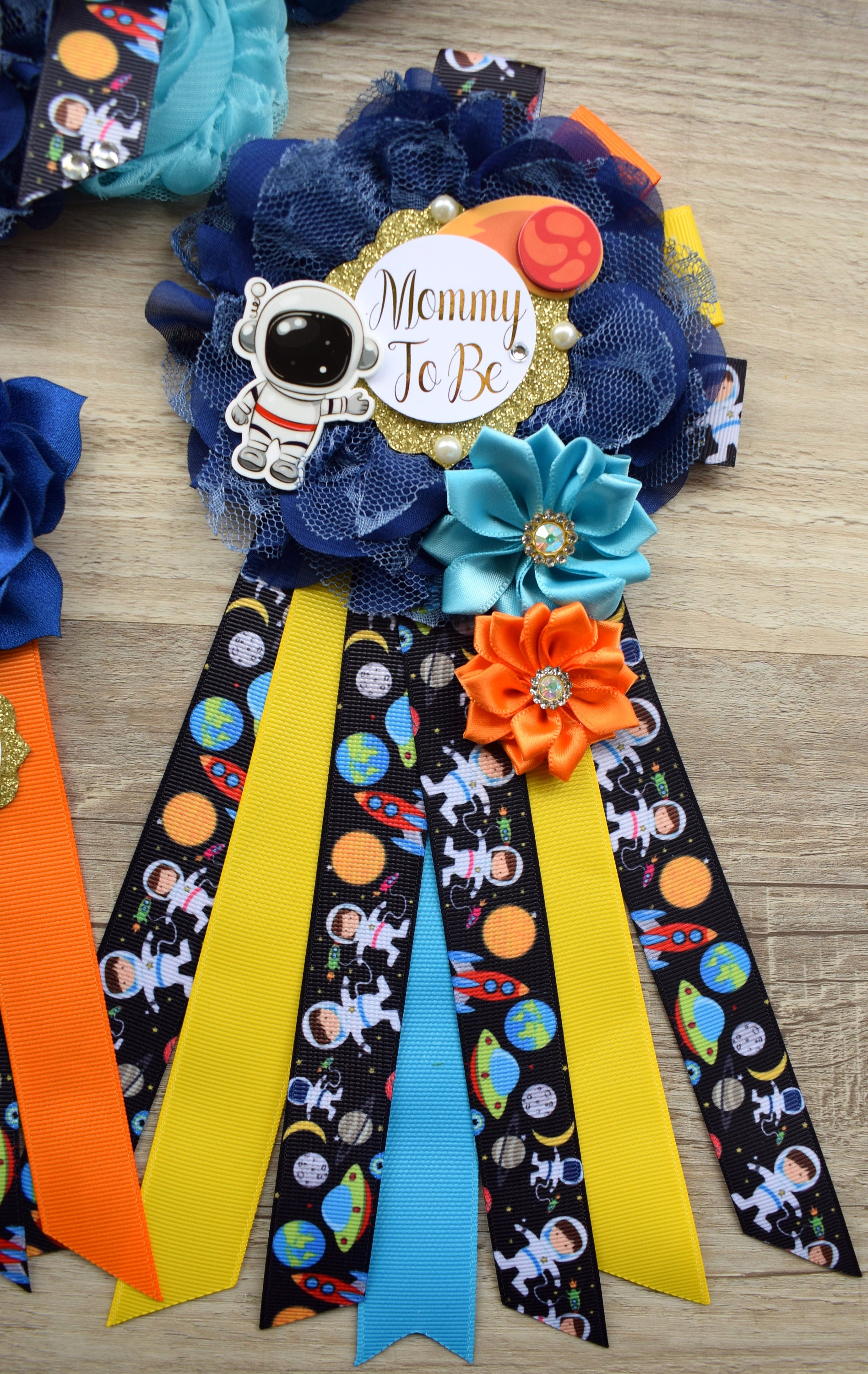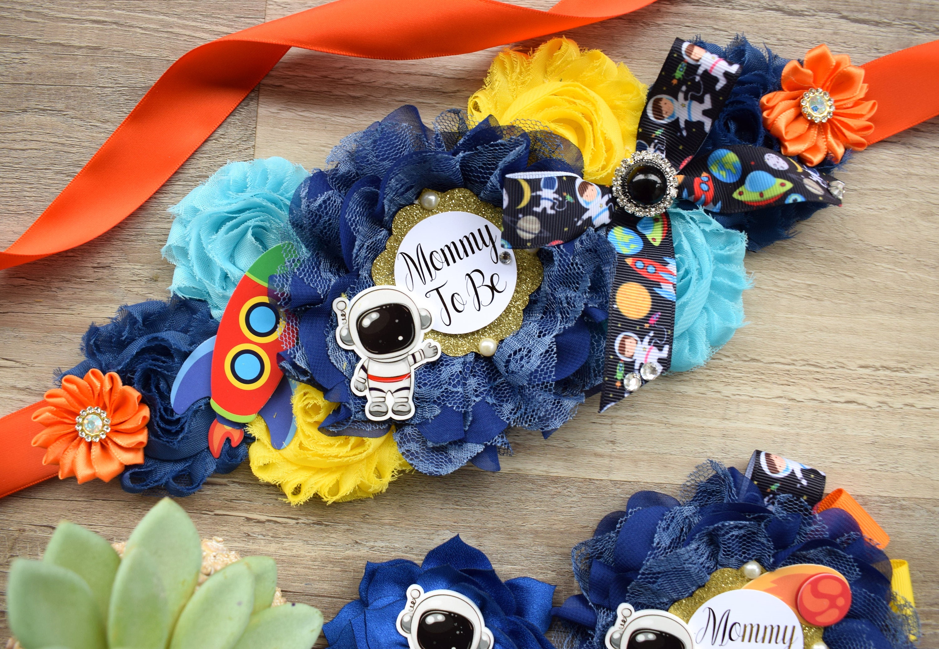 * Maternity Sash: It has eleven flowers in Navy, Royal, Blue, Orange and Yellow colors embellished with rhinestones and pearls. The ribbon sash is 80'' (2 meters) long.