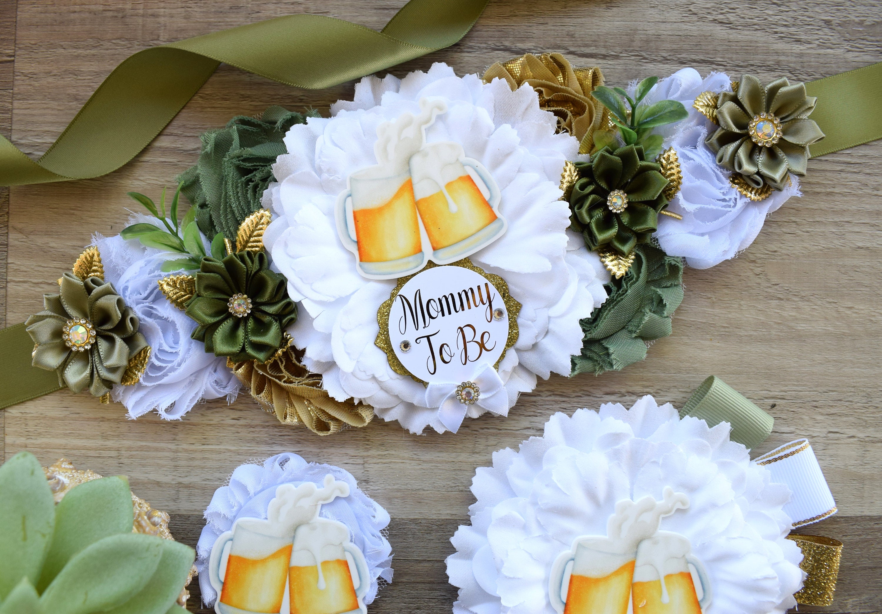 * Maternity Sash: It has eleven flowers in Sage Green, White and Gold colors embellished with rhinestones and pearls. The ribbon sash is 80'' (2 meters) long.