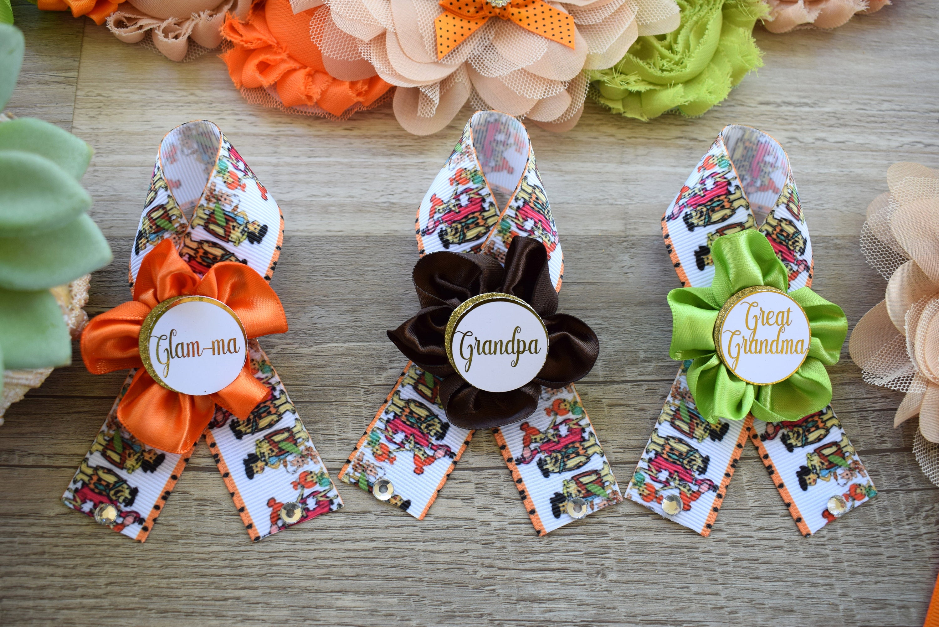 ☆ Maternity Sash: This has eleven flowers in Orange, Green & Beige colors embellished with rhinestones and pearls. Additionally, this sash is decorated with safari animals. The ribbon sash is 80'' (2 meters) long.