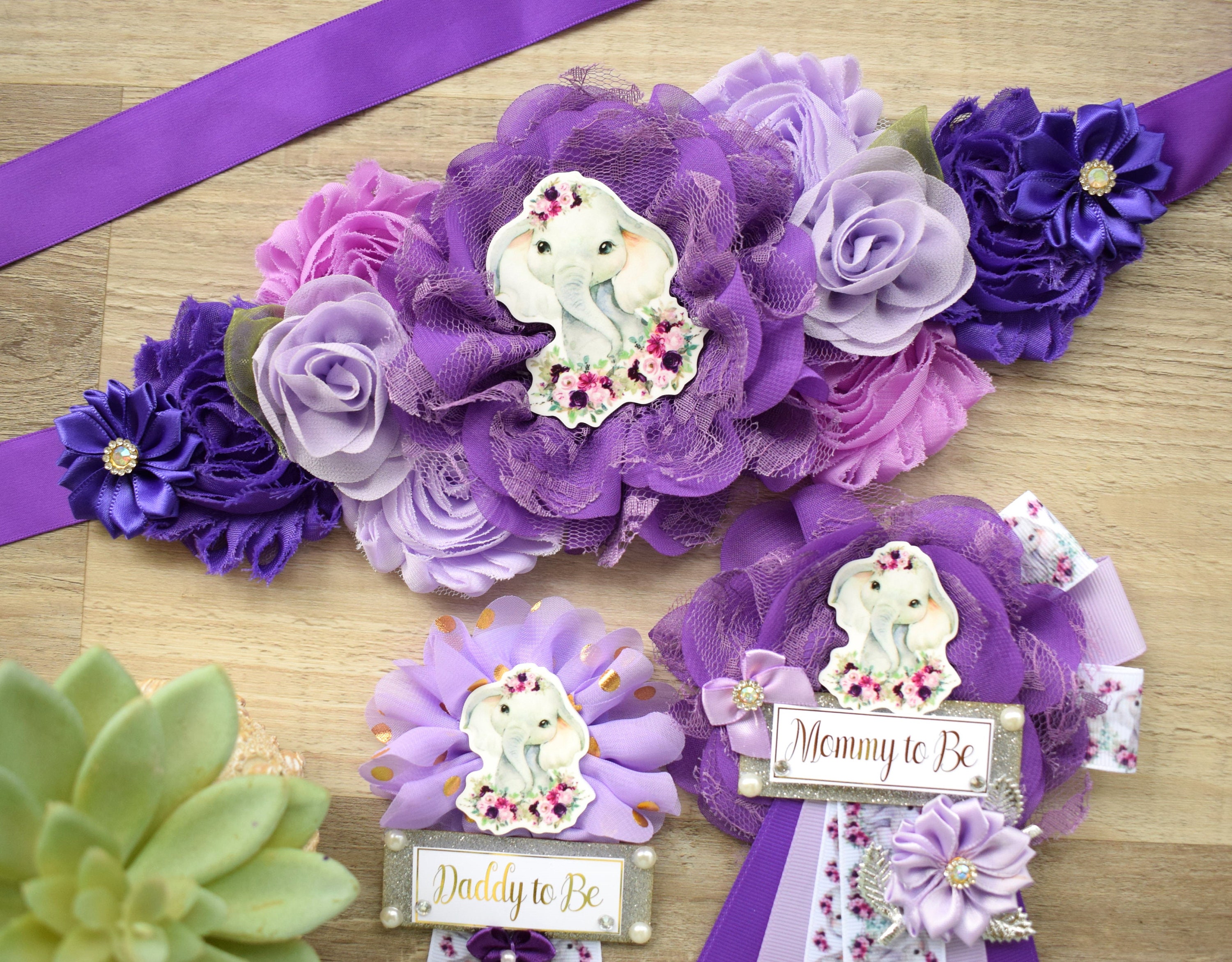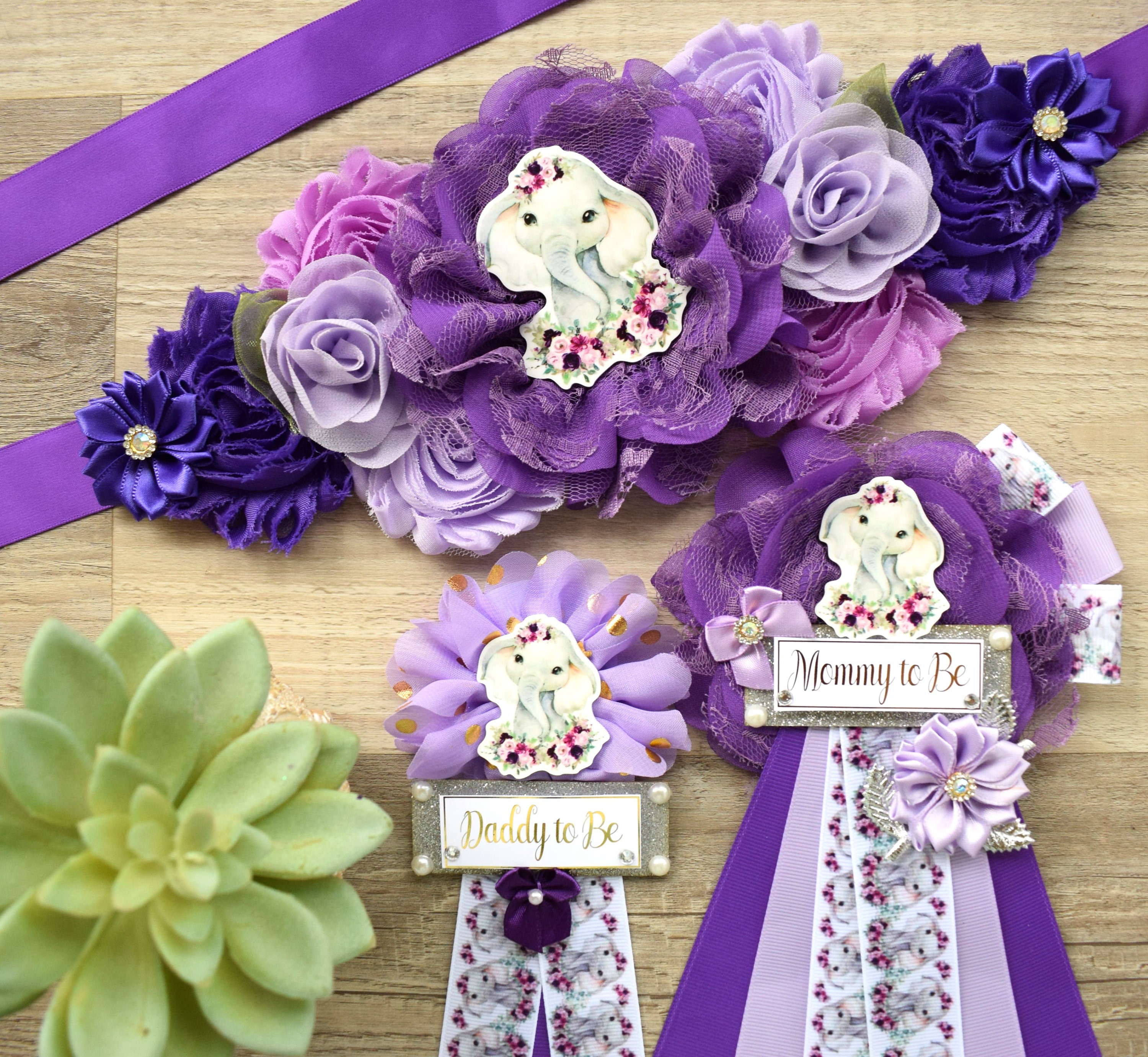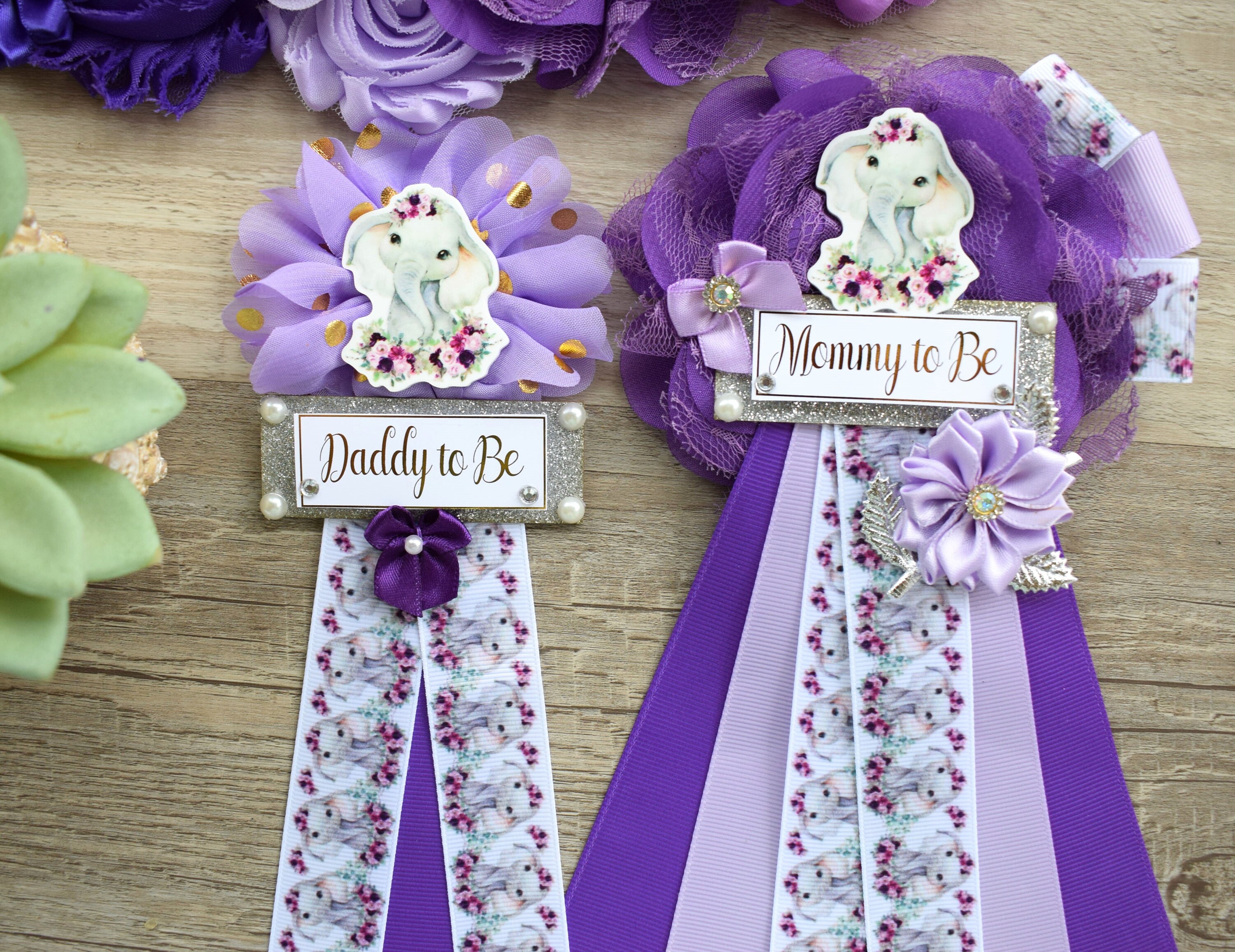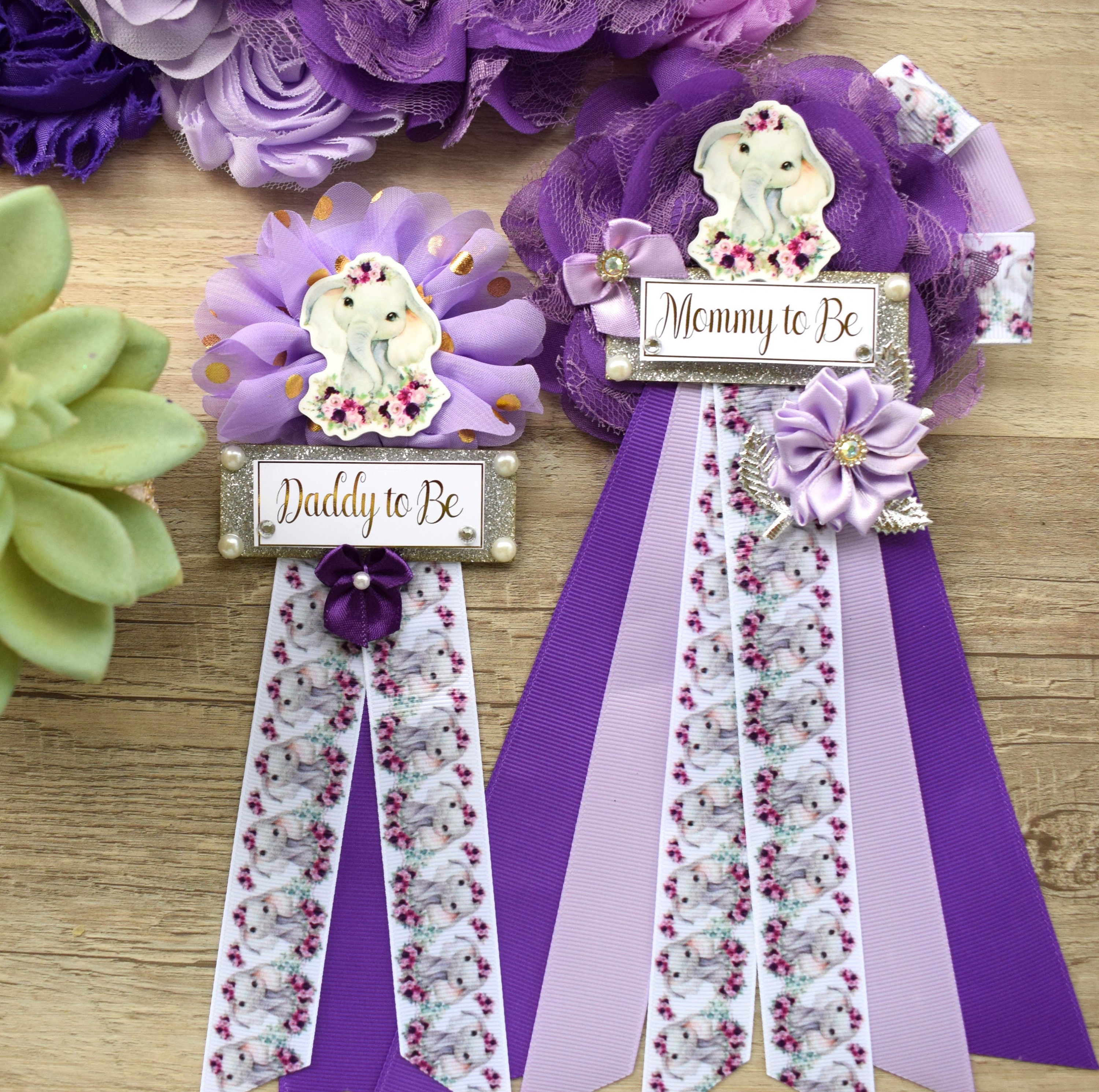 Elephant Purple Baby Shower, Purple Lavender Gold Green Safari, Mommy To Be Ribbon, Daddy To Be Pin, Purple Floral Animal Flower Baby Shower