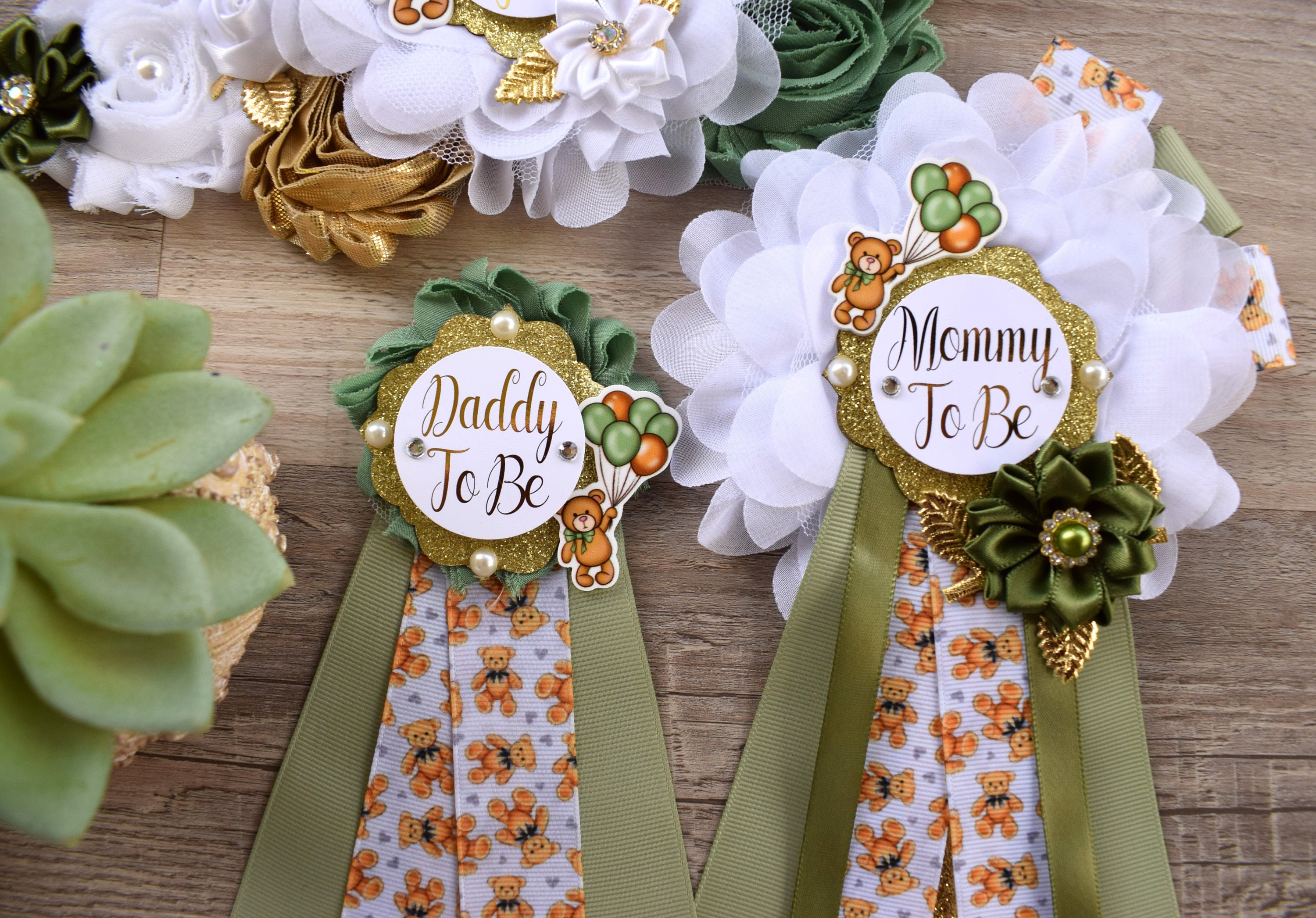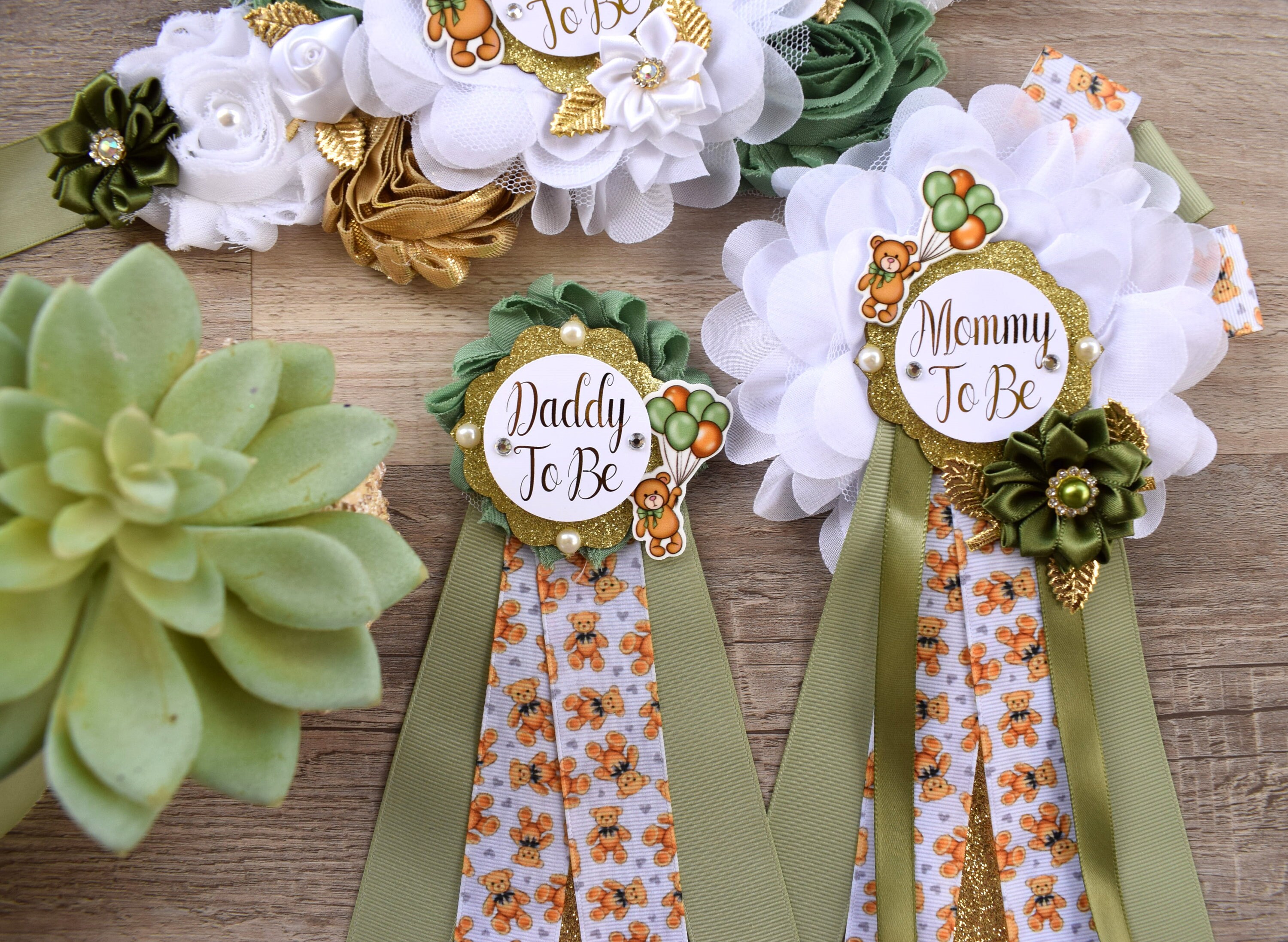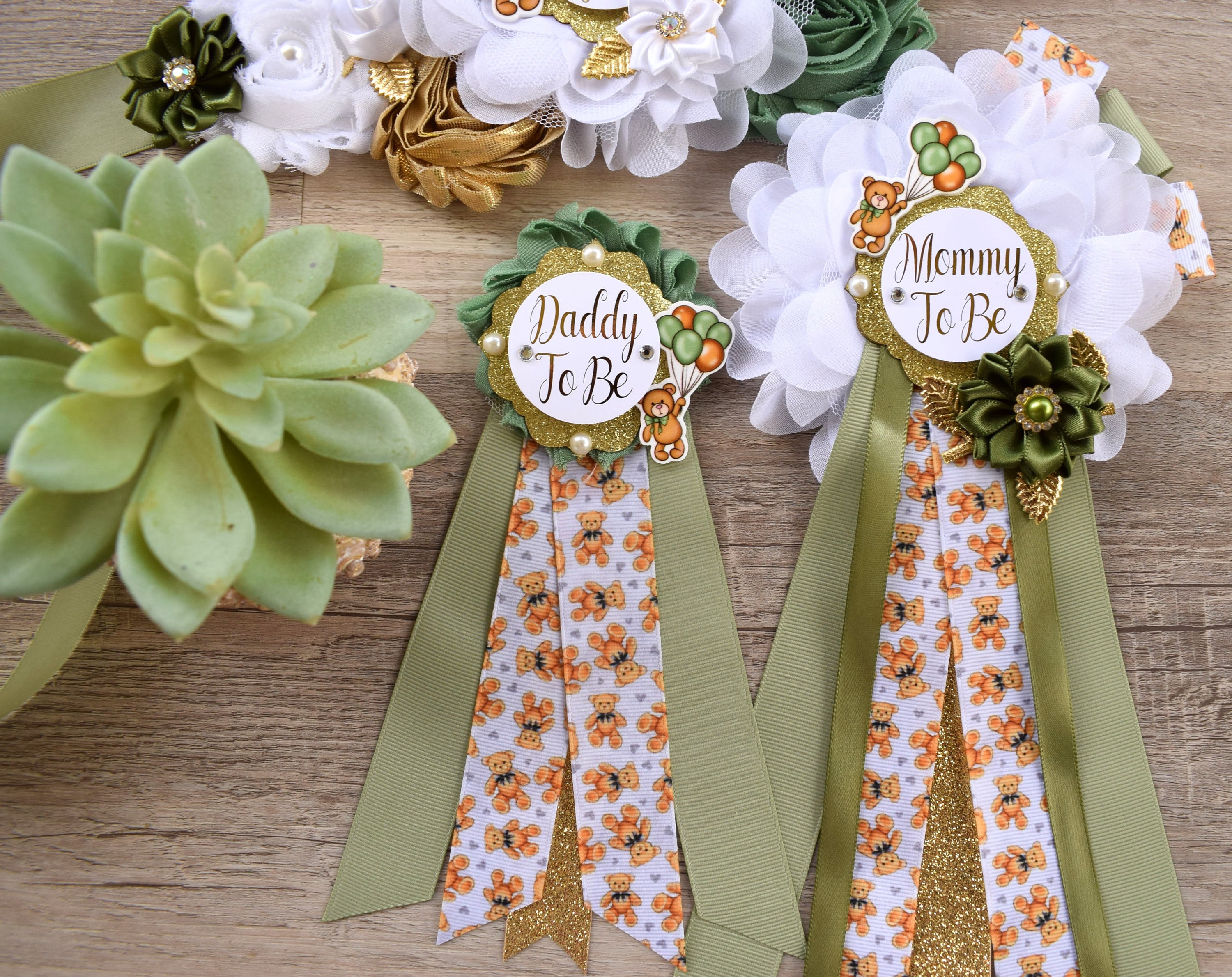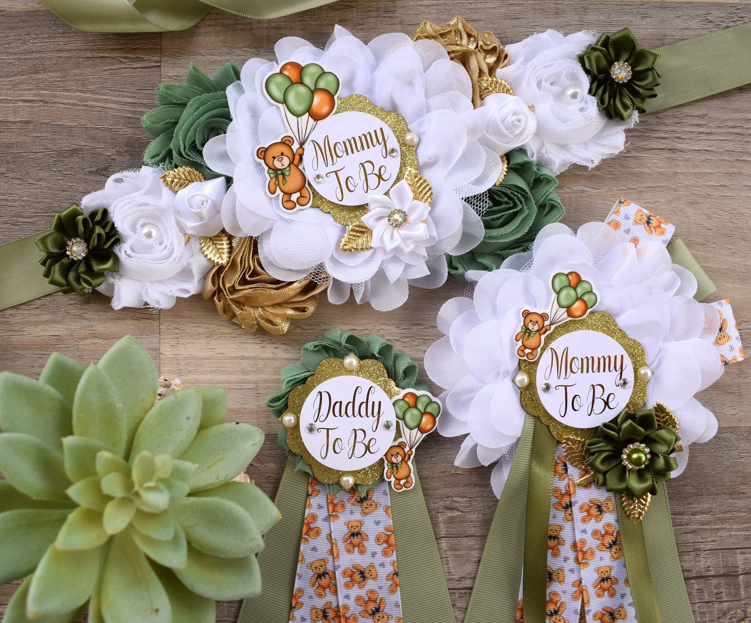 Bear Greenery Baby Shower, Bear Green White Gold Belly Sash, Bear Greenery Mommy To Be & Daddy To Be, Greenery Baby Shower Maternity Sash