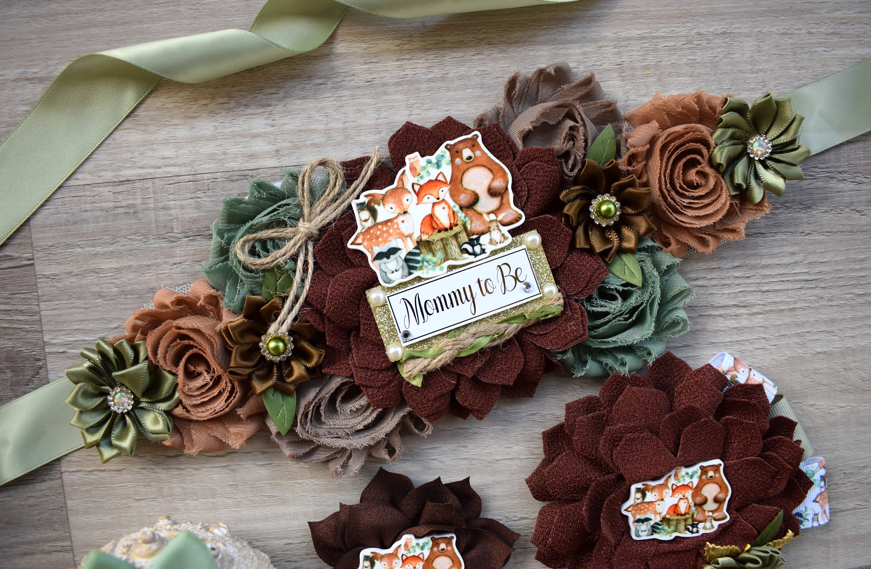 ☆ Maternity Sash: It has eleven flowers in Woodland theme colors embellished with rhinestones and pearls. The ribbon sash is 80'' (2 meters) long.