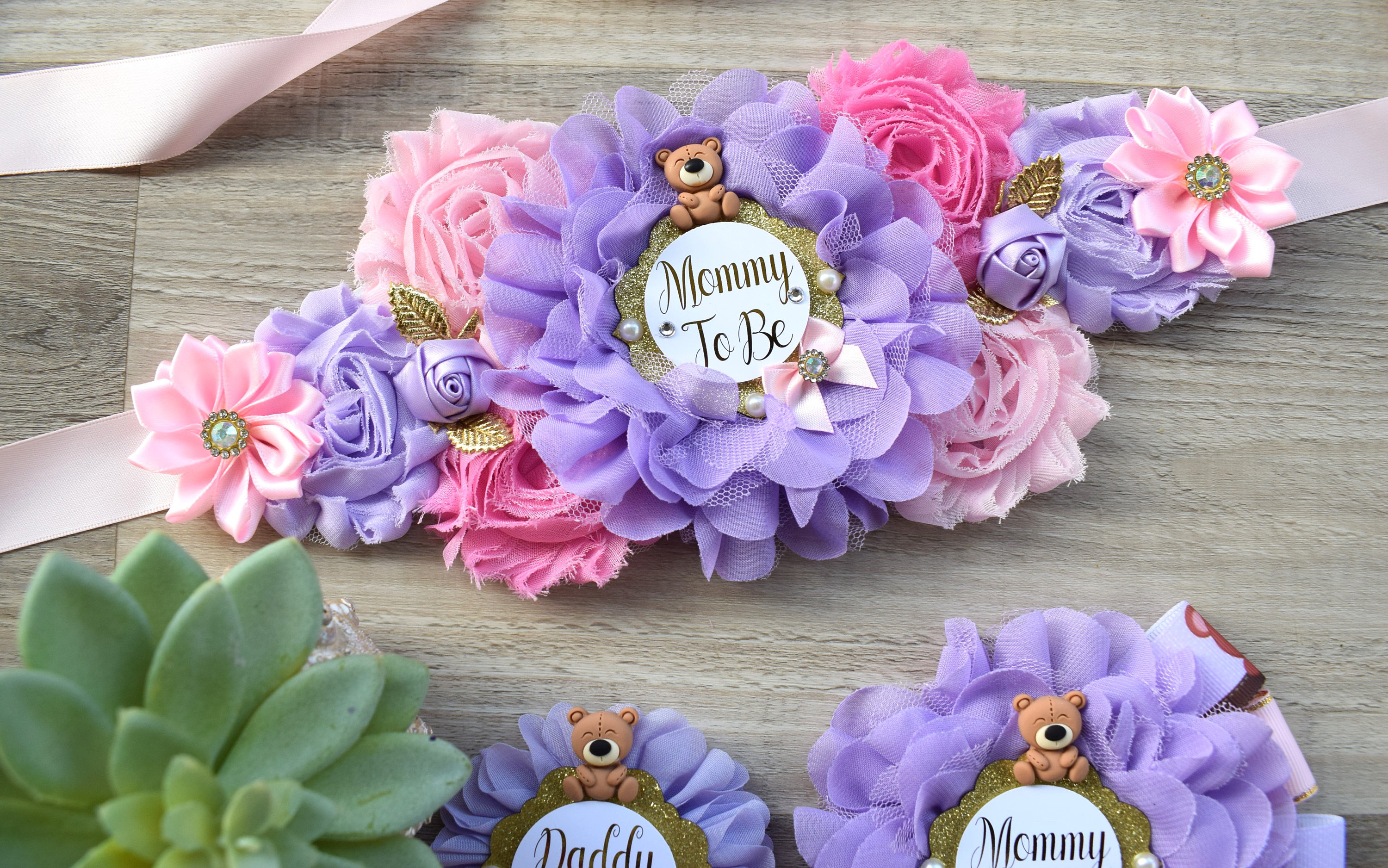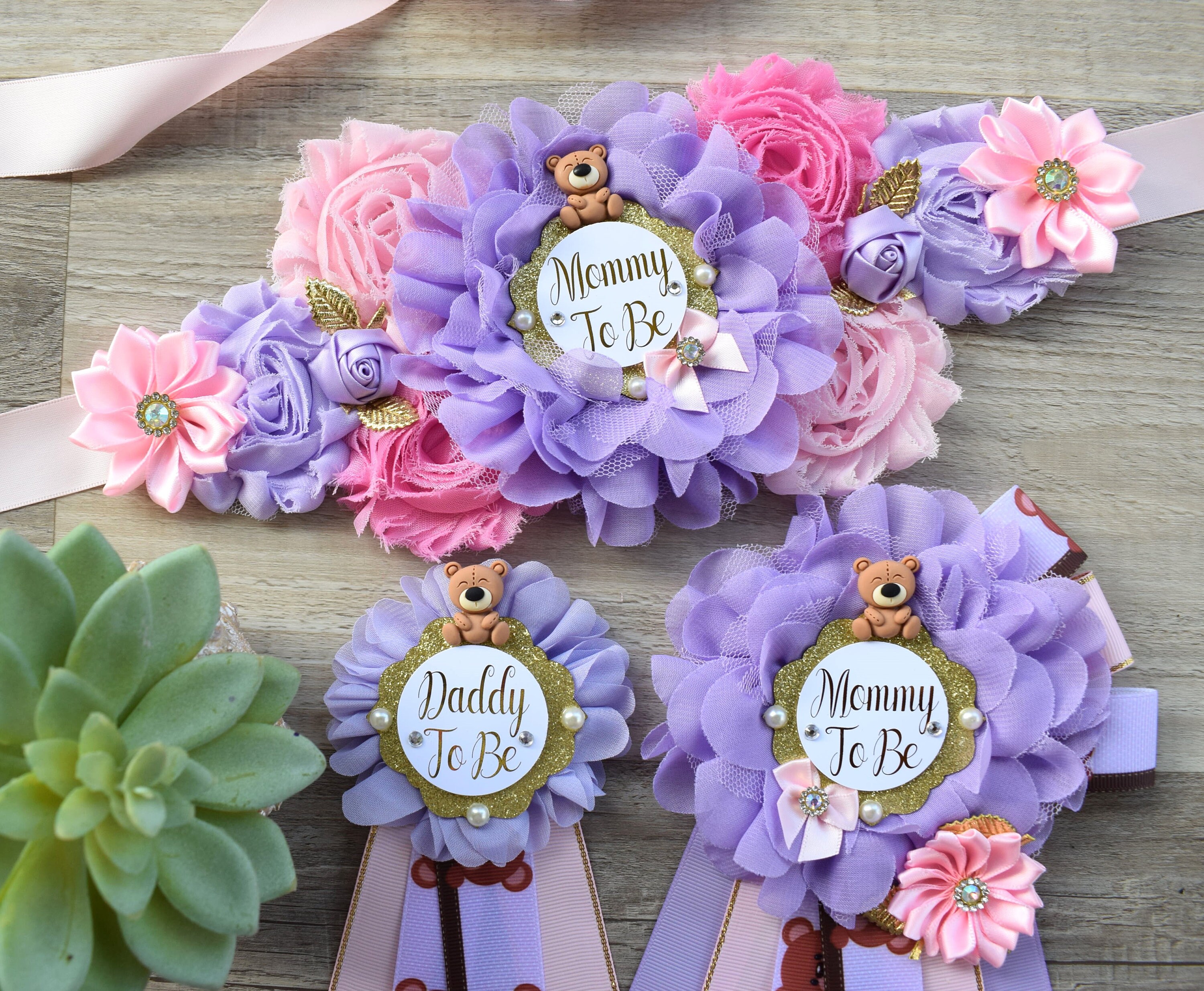 Pink Lavender Teddy Bear Baby Shower, Mama Bear Maternity Sash, Papa Bear Daddy To Be Pin, Mommy To Be Ribbon, Pink Girl Teddy Bear, Custom