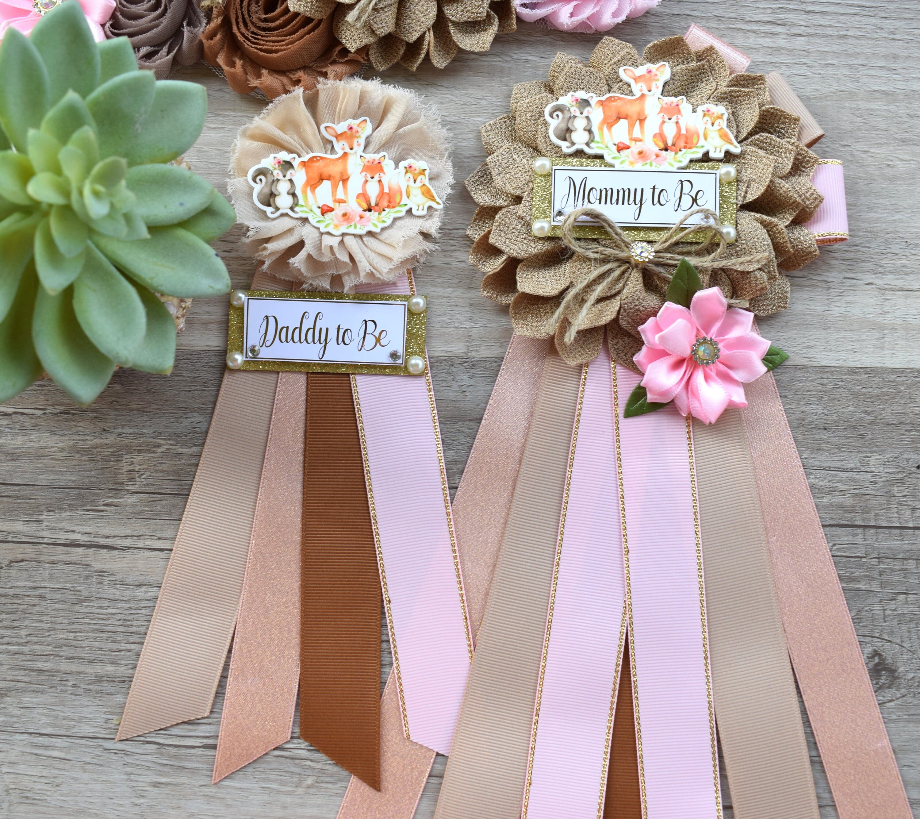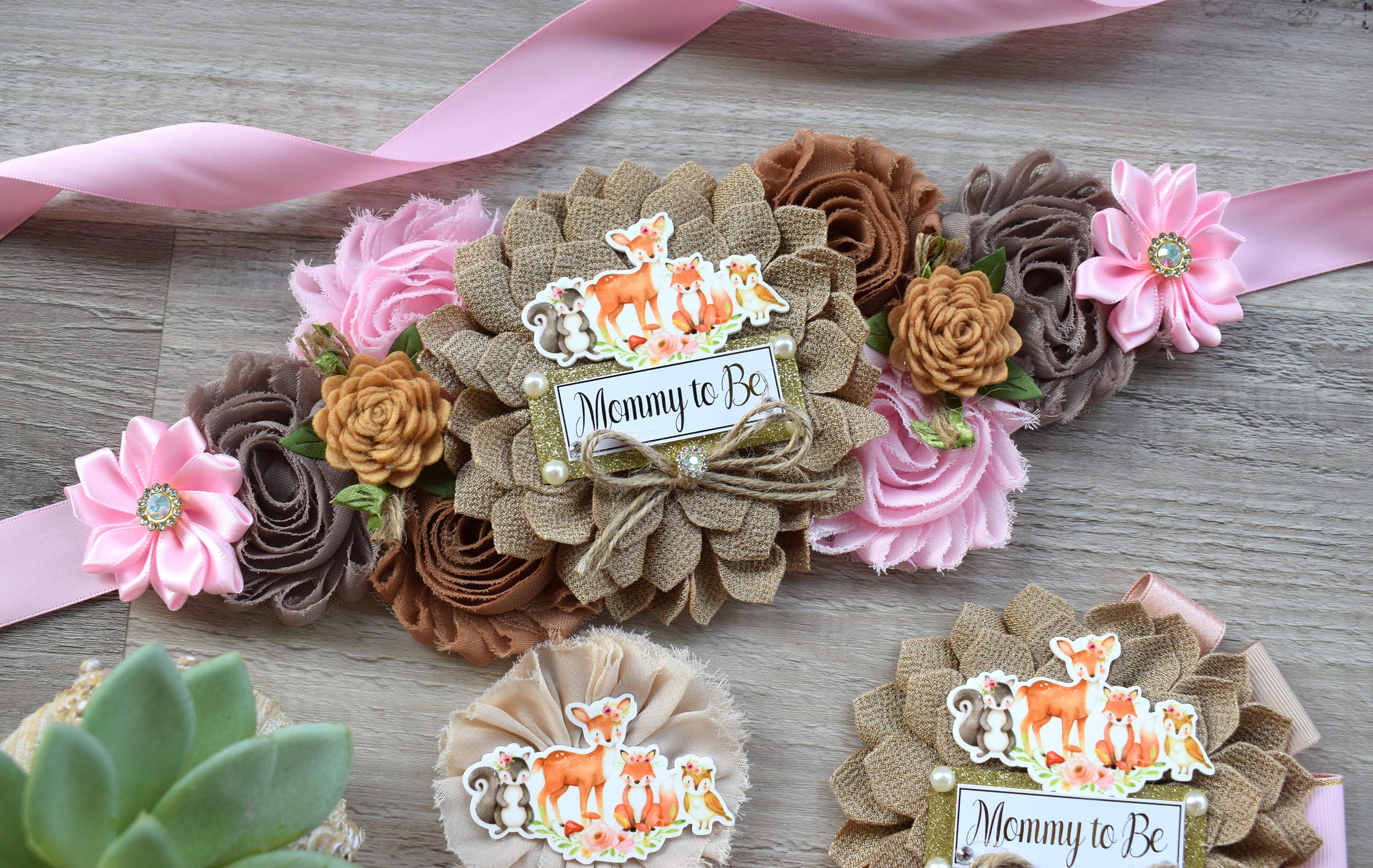 Girl Woodland Baby Shower, Pink Woodland Maternity Sash, Woodland Mommy To Be Pin, Girl Fox Daddy To Be Pin, Woodland Baby Shower Gift
