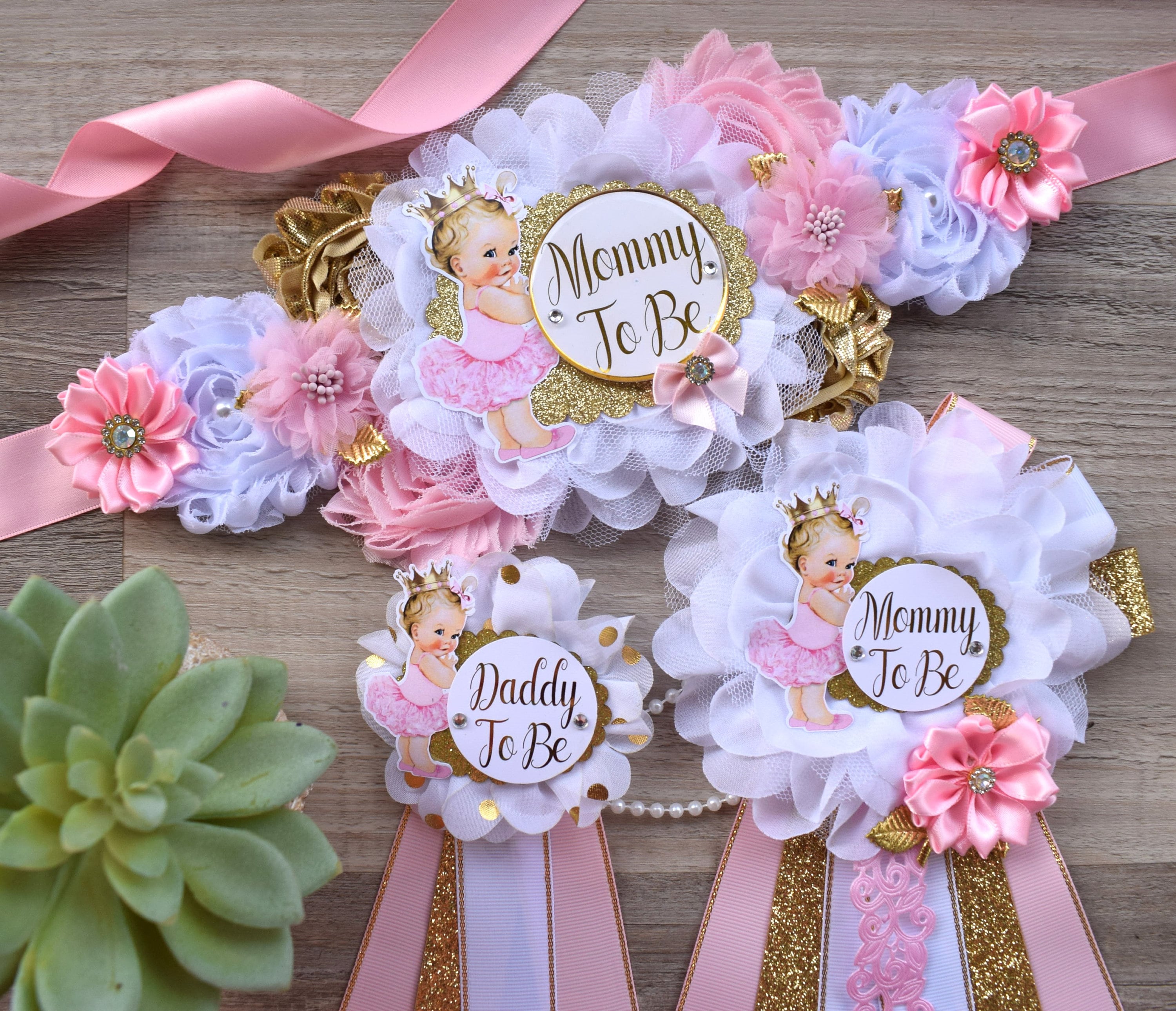Girl Princess Baby Shower, Pink Gold Maternity Sash, Pink Gold Mommy To Be Ribbon, Daddy To Be Pin, Princess Baby Shower, Baby Shower Gift