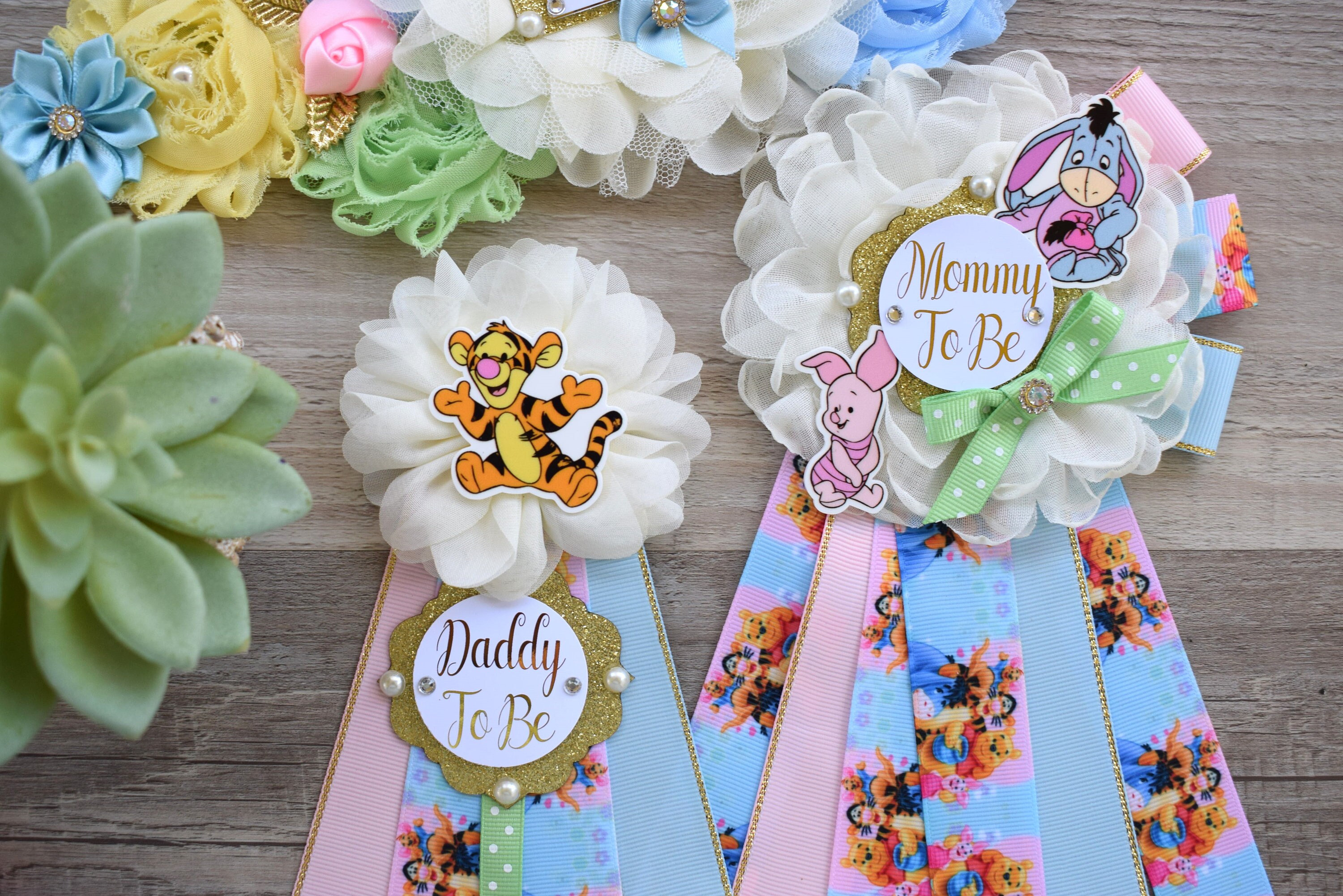 Gender Reveal Baby Shower, Pink Yellow Mommy To Be Ribbon, Daddy To Be Pin, Custom