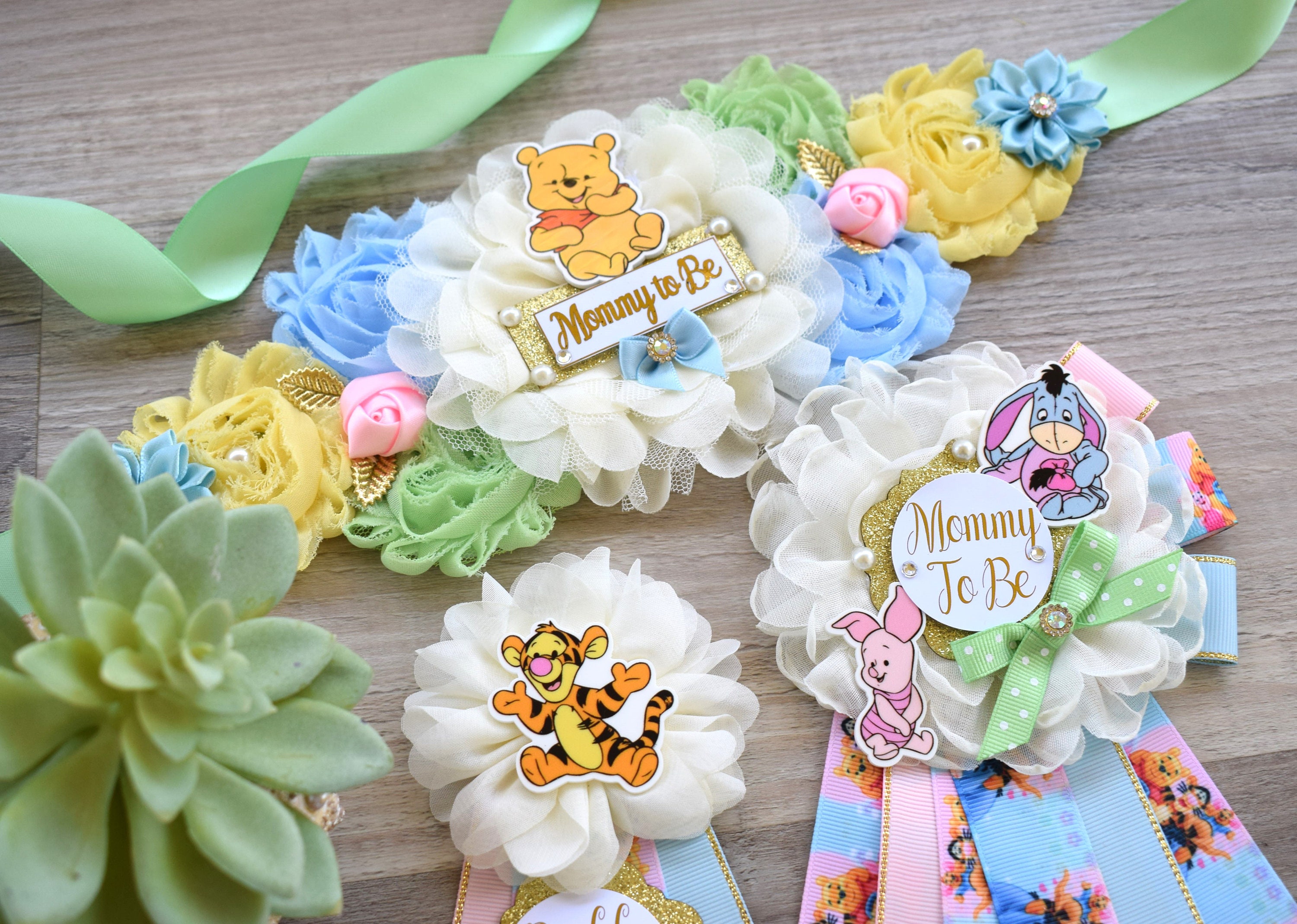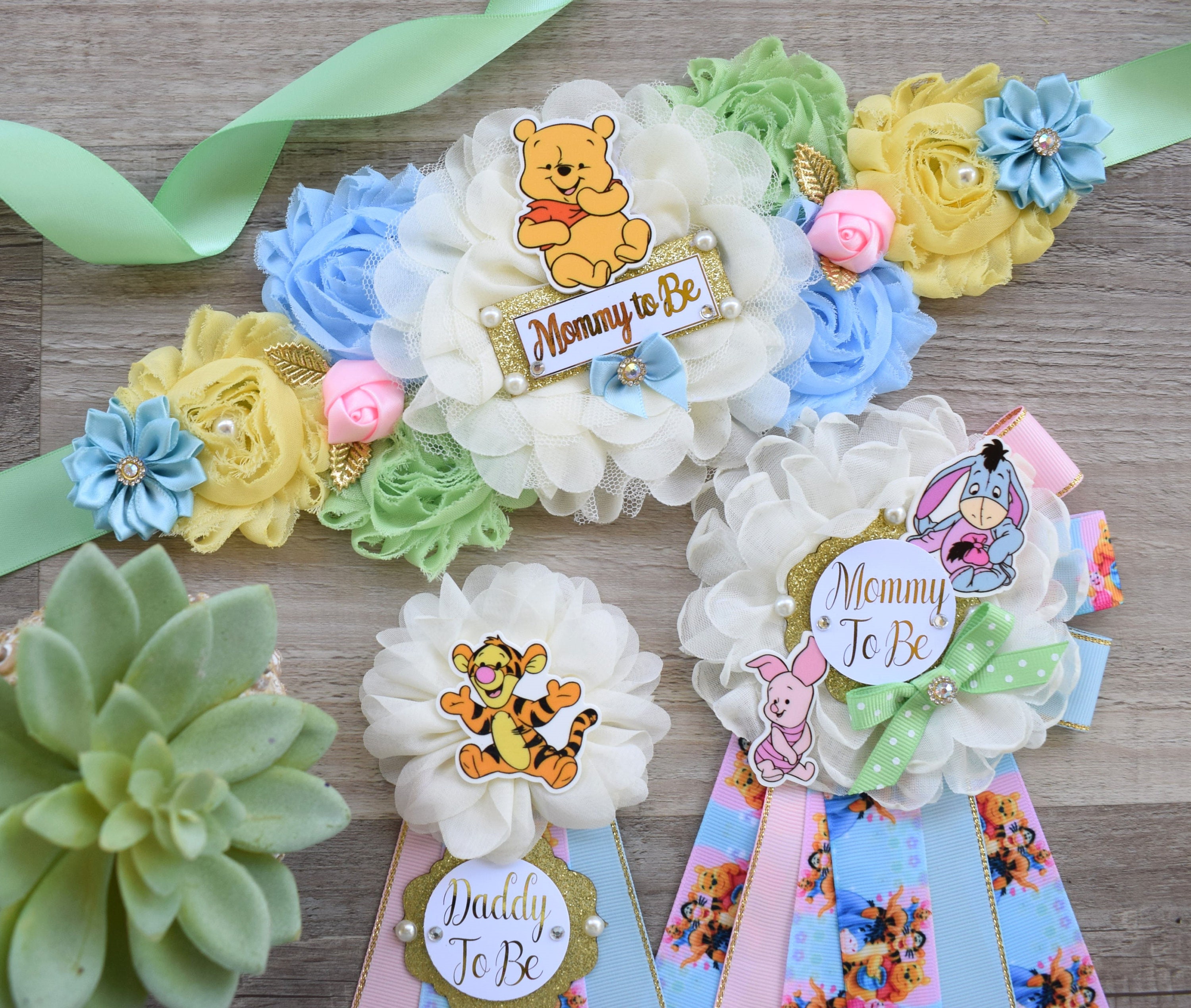 * Maternity Sash: This has eleven flowers in Light Pink, Yellow, Blue, Ivory & Cream colors embellished with rhinestones and pearls. The ribbon sash is 80'' (2 meters) long.