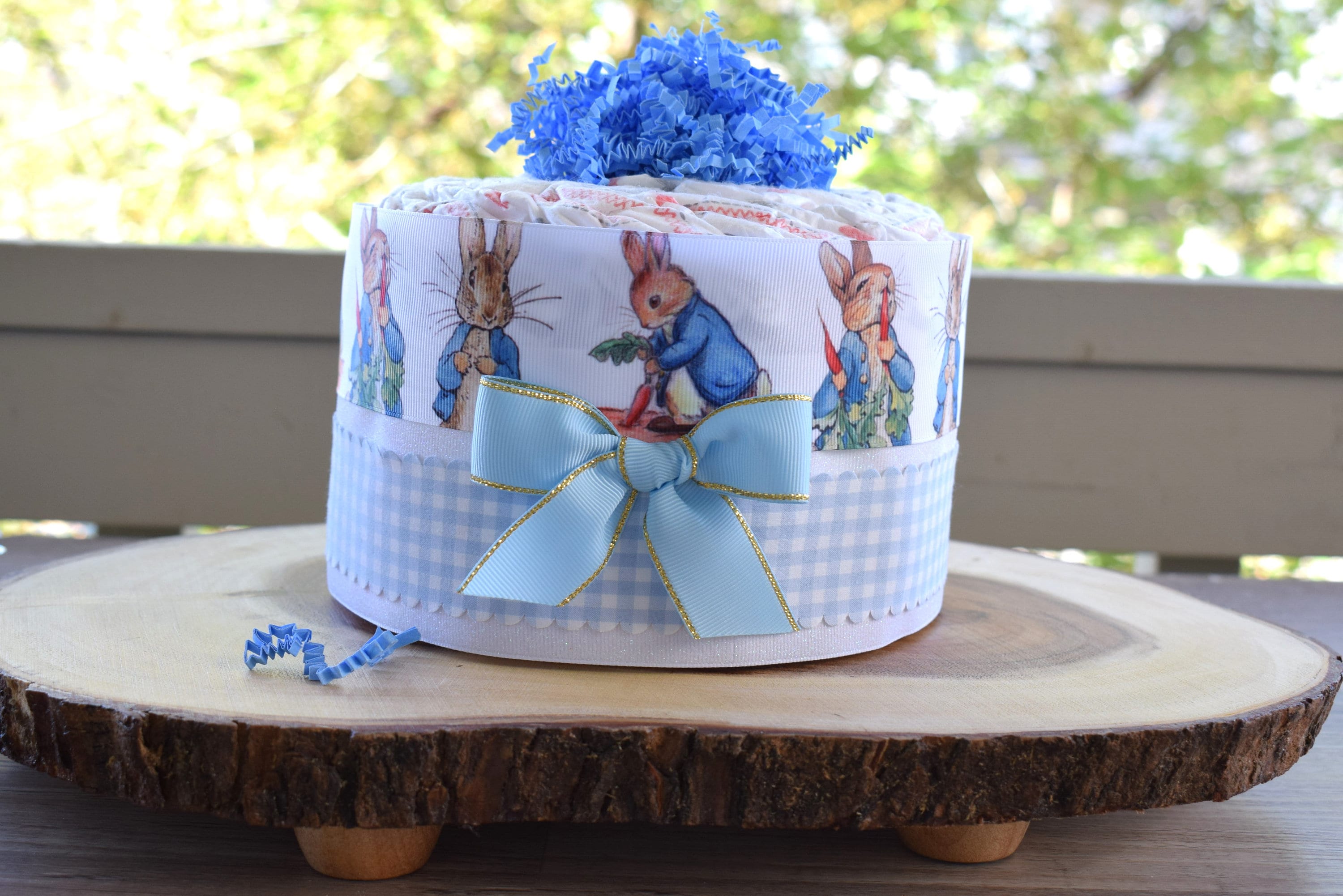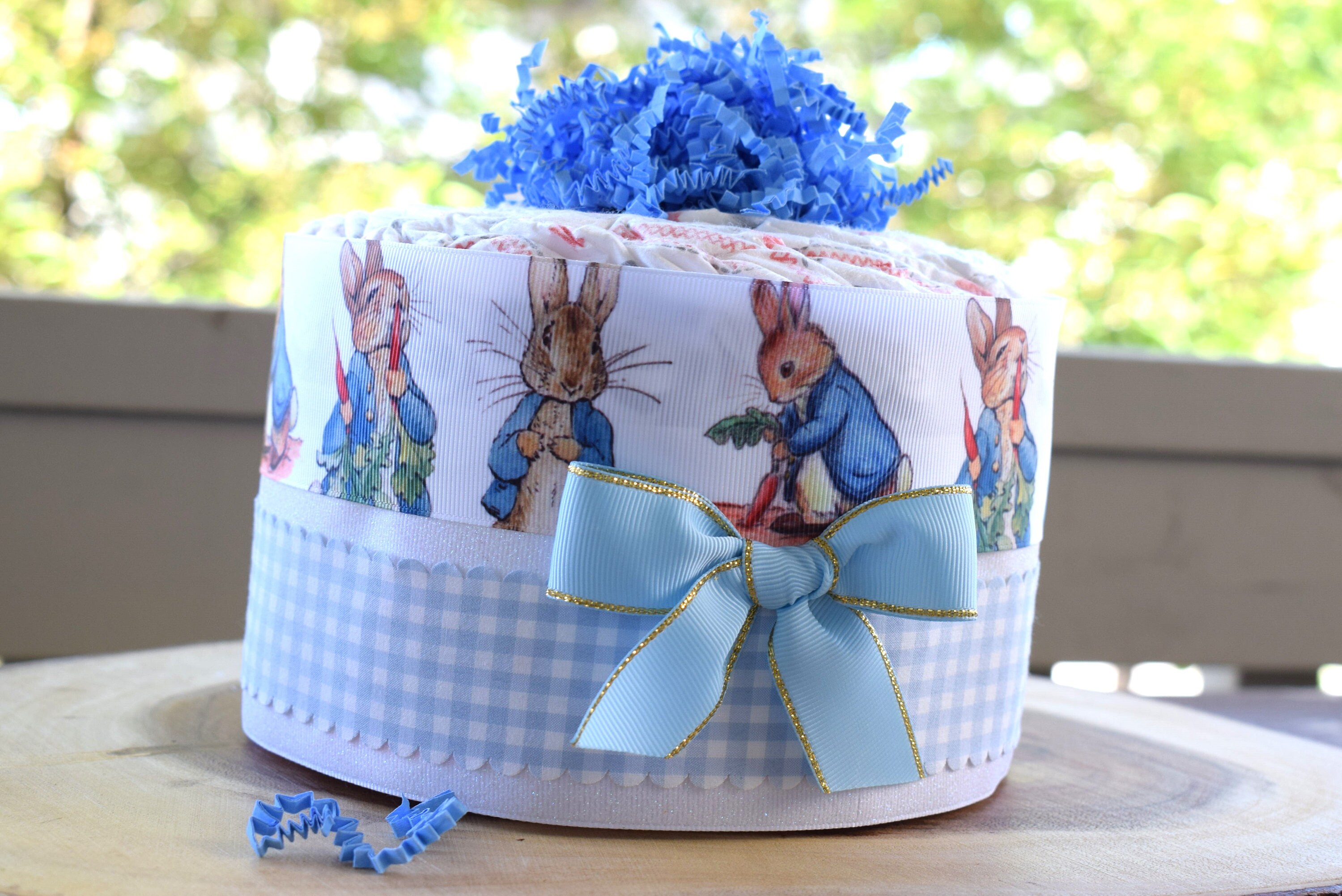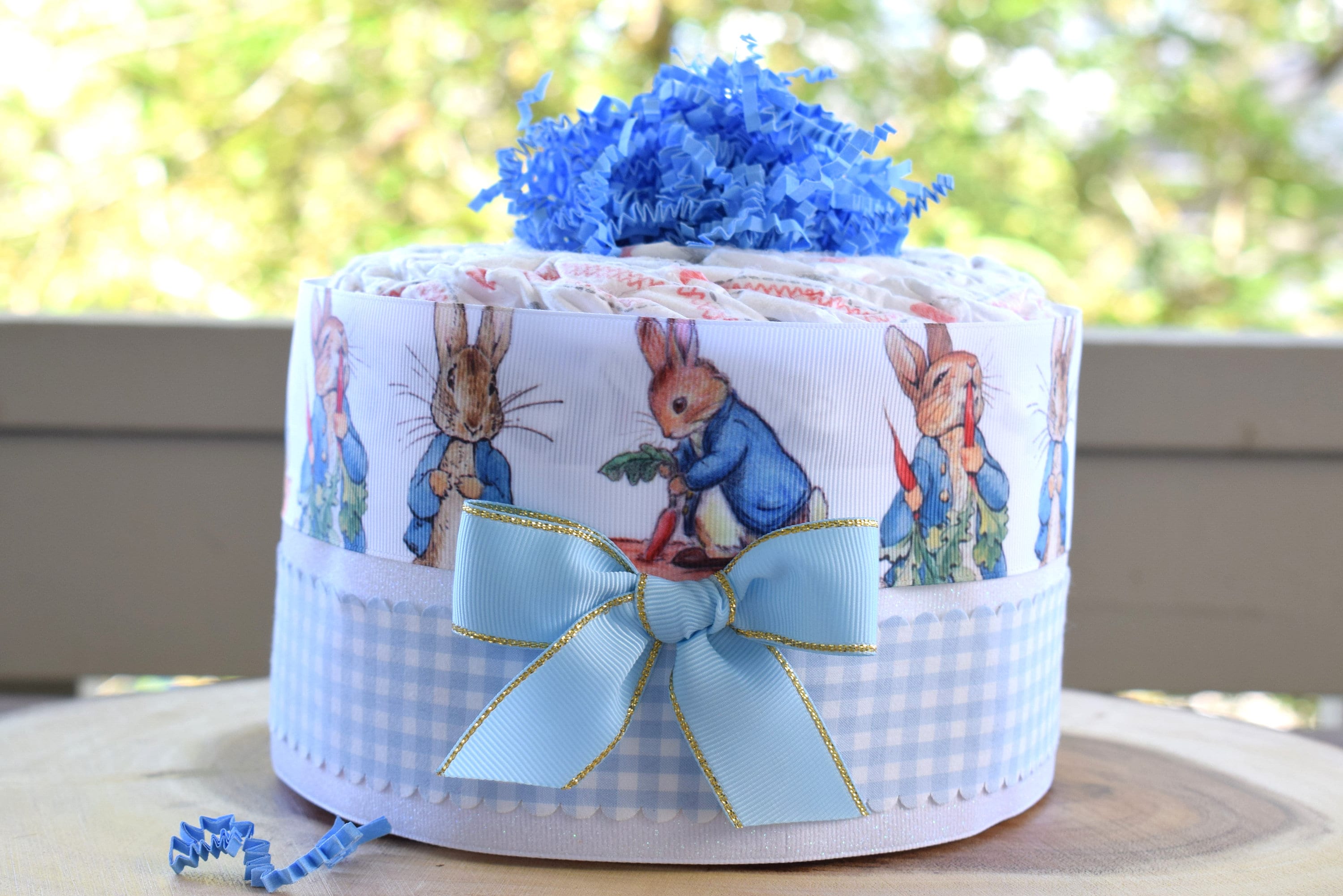 ❤ The diaper cake is designed with grosgrain ribbon, decorated in front with a bow and topped with crinkle paper.