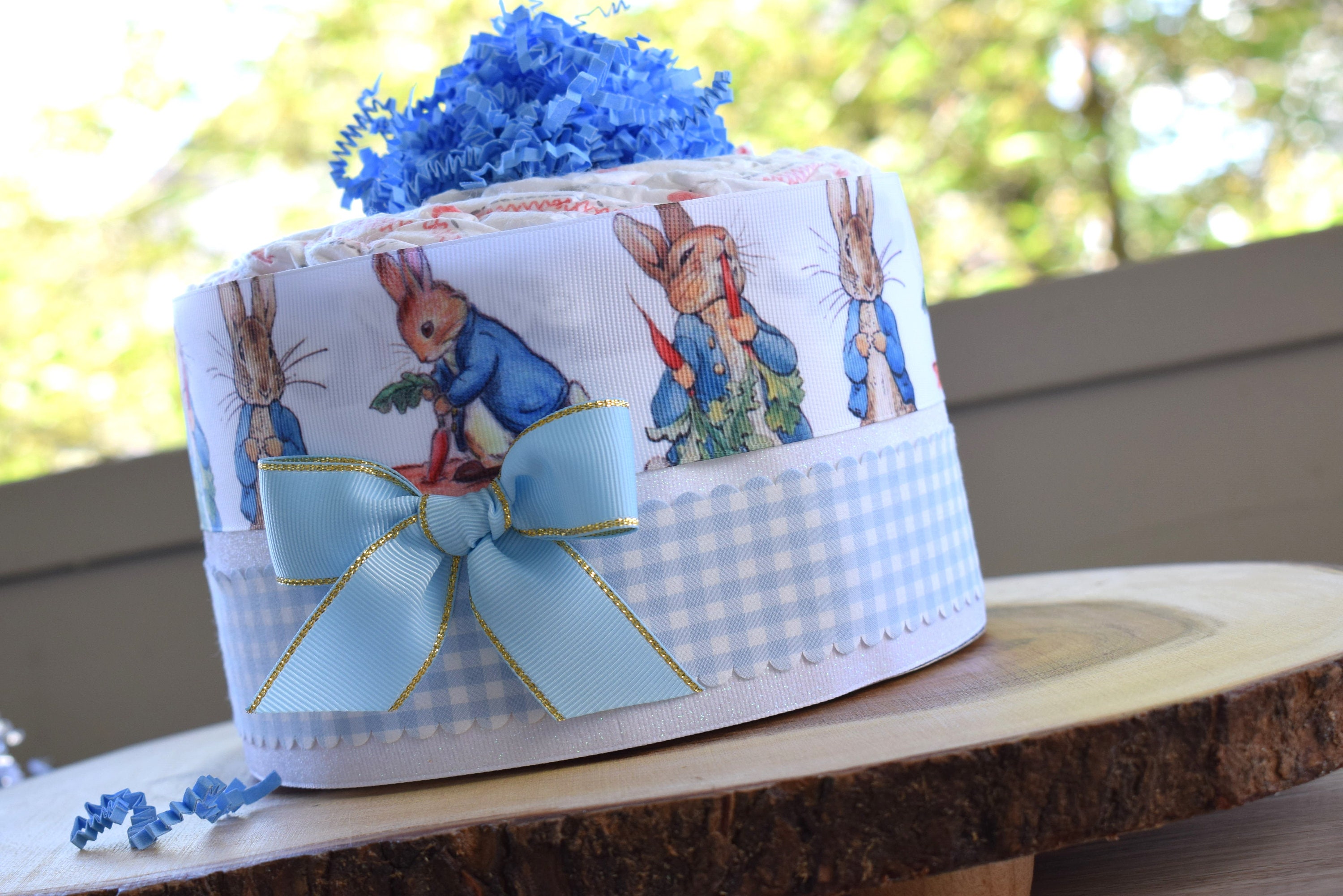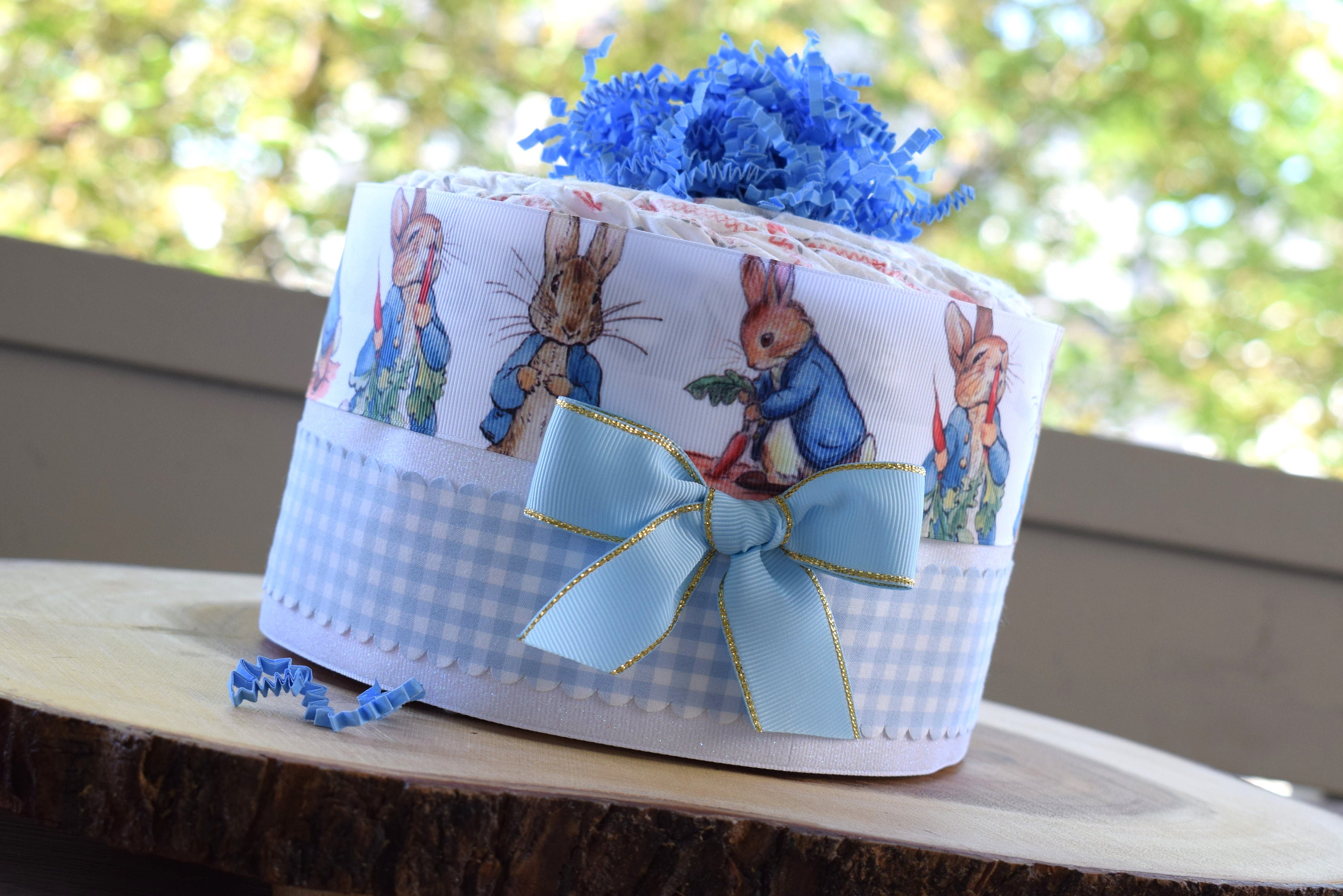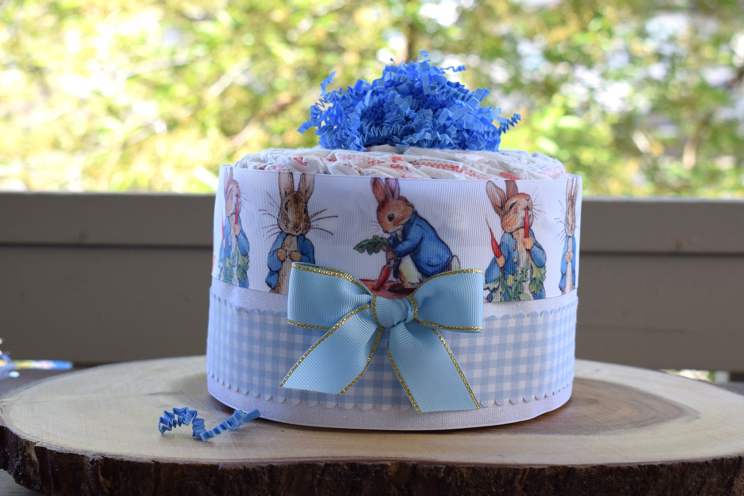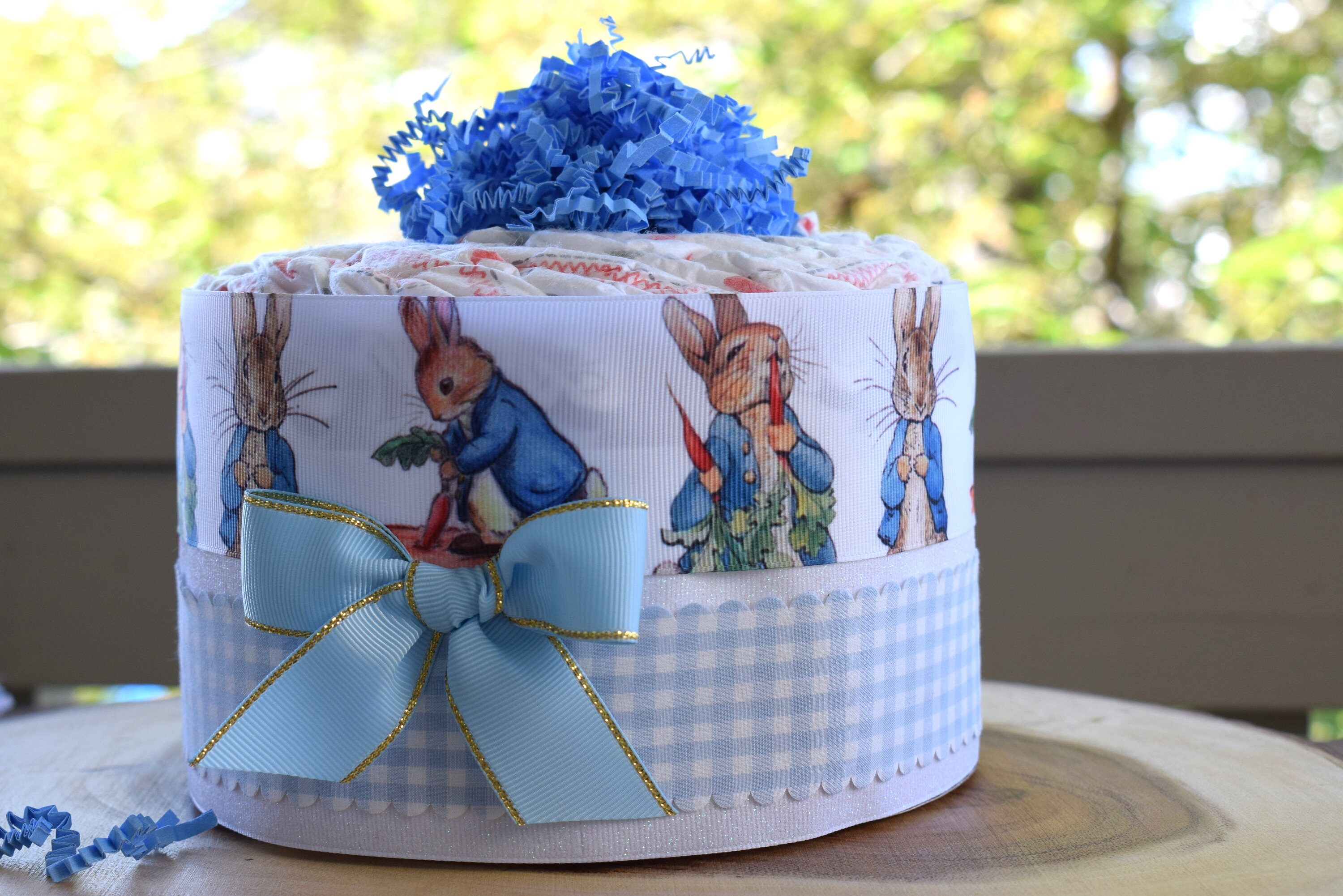 ❤ The diaper cake is designed with grosgrain ribbon, decorated in front with a bow and topped with crinkle paper.