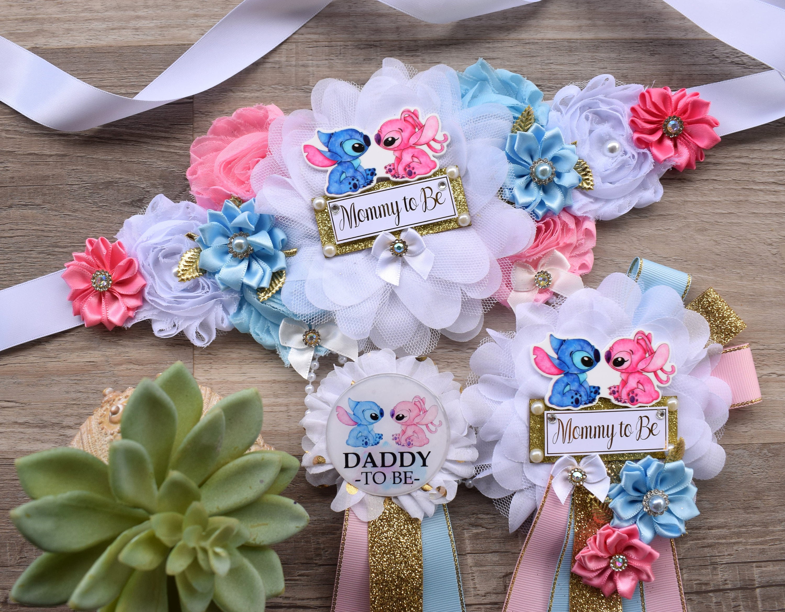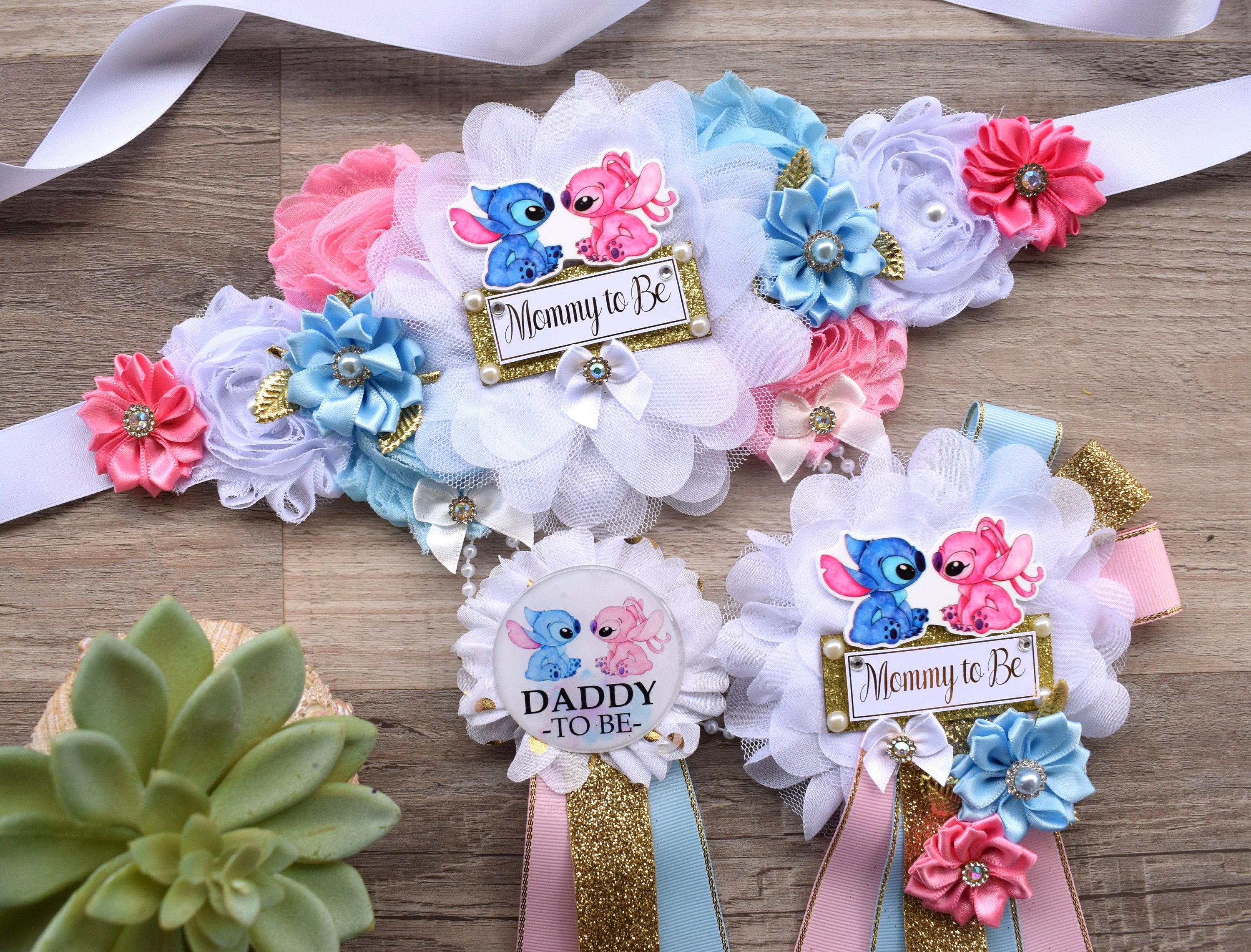 * Maternity Sash: This sash has eleven flowers in White,Gold, Blue & Pink colors embellished with rhinestones and pearls. The ribbon sash is 80'' (2 meters) long.