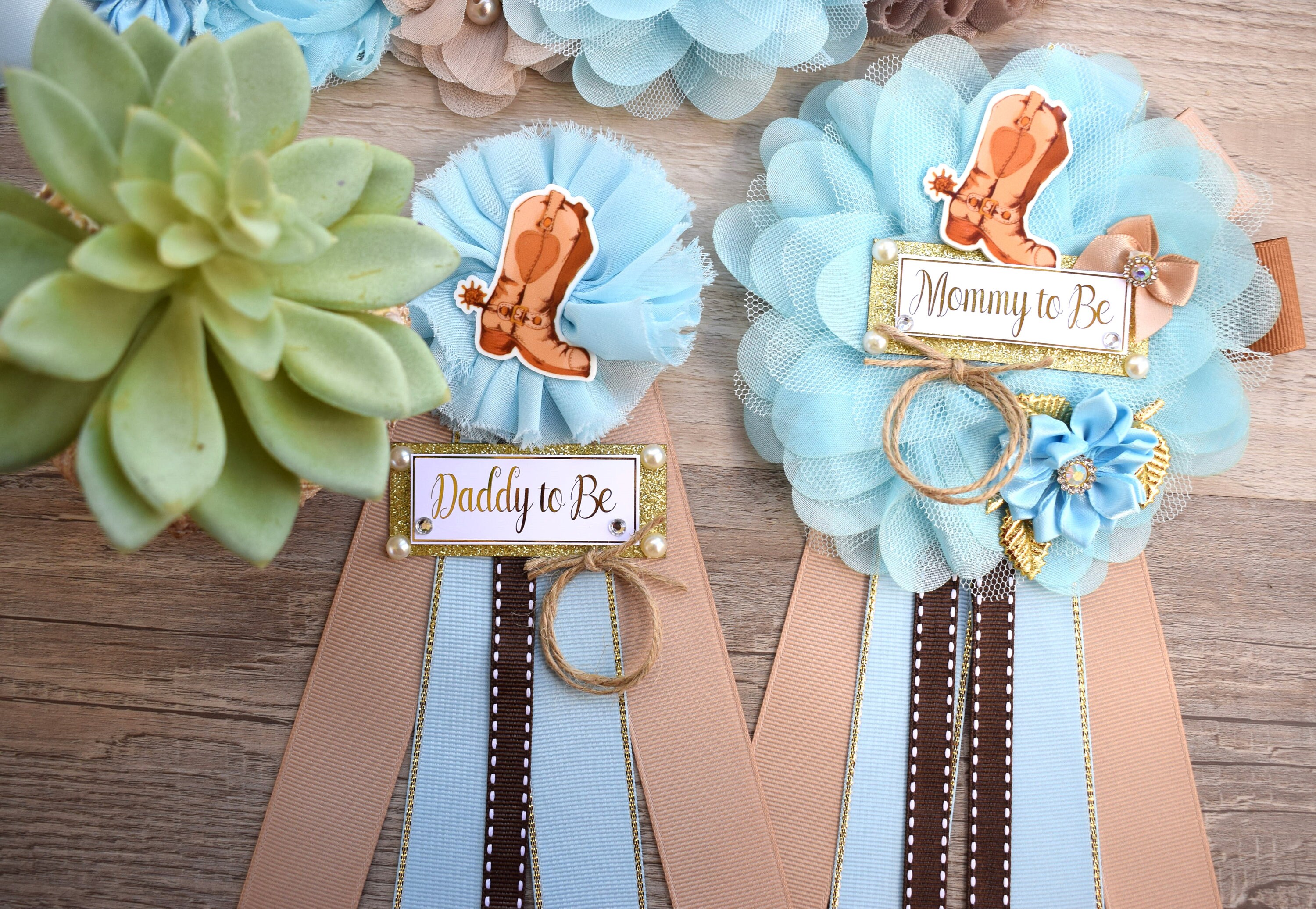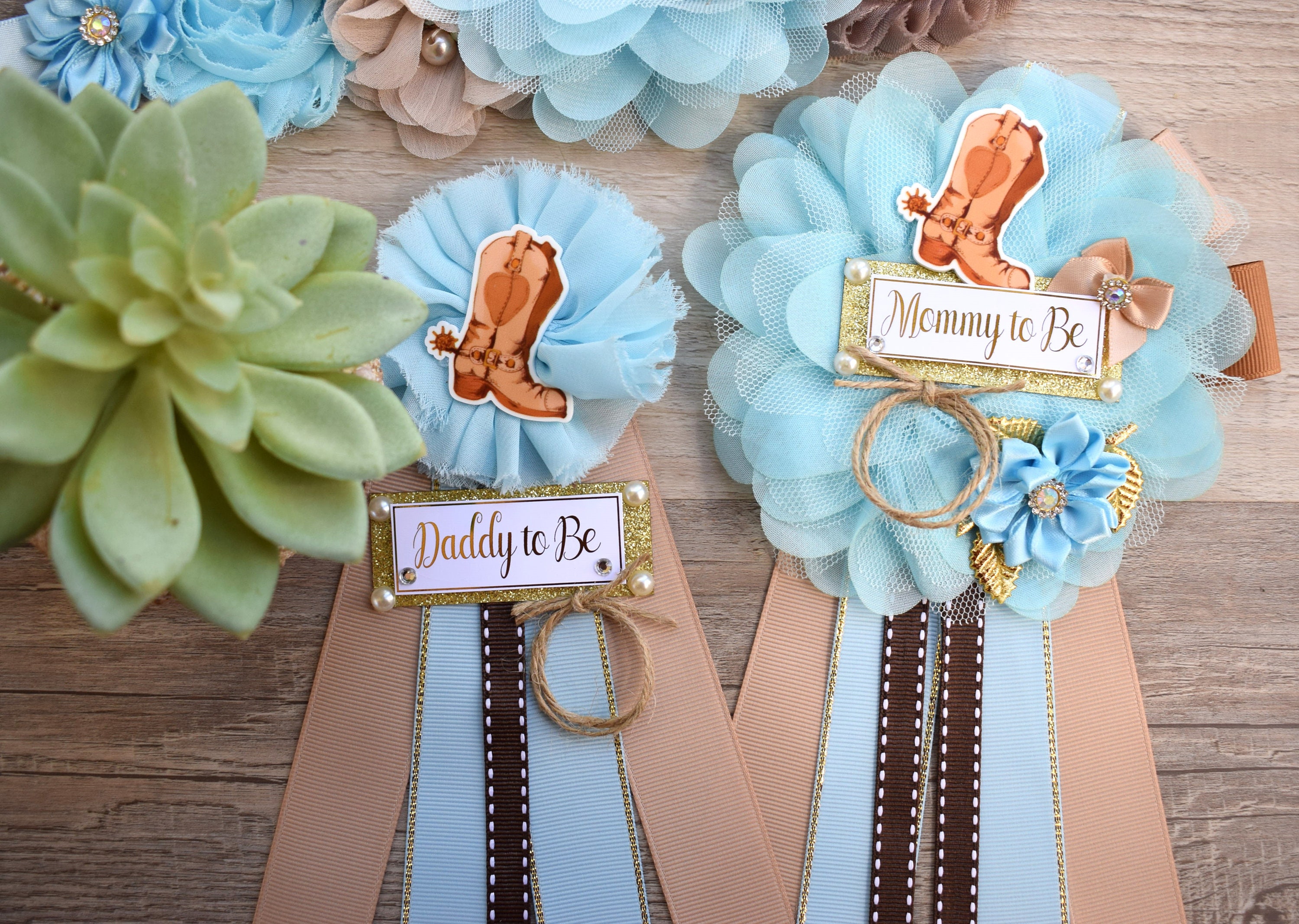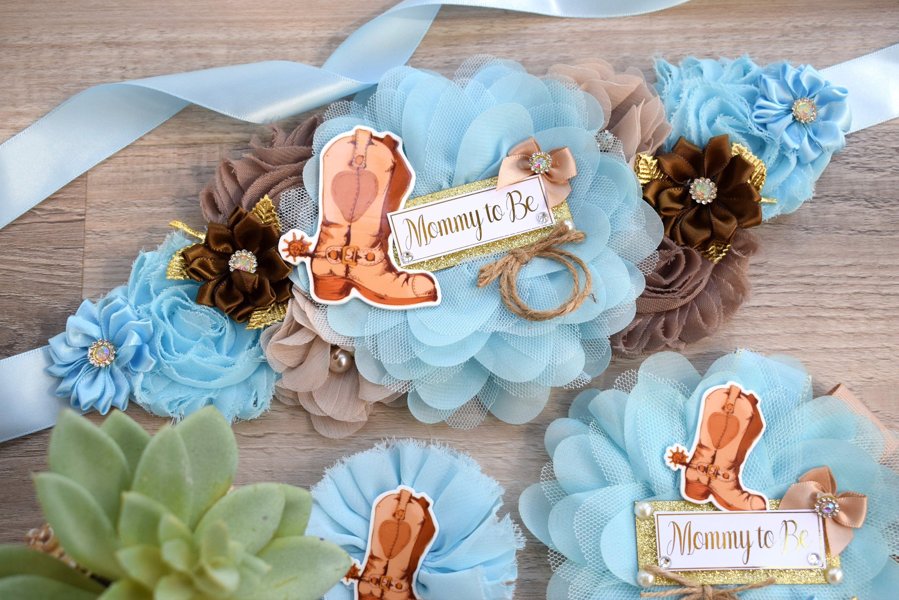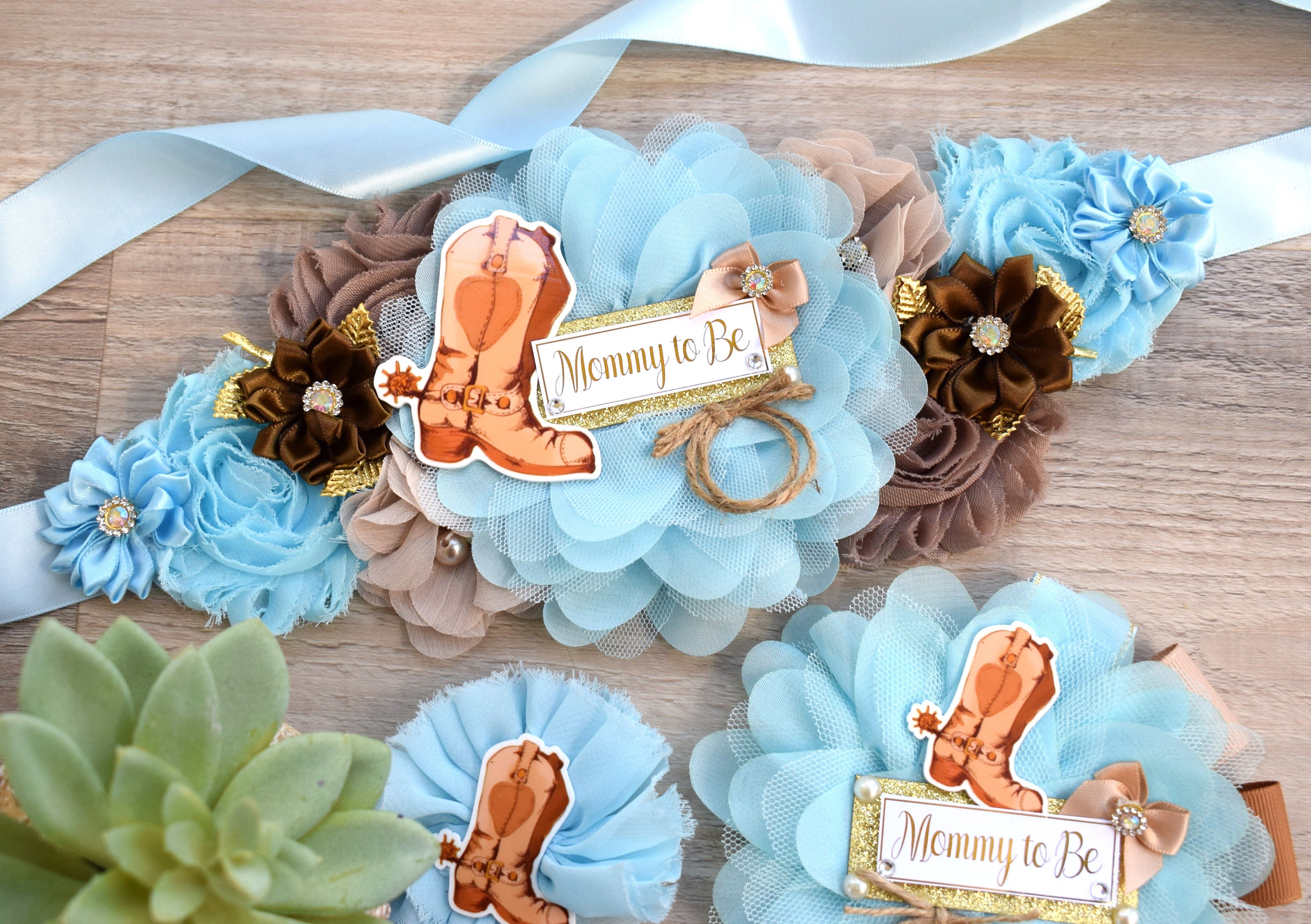 Cowboy Baby Shower, Blue Cowboy Maternity Sash, Boy Cowboy Mommy and Daddy To Be Pin, Blue Brown Flower Sash, Blue Boot Hat Corsage Pin