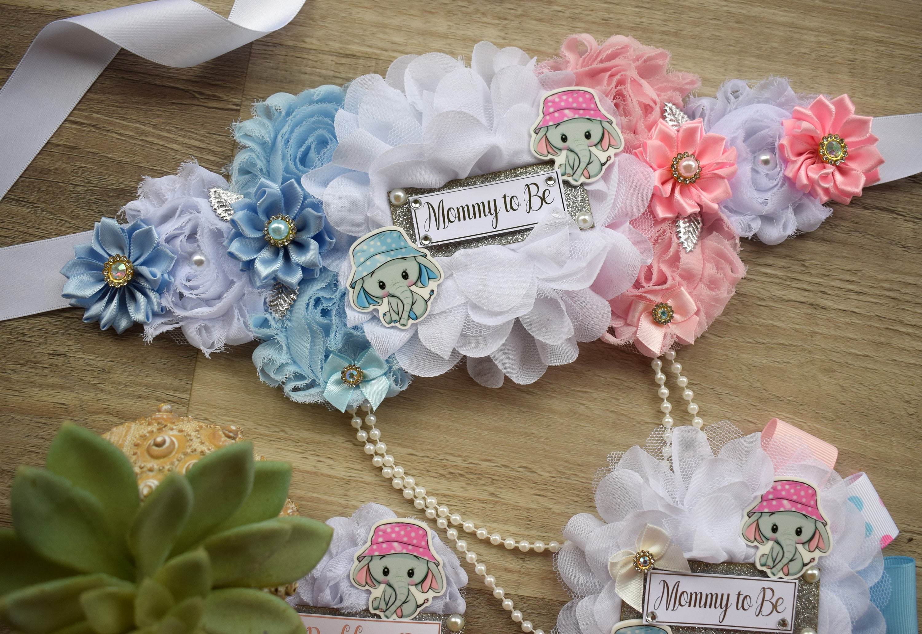 * Maternity Sash: It has eleven beautiful flowers in Pink, Blue & White colors embellished with rhinestones and pearls. The ribbon sash is 80'' (2 meters) long.