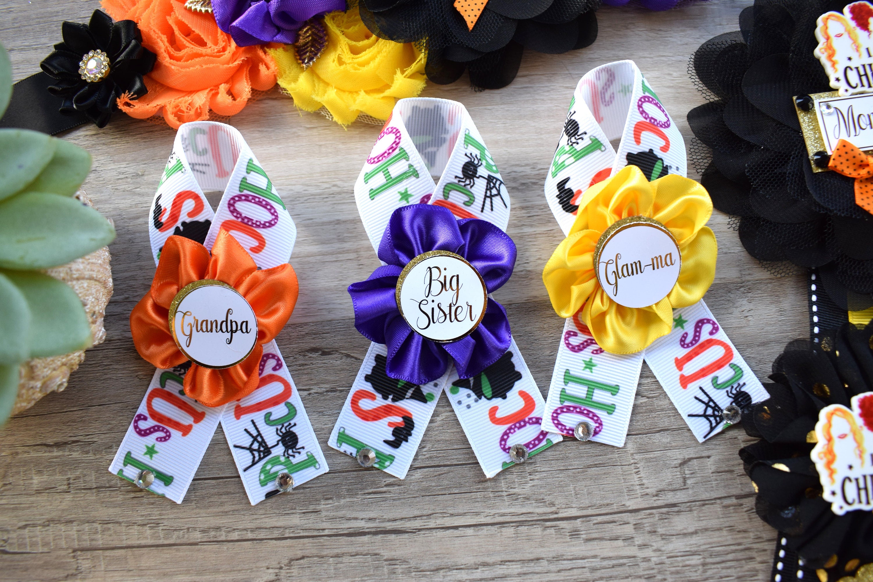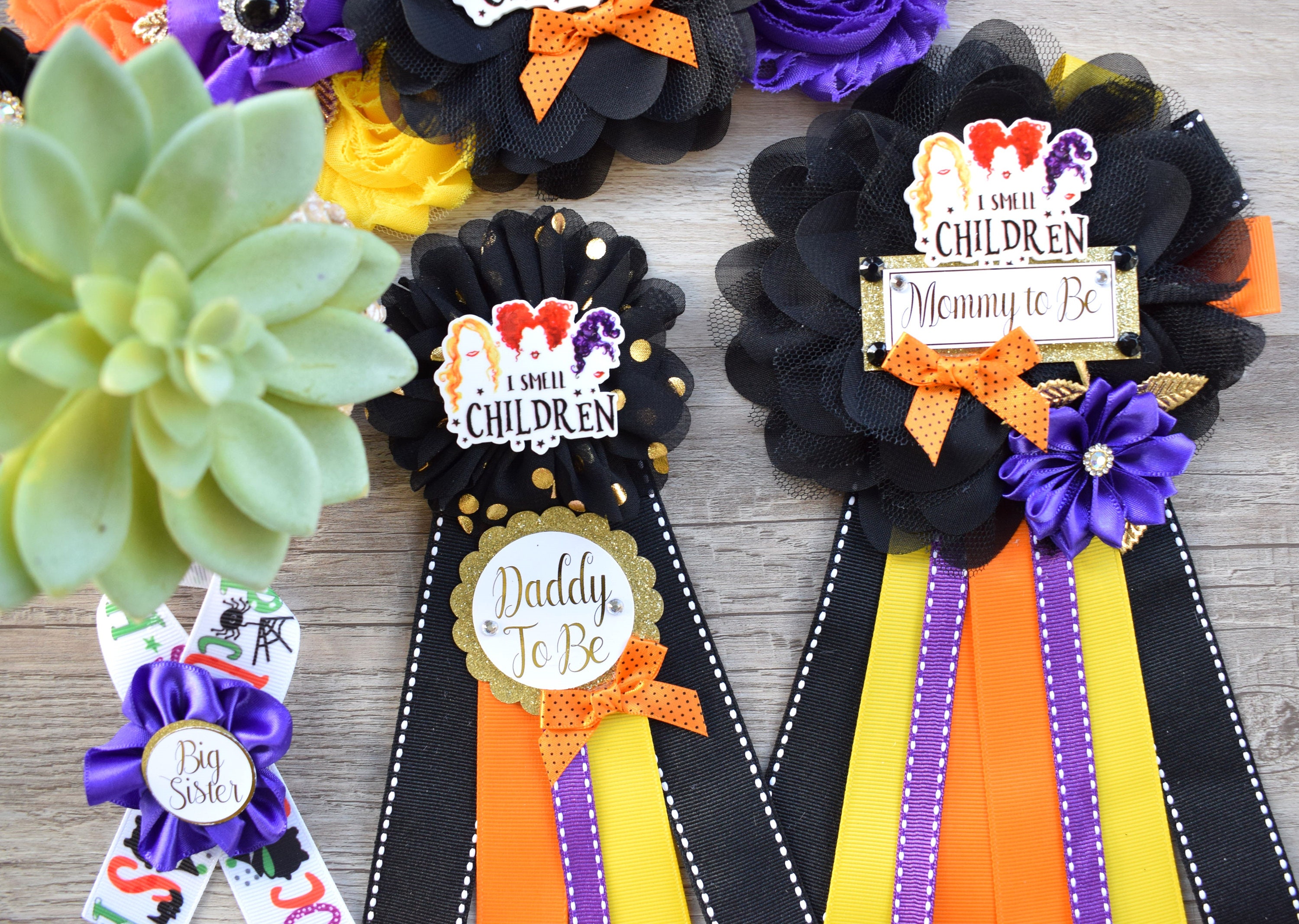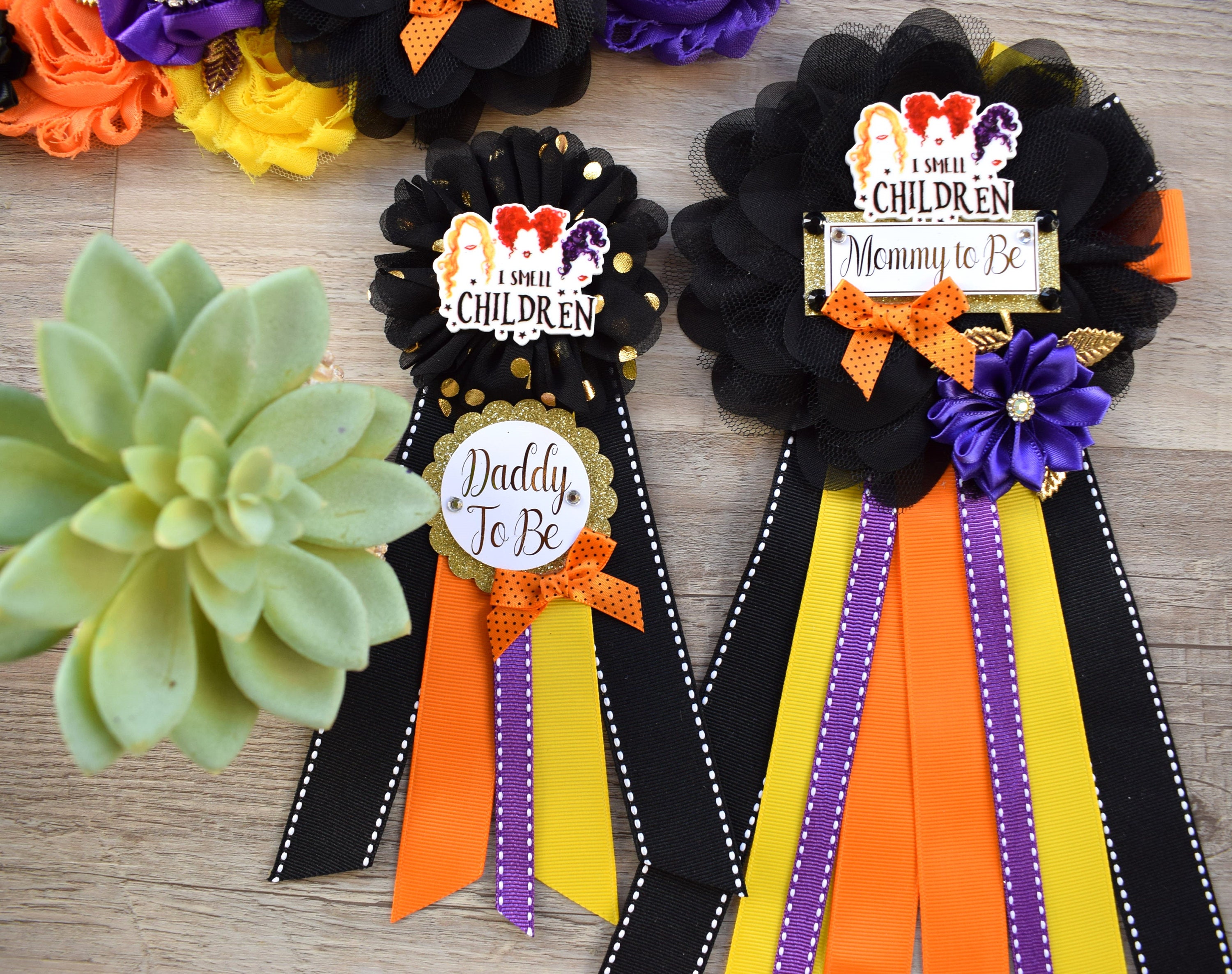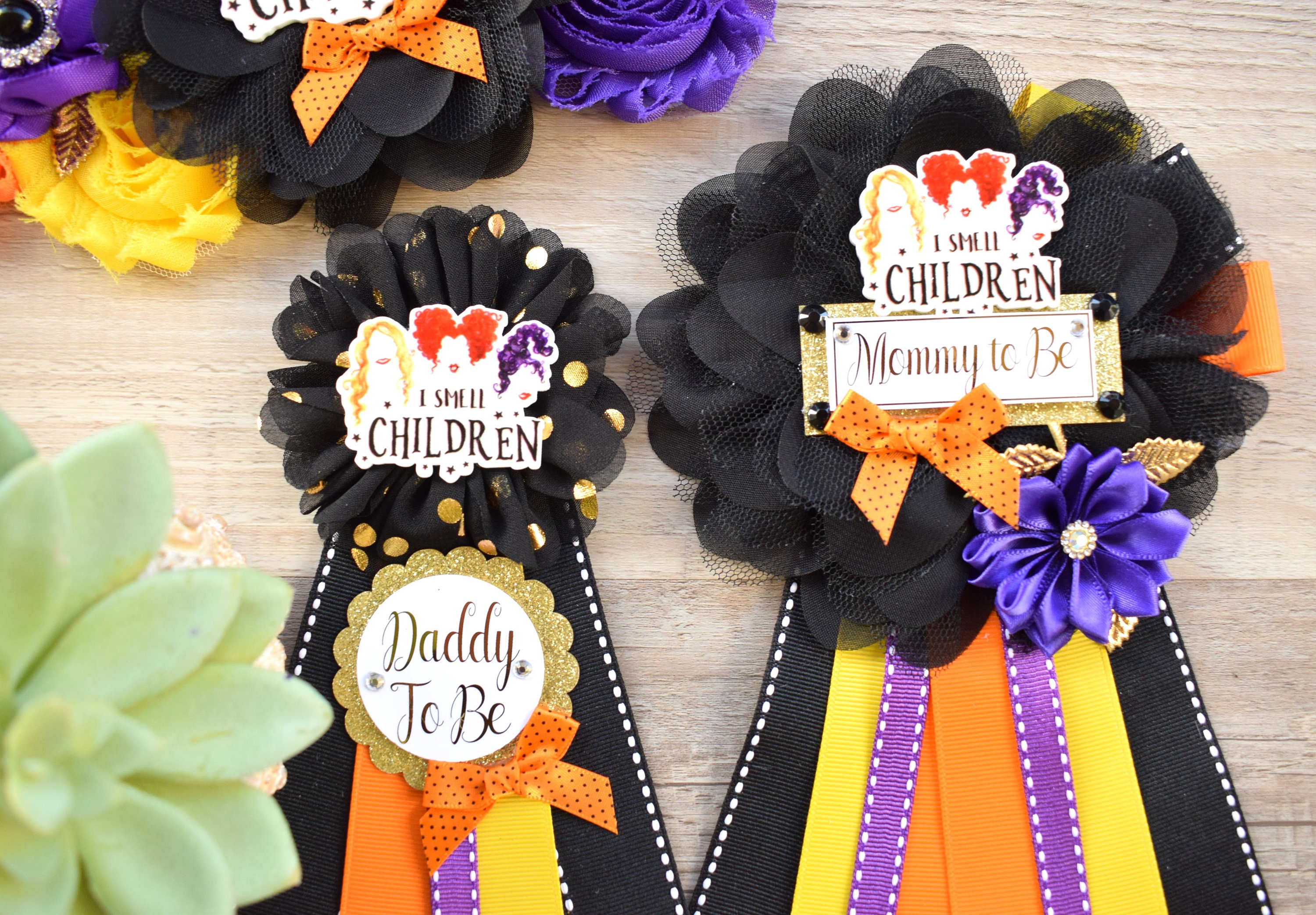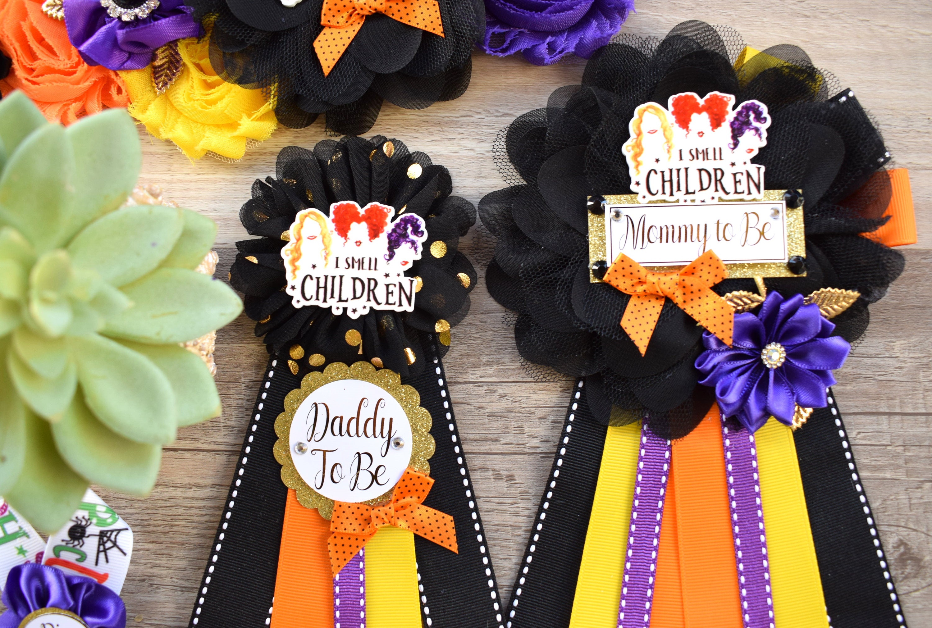 Halloween Baby Shower, Comedy/Horror Halloween Baby Shower, Mommy To Be Ribbon, Daddy To Be Pin, Baby Shower Gift