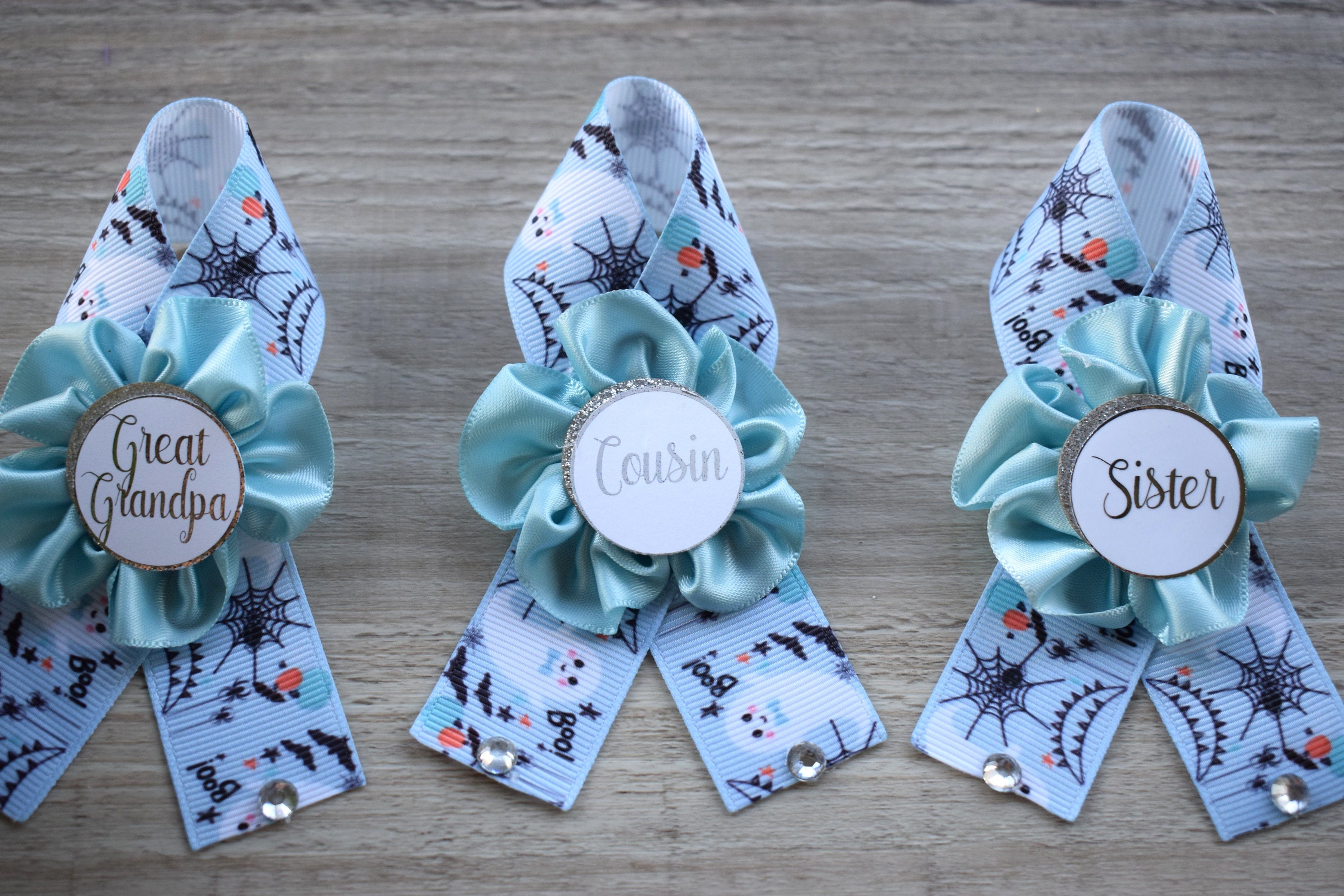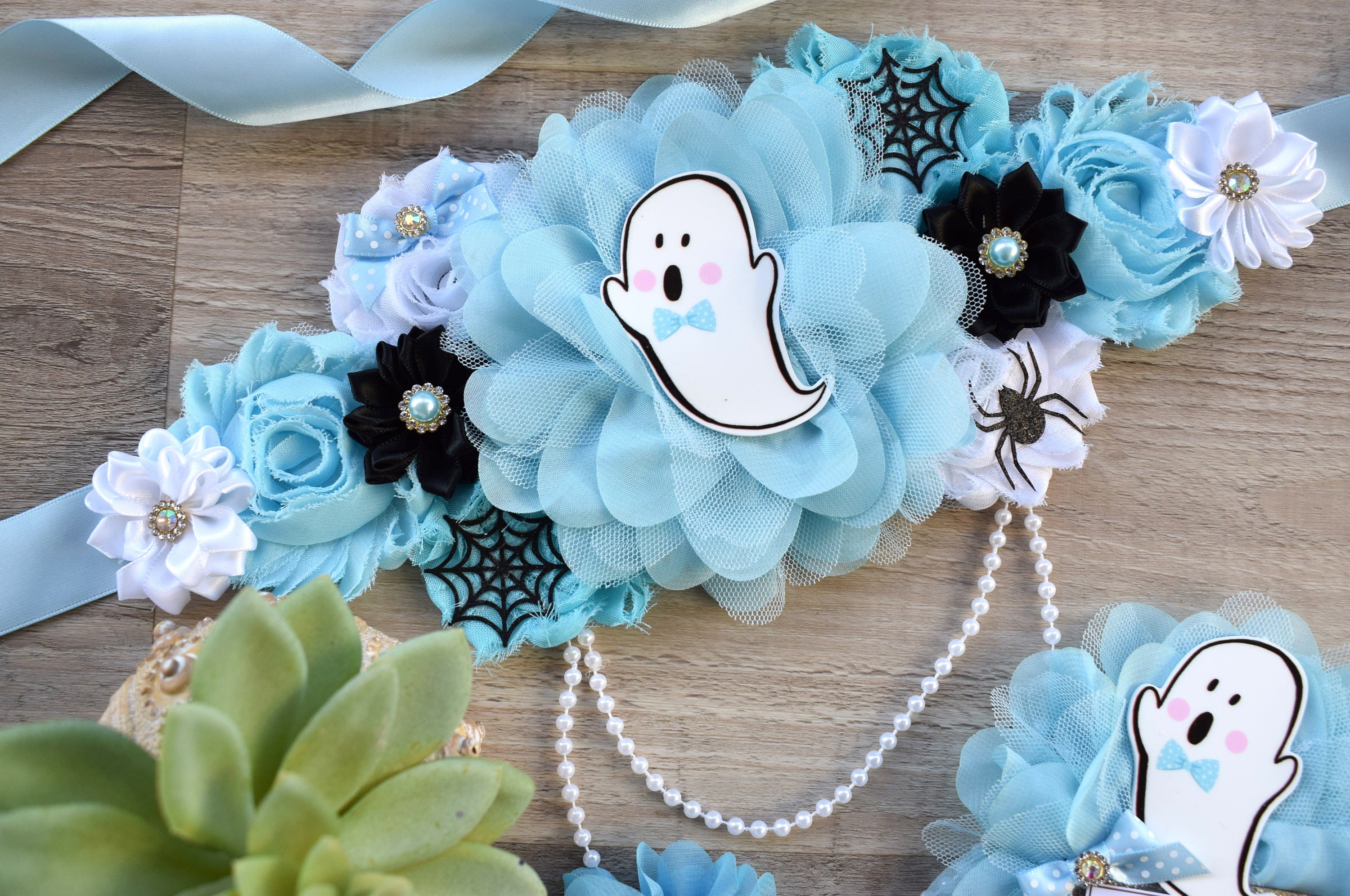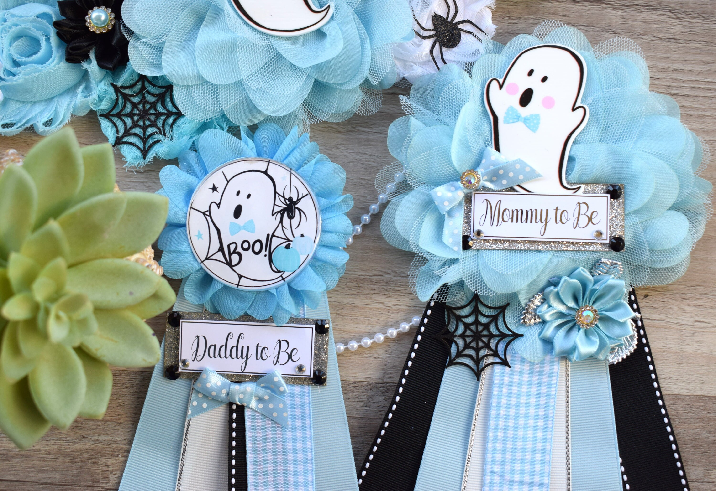 Boy Blue Ghost Halloween Baby Shower, Blue Maternity Sash, Mommy To Be Ribbon, Daddy To Be Pin, Halloween Baby Shower Gift, Custom